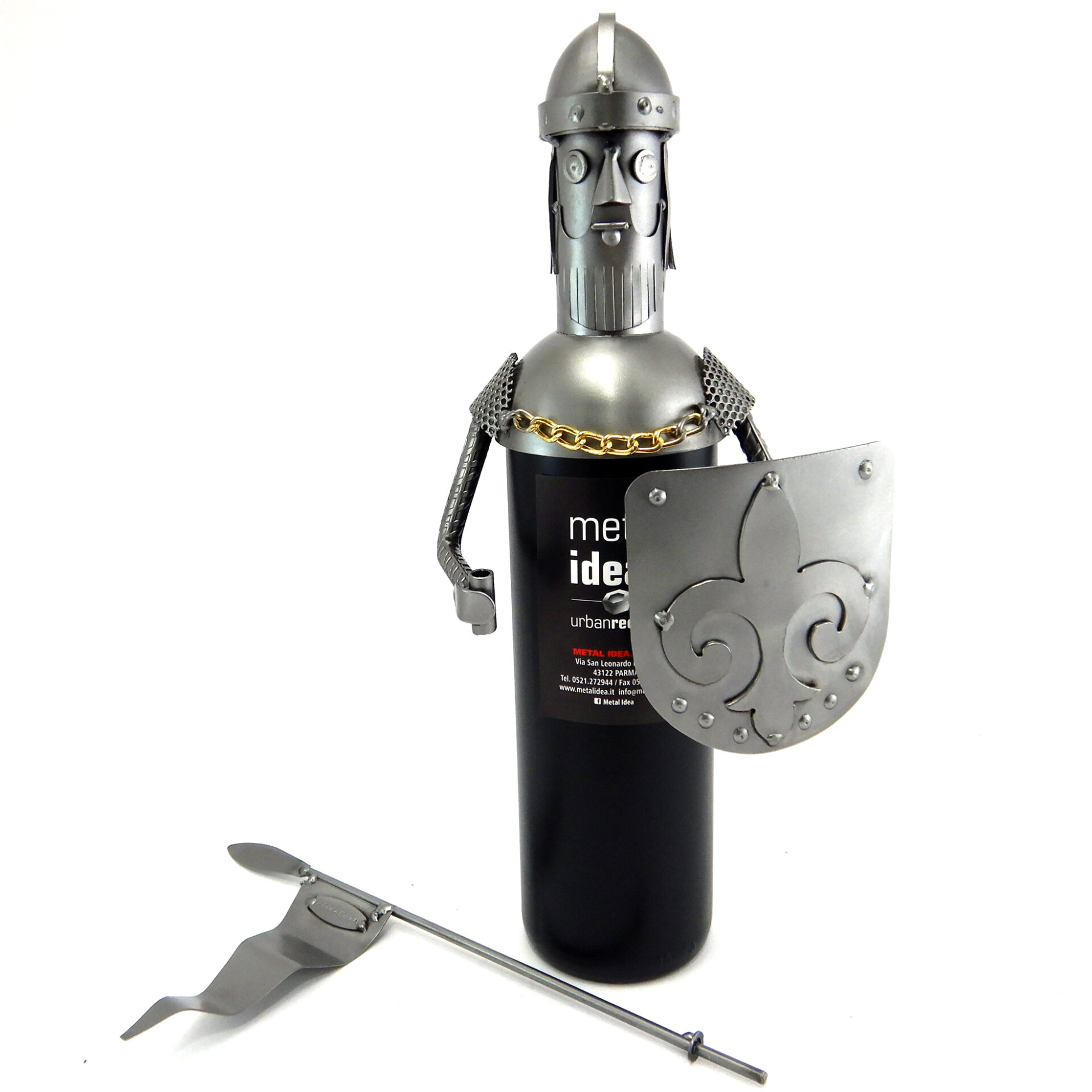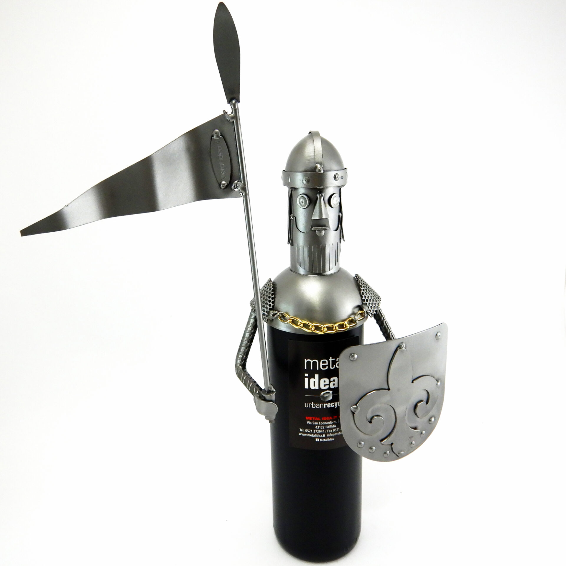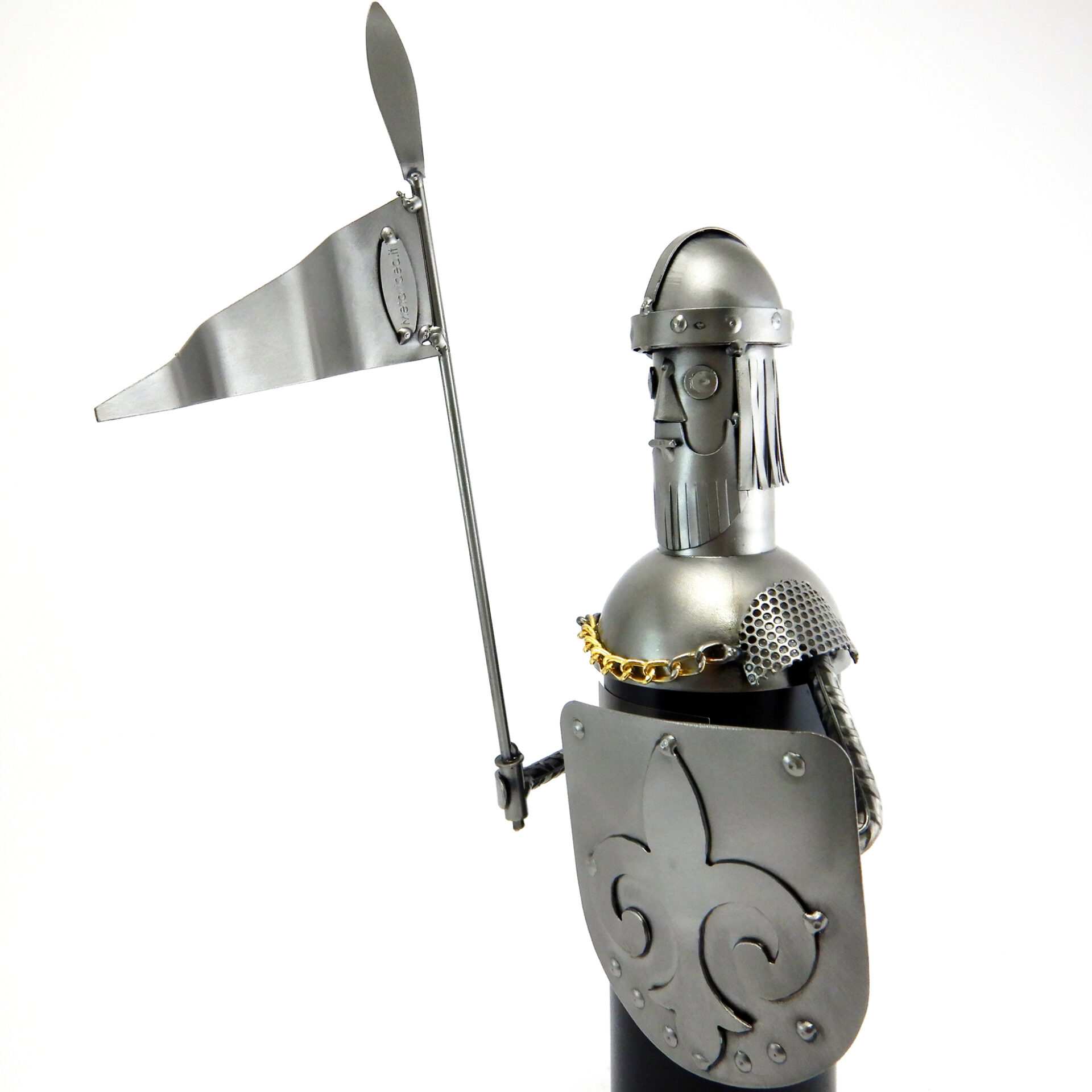 HANDMADE METAL SCULPTURE DECORATIVE COVER FOR BOTTLE DEPICTING KNIGHT’S ARMOR WITH STANDARD AND SHIELD