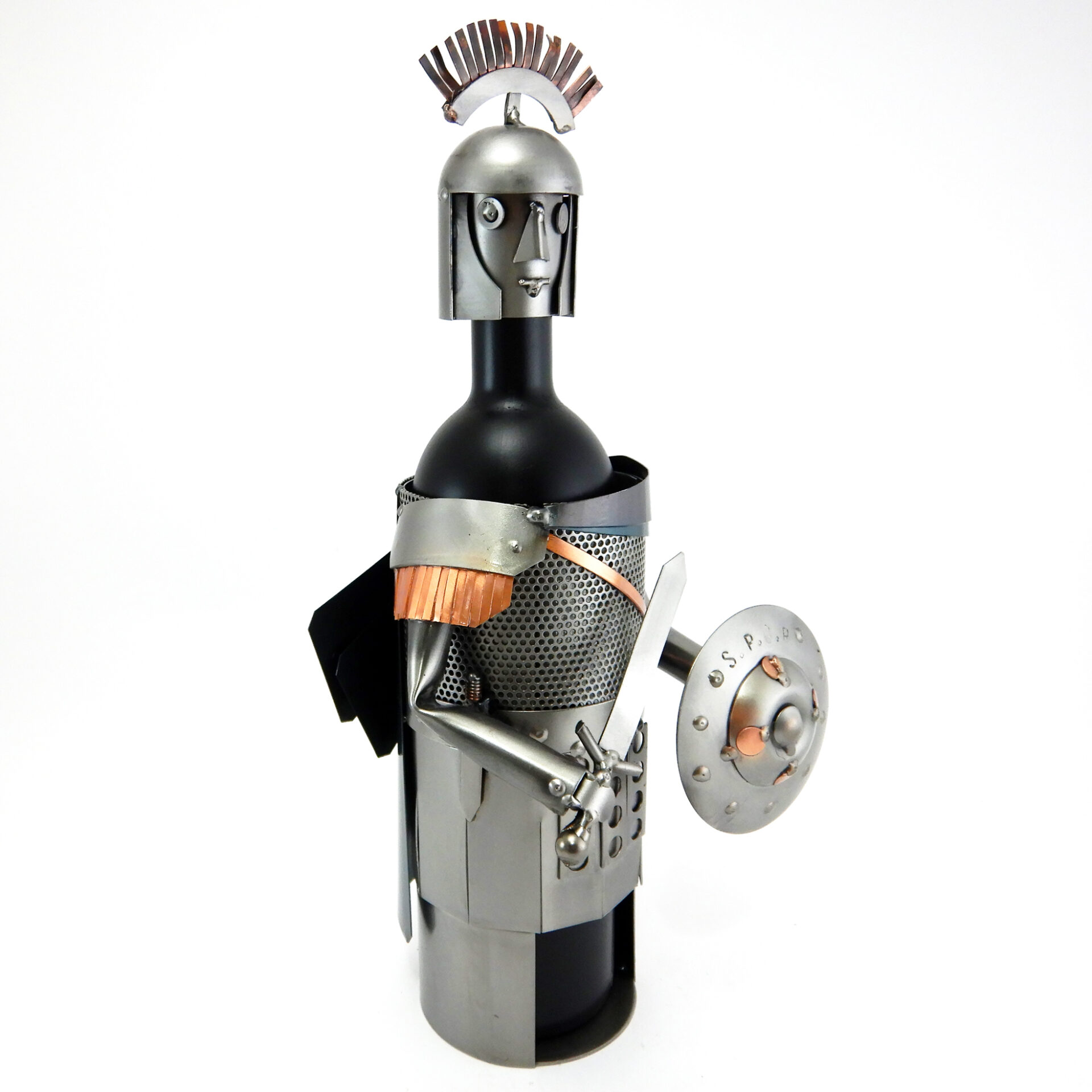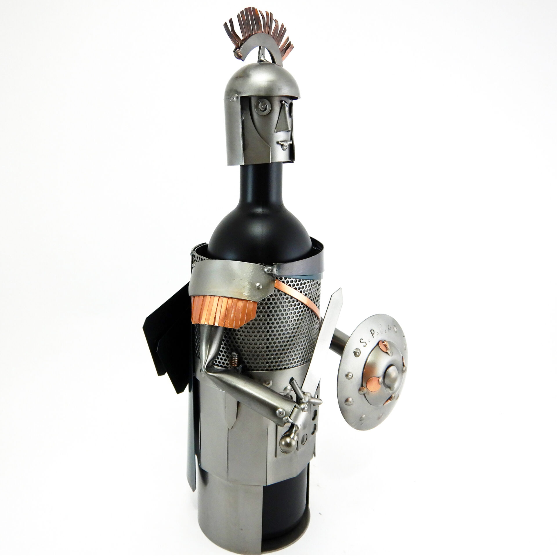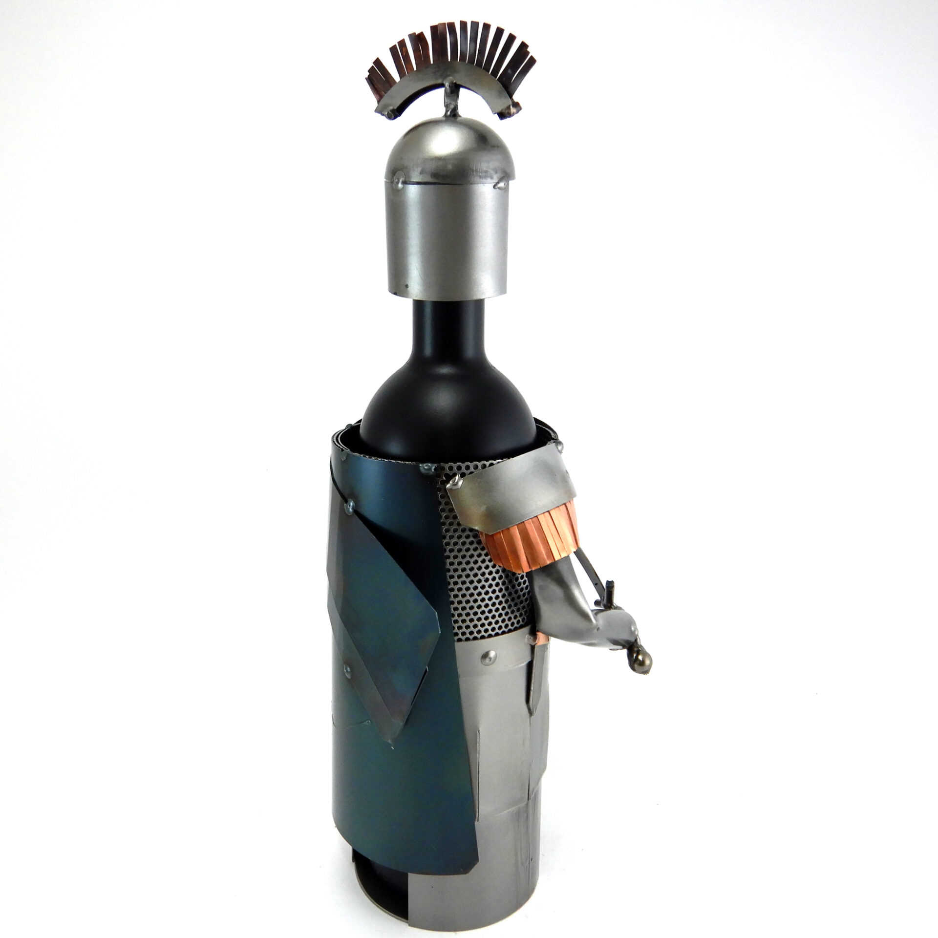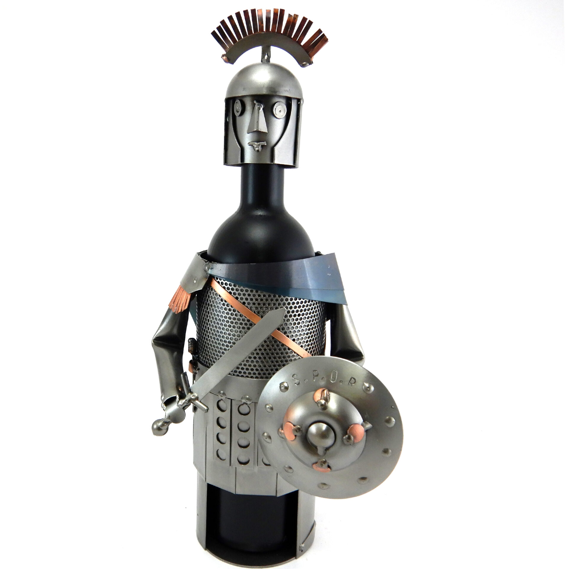 SCULTURA IN METALLO ARTIGIANALE PORTA BOTTIGLIA RAFFIGURANTE ARMATURA DEL CENTURIONE ROMANO CON SPADA, SCUDO ROTONDO E INSERTI IN RAME.