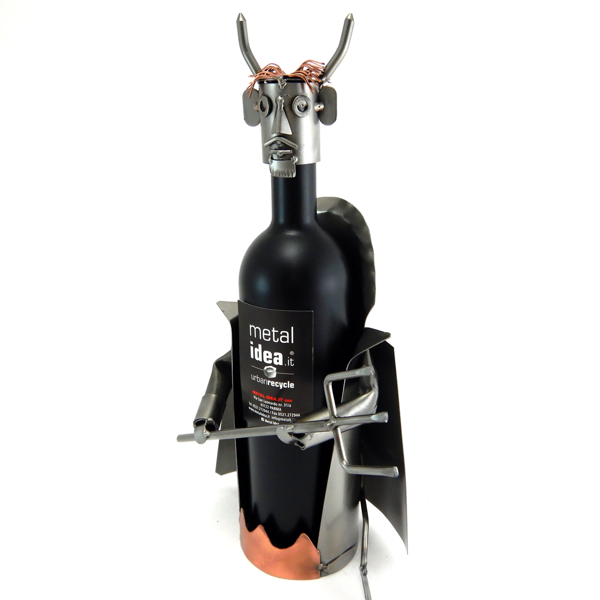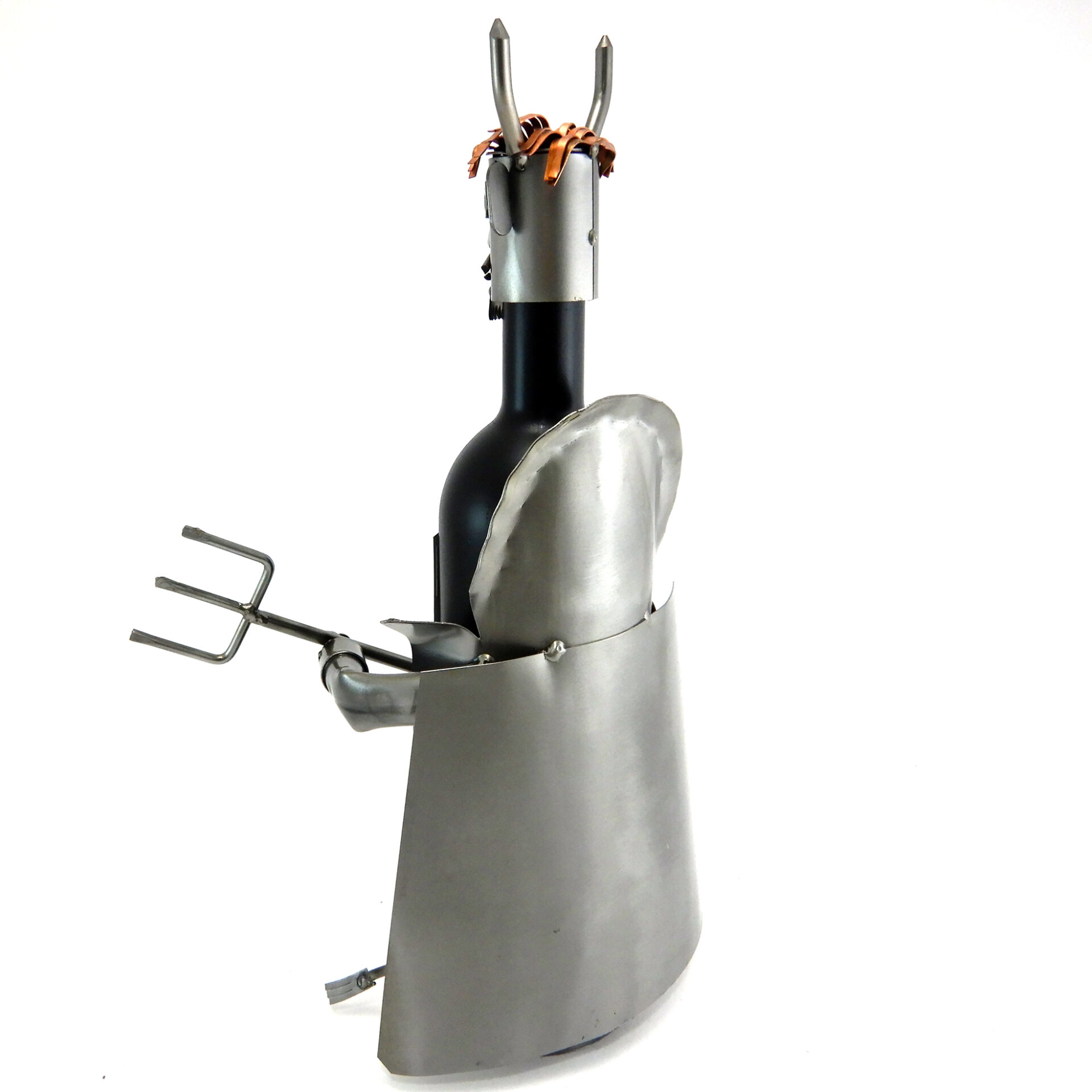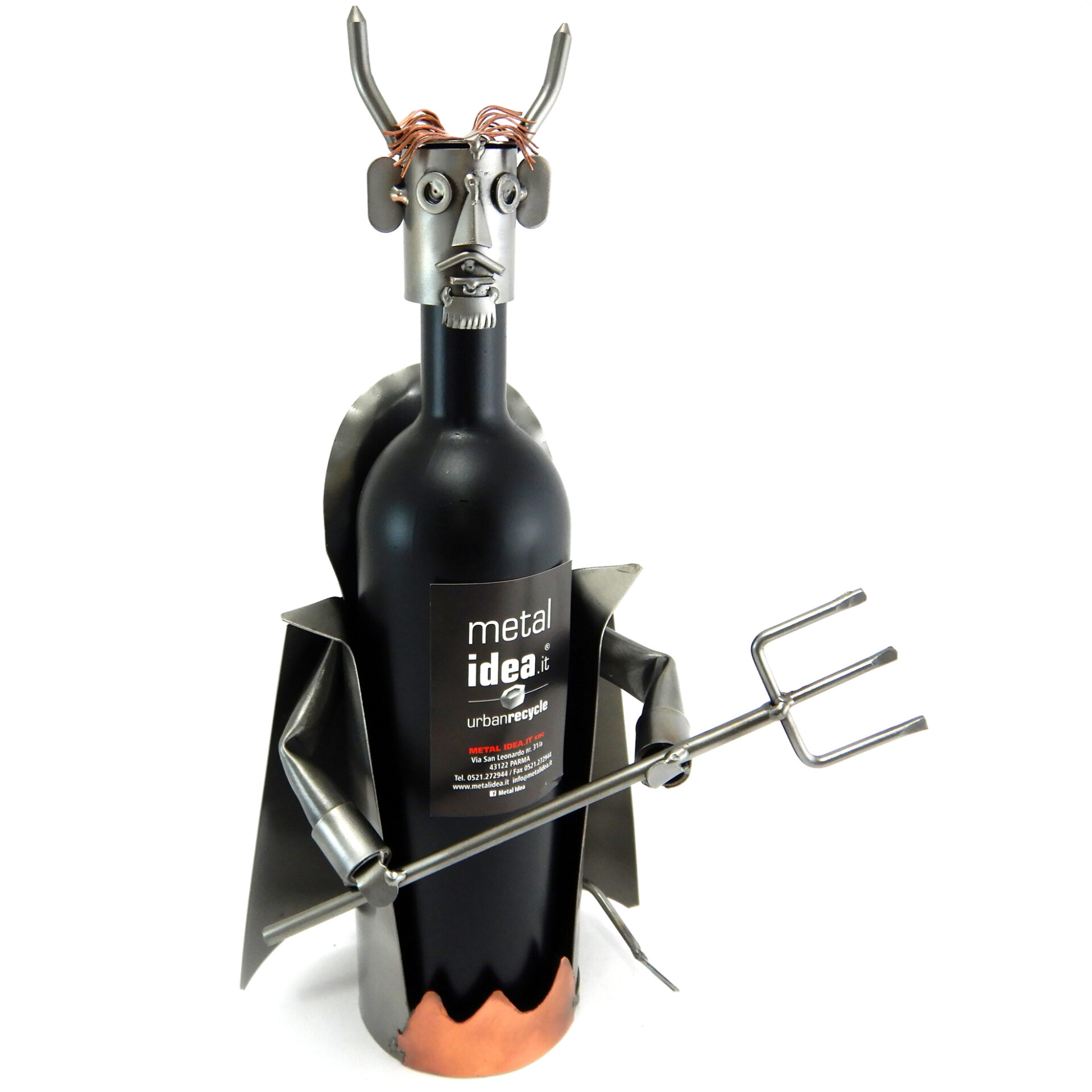 SCULTURA IN METALLO ARTIGIANALE PORTA BOTTIGLIA RAFFIGURANTE IL DIAVOLO CON MANTELLO, FORCONE E INSERTI IN RAME.