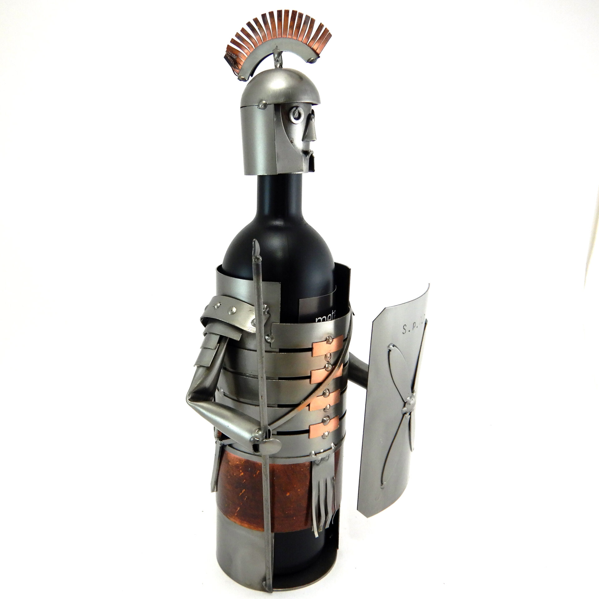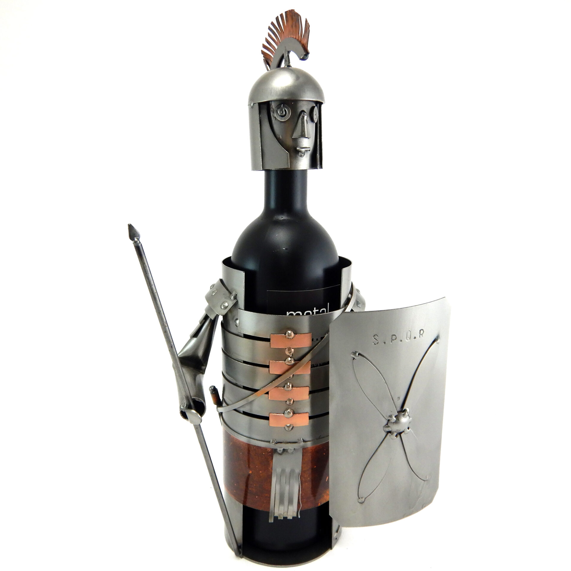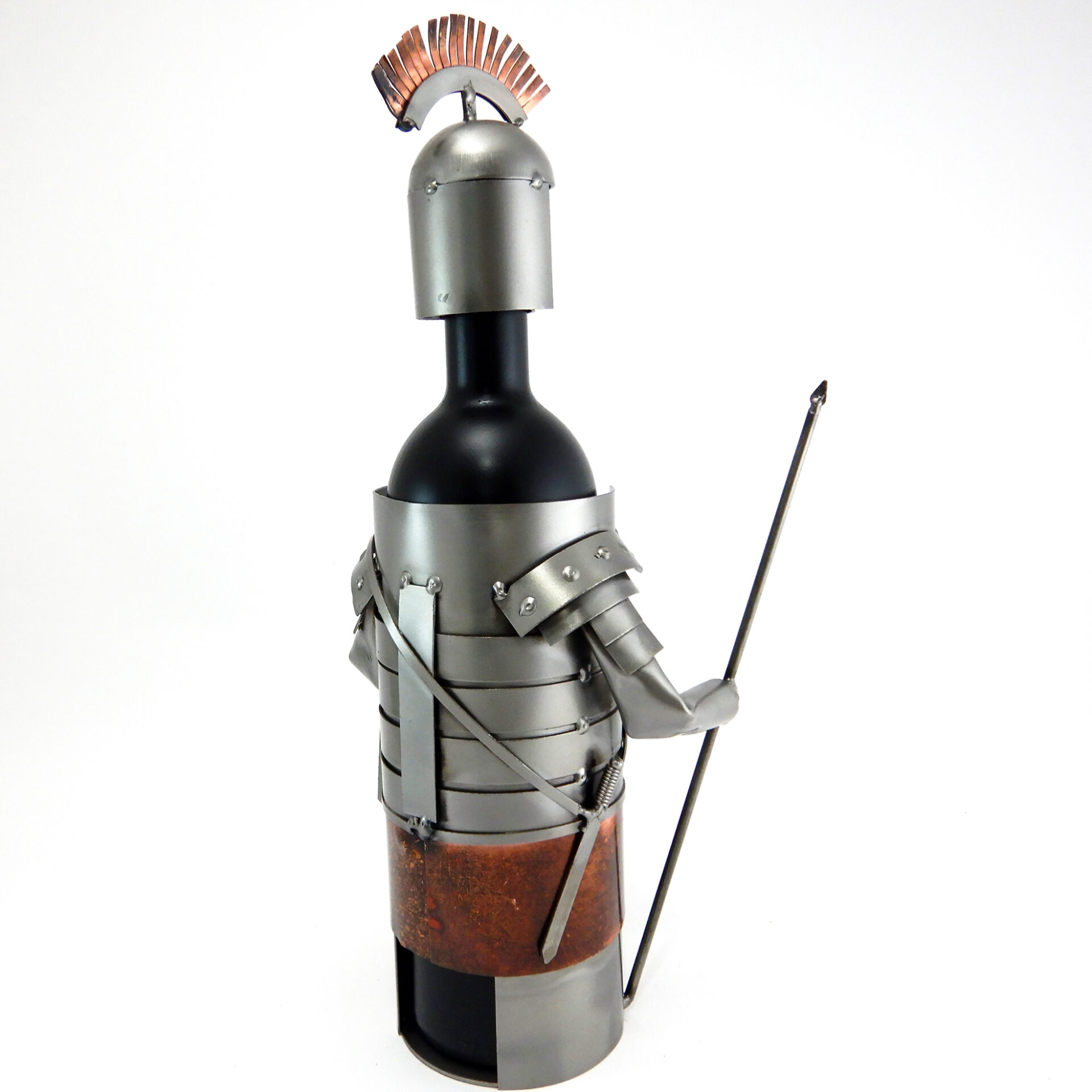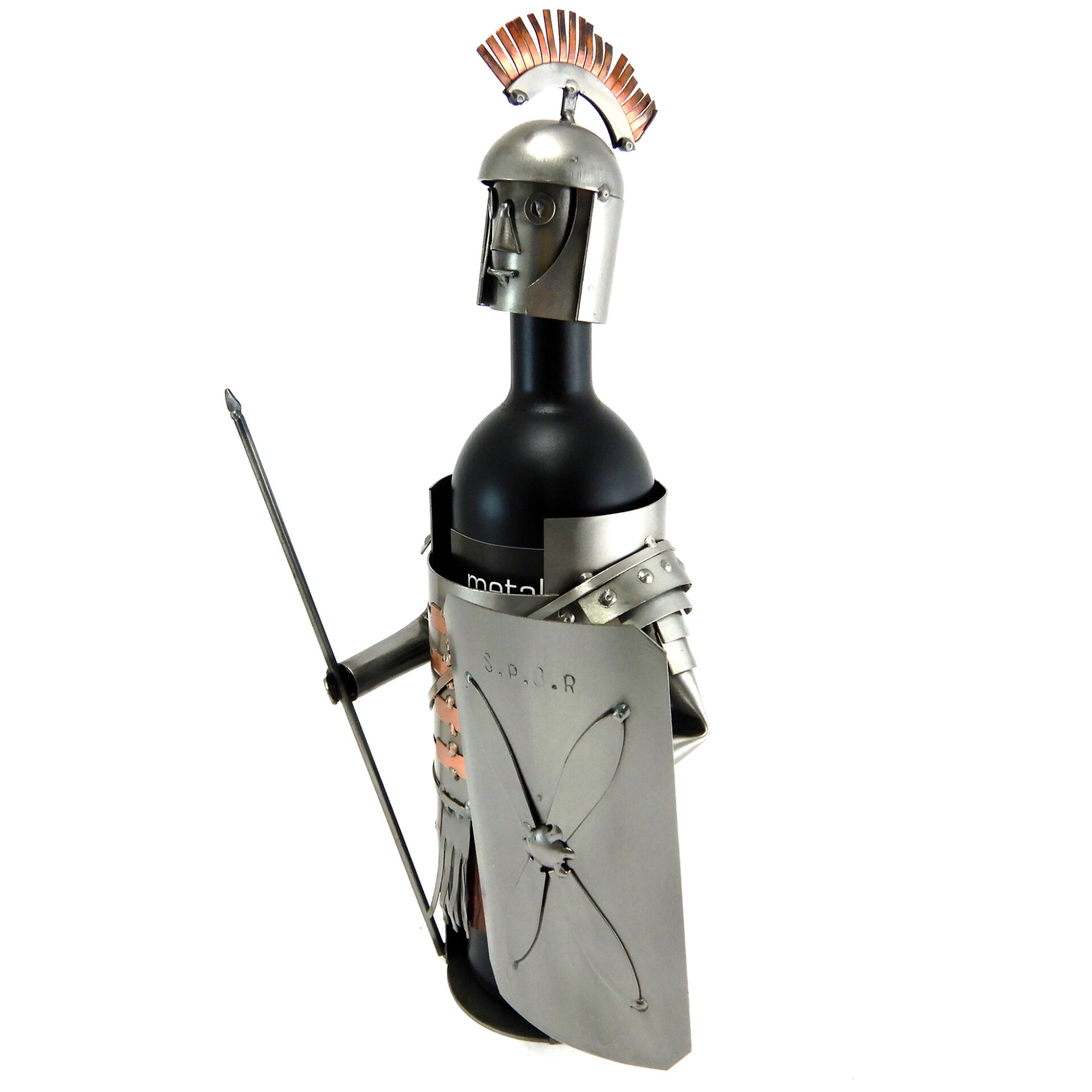 SCULTURA IN METALLO ARTIGIANALE PORTA BOTTIGLIA RAFFIGURANTE ARMATURA DEL GUERRIERO ROMANO CON LANCIA, SCUDO E INSERTI IN RAME.