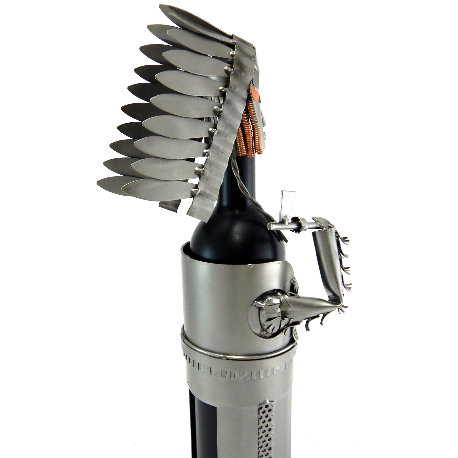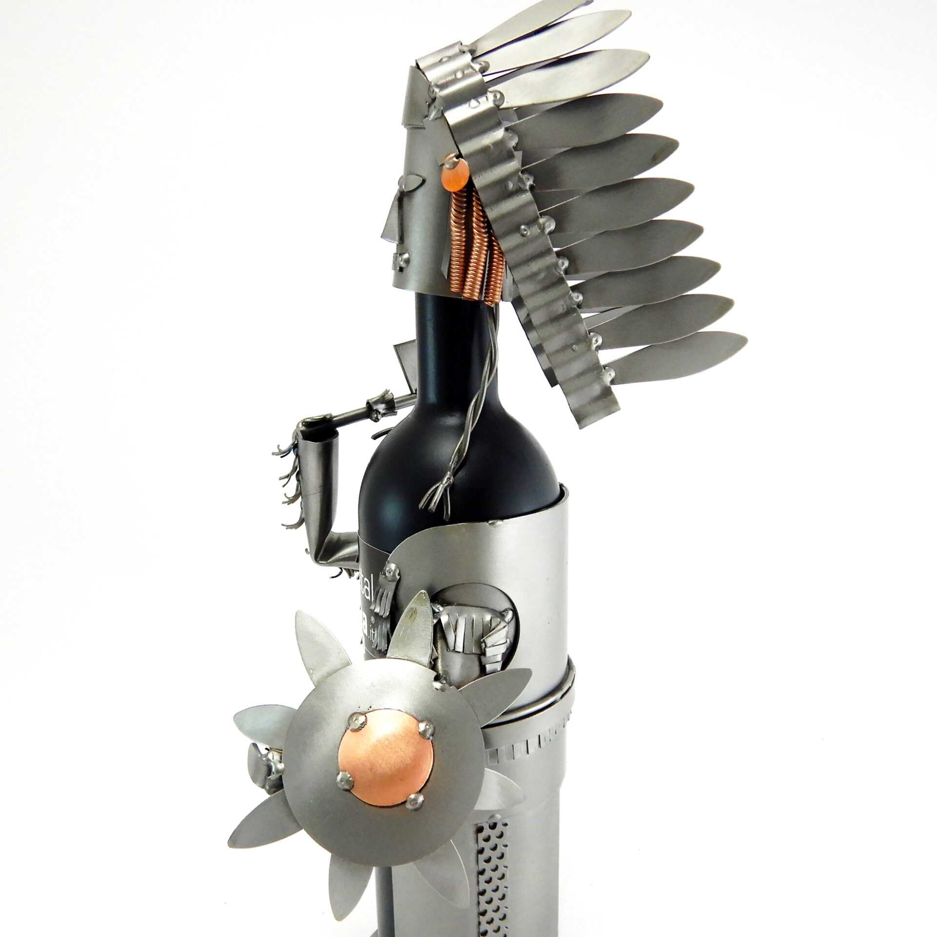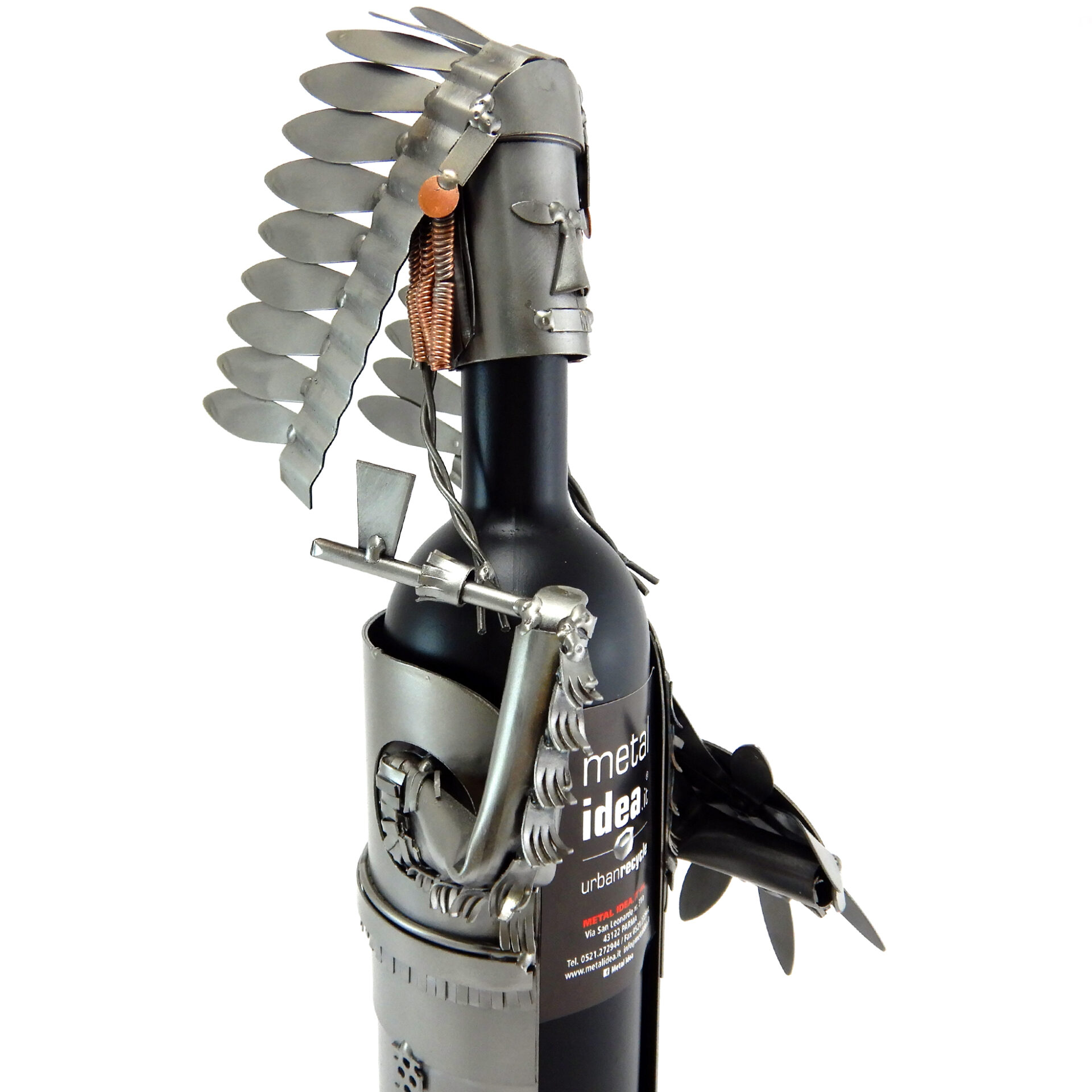 SCULTURA IN METALLO ARTIGIANALE PORTA BOTTIGLIA RAFFIGURANTE L’INDIANO CON L’ASCIA, SCUDO, EINSERTI IN RAME.