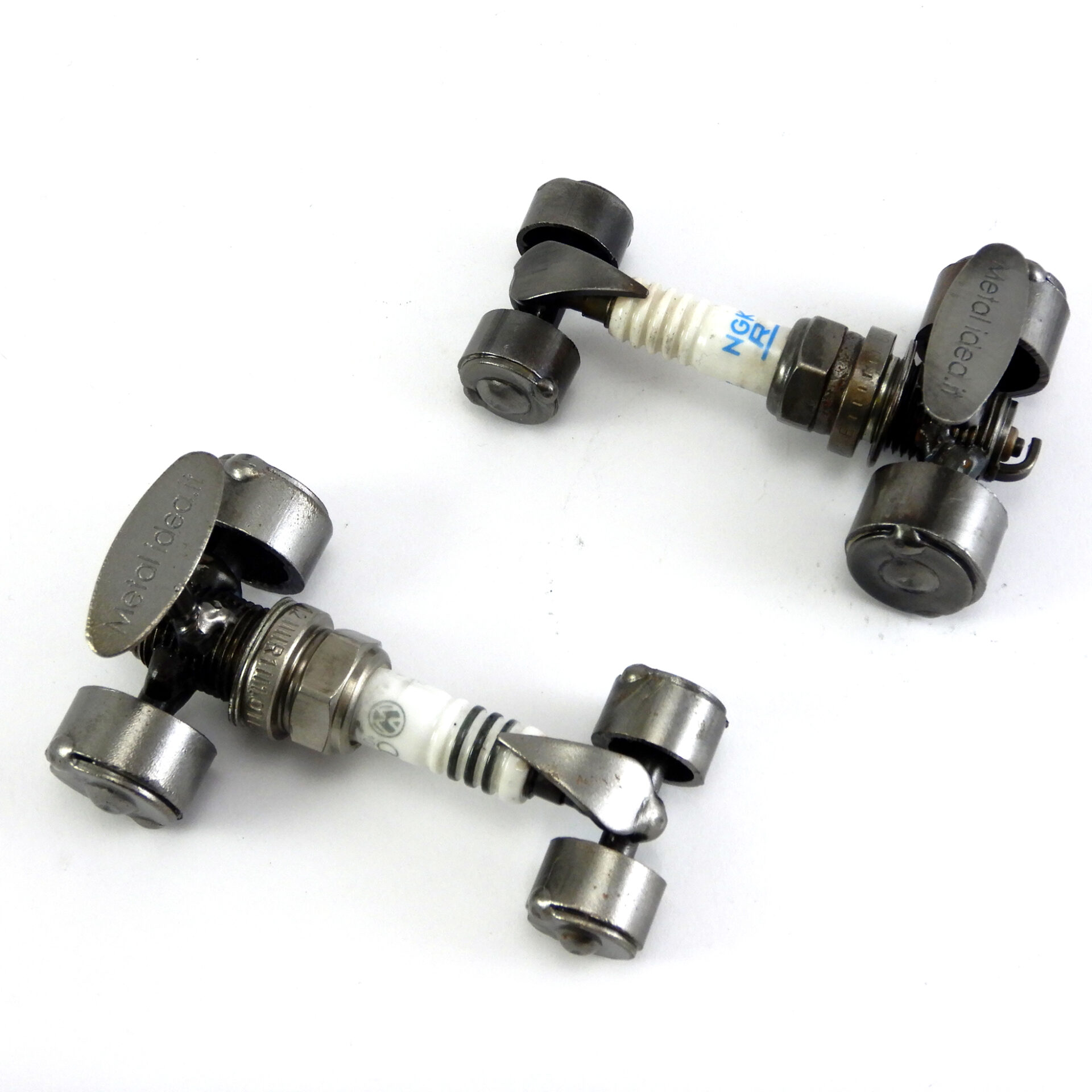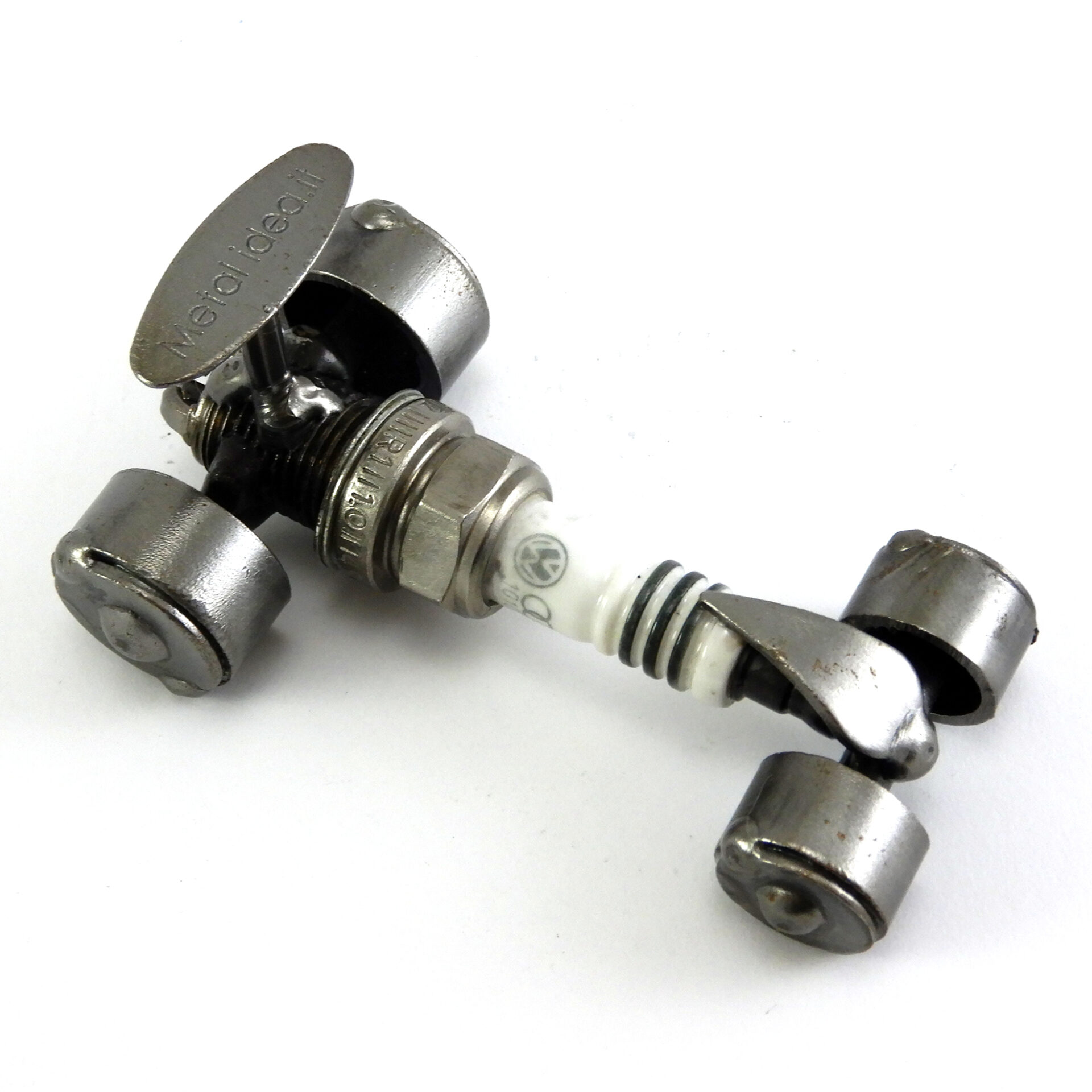 SCULTURA IN METALLO ARTIGIANALE RAFFIGURANTE AUTO MINI FORMULA 1 REALIZZATA MEDIANTE L’UTILIZZO DI UNA CANDELA DELL’AUTO RICICLATA