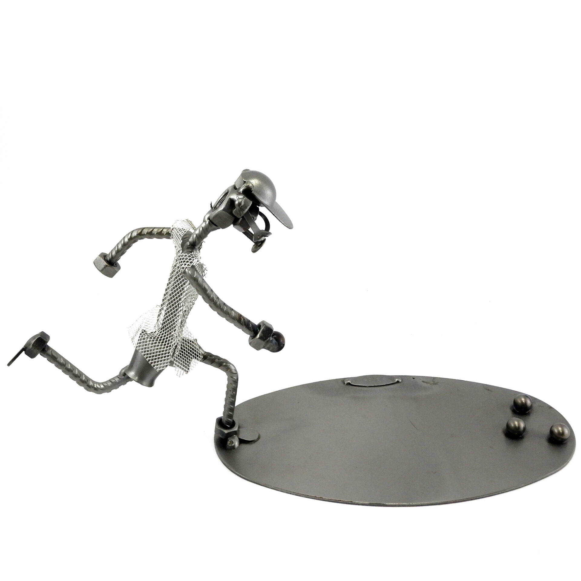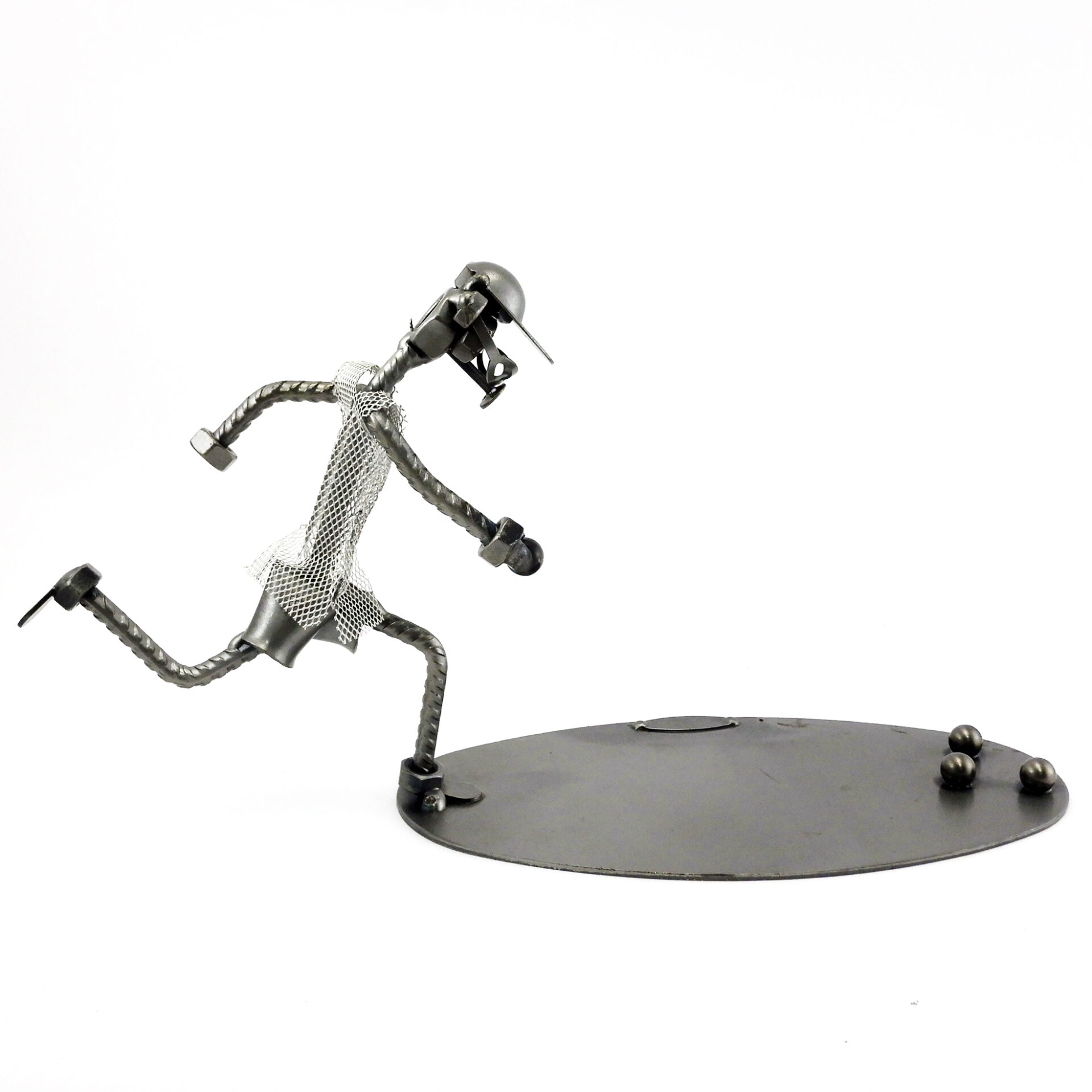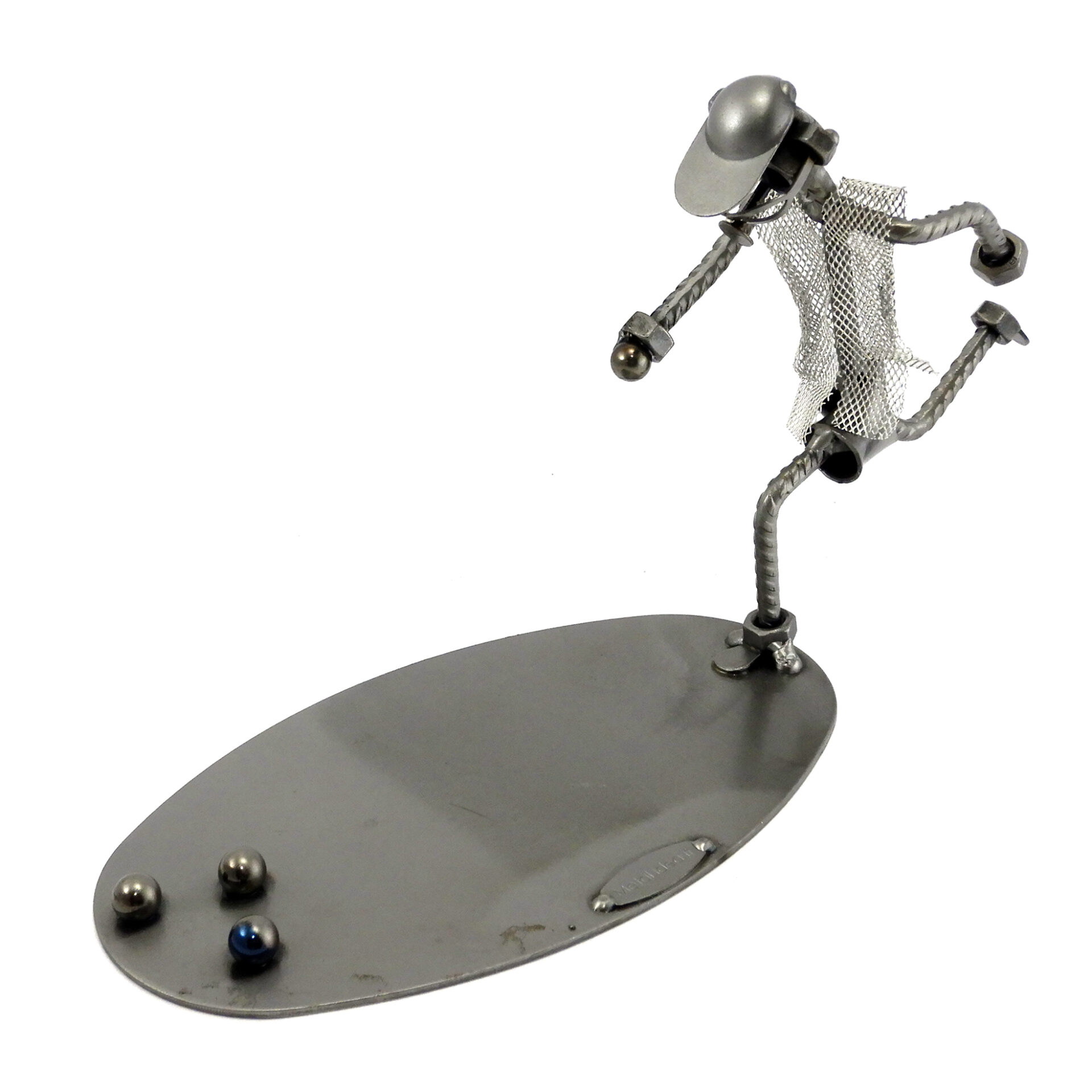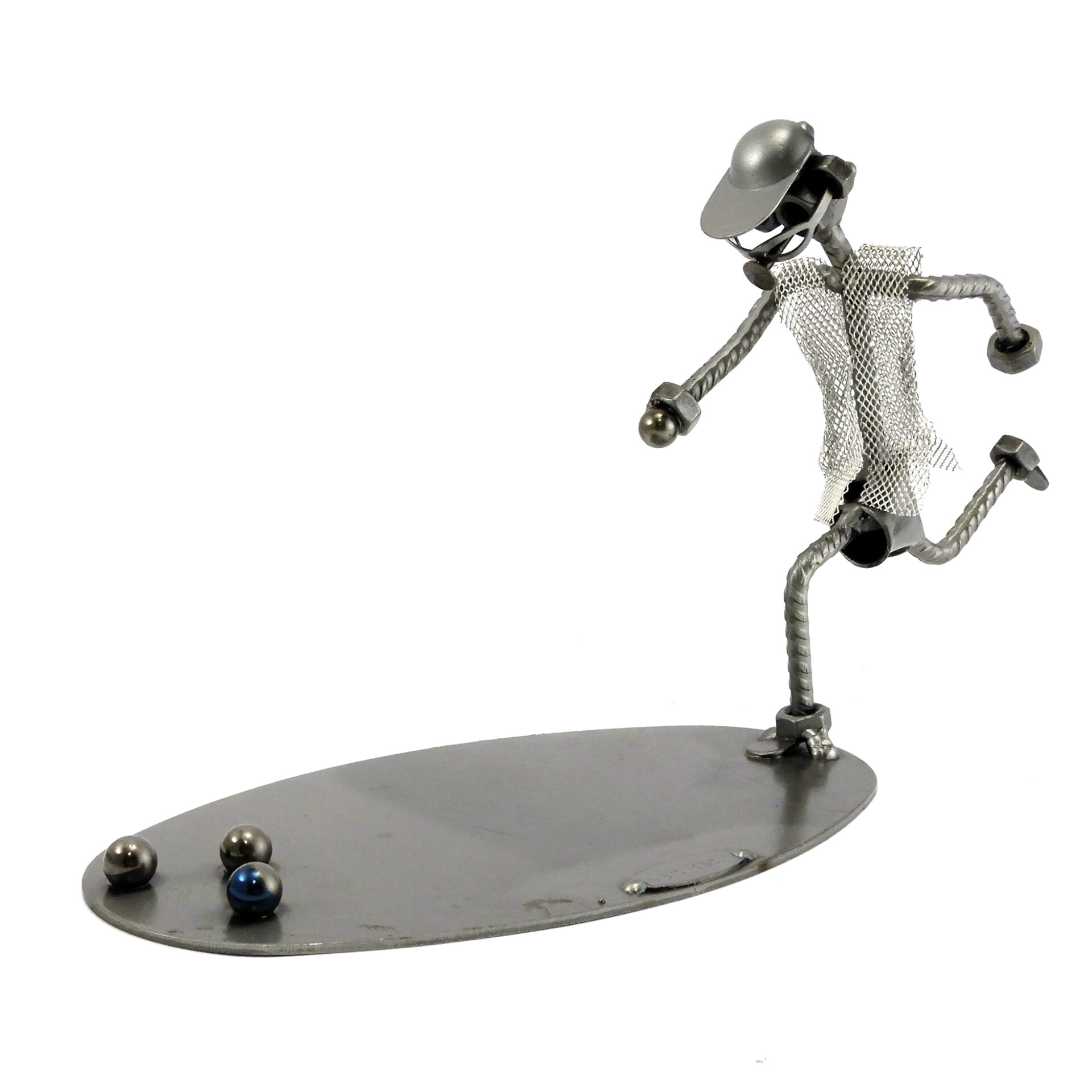 SCULTURA IN METALLO ARTIGIANALE RAFFIGURANTE UN BOCCIOFILO GIOCATORE DI BOCCE