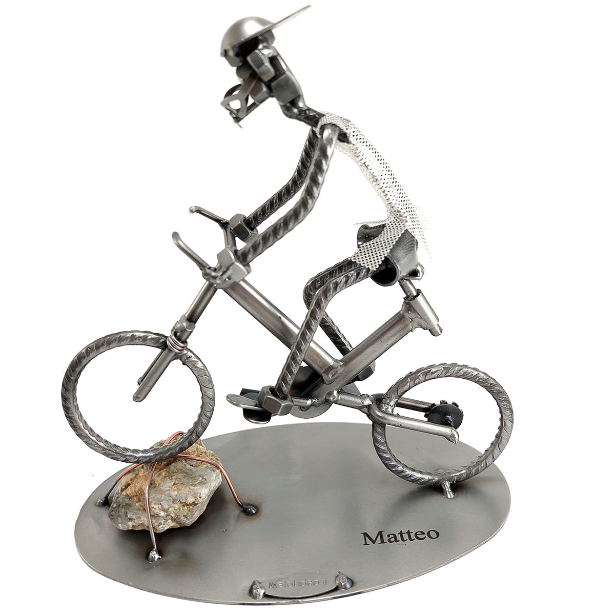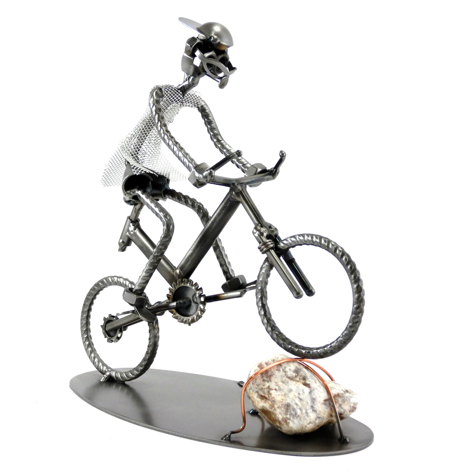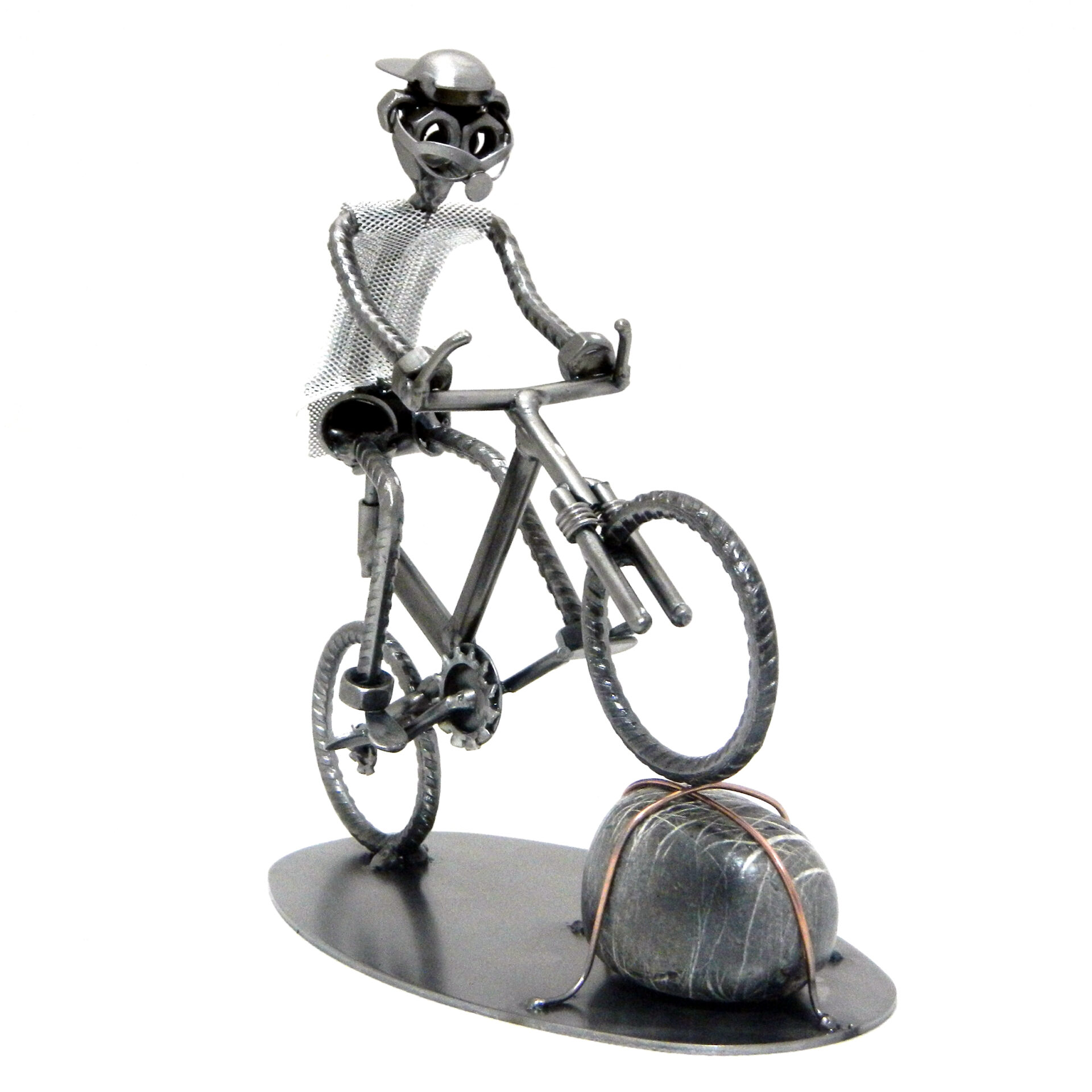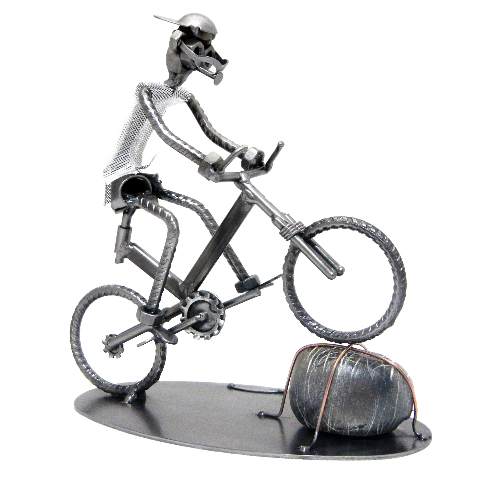 SCULTURA IN METALLO ARTIGIANALE RAFFIGURANTE IL CICLISTA SU BICICLETTA TIPO MOUNTAIN BIKE IN SALTO SU SASSO, il colore e grandezza del sasso possono variare!