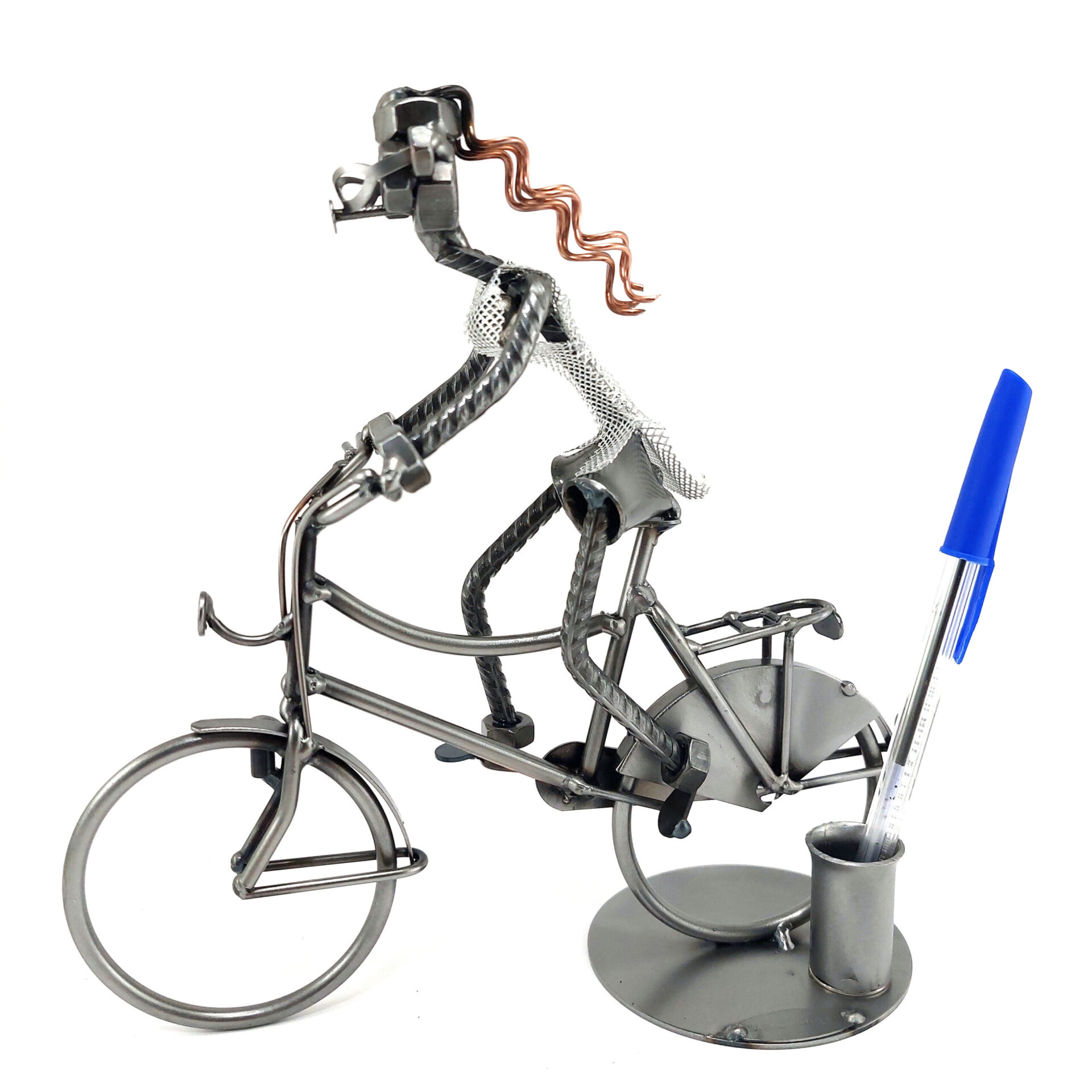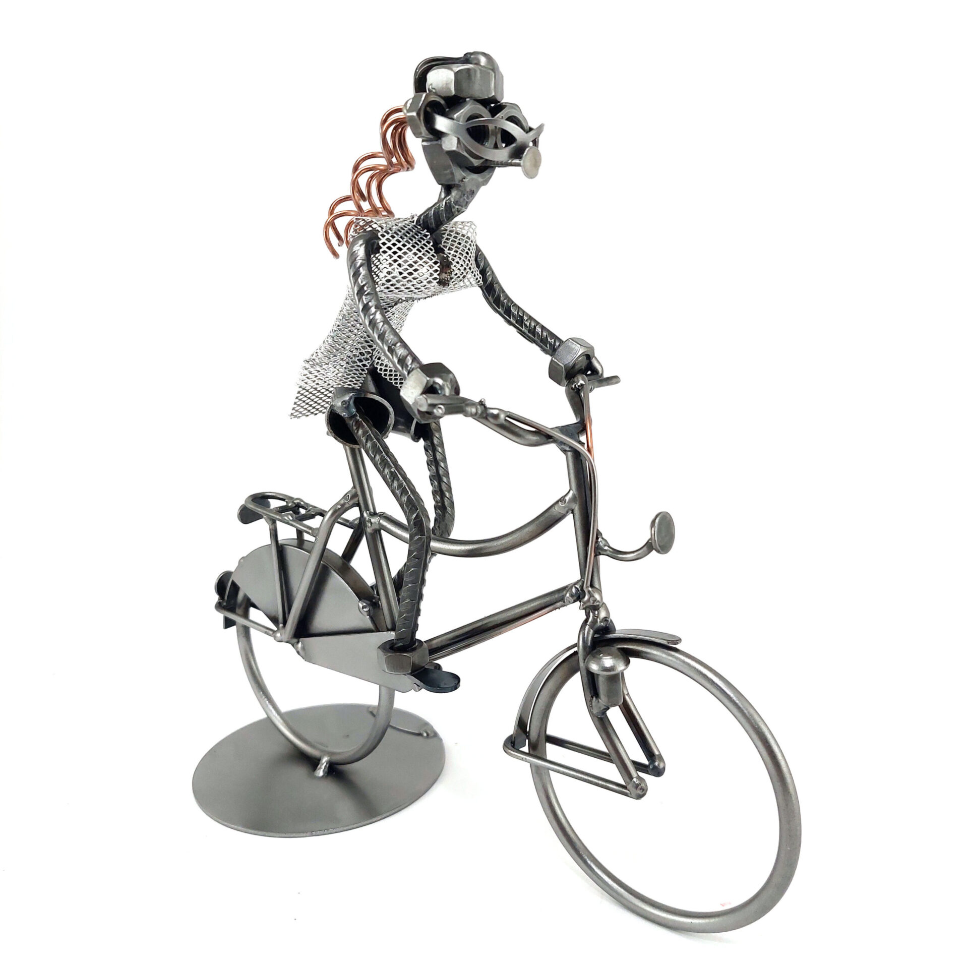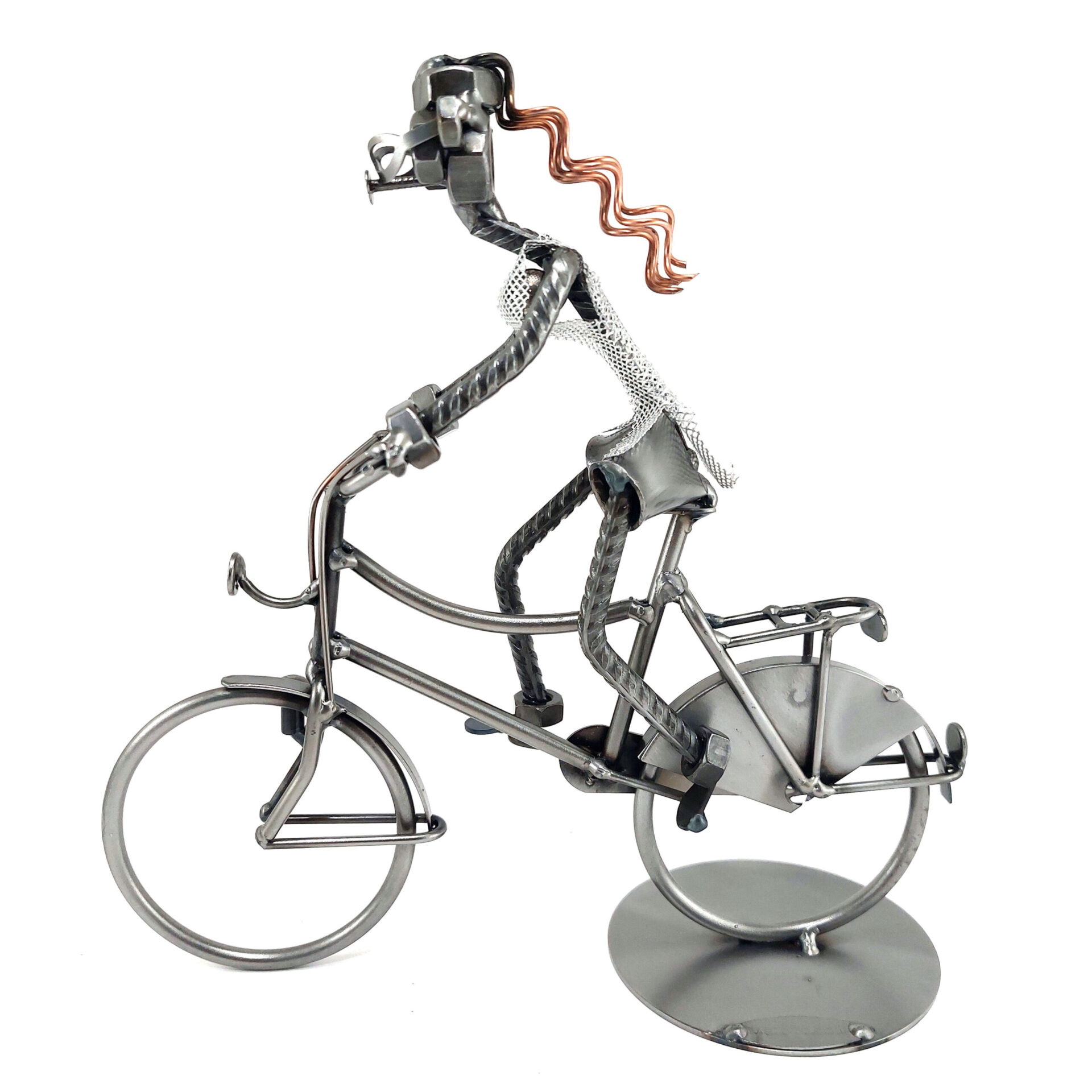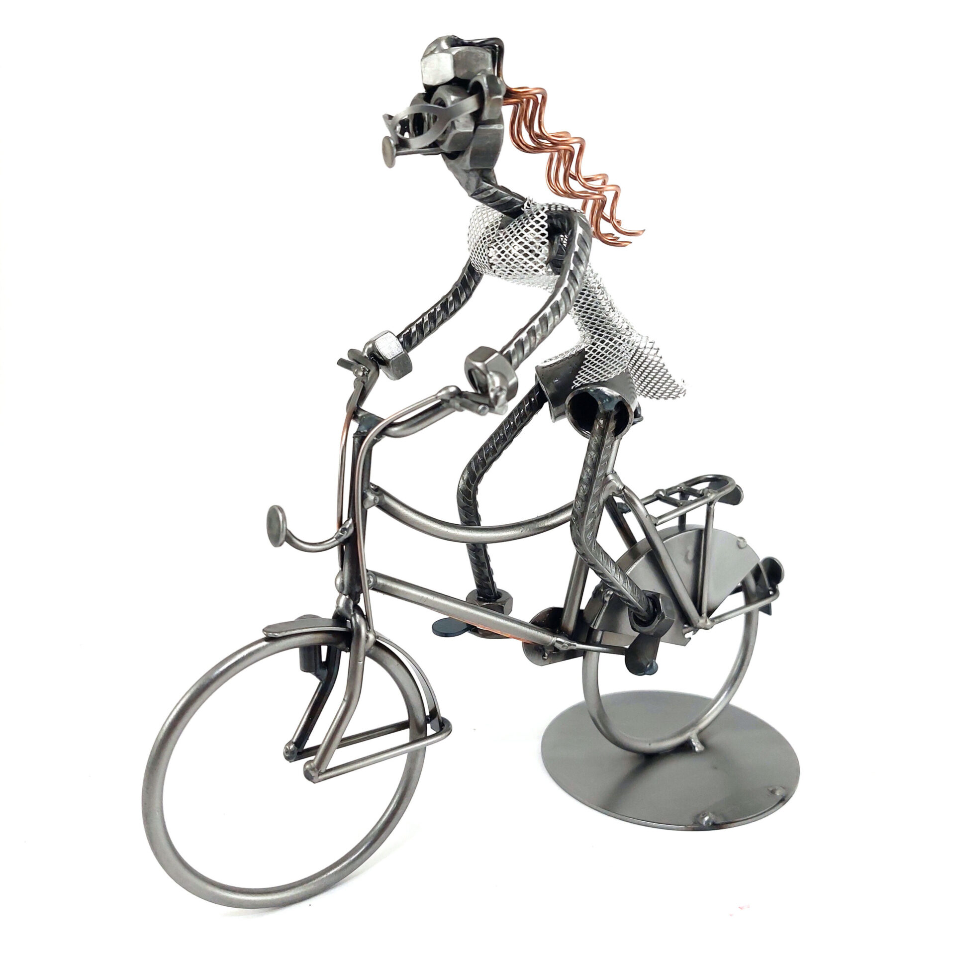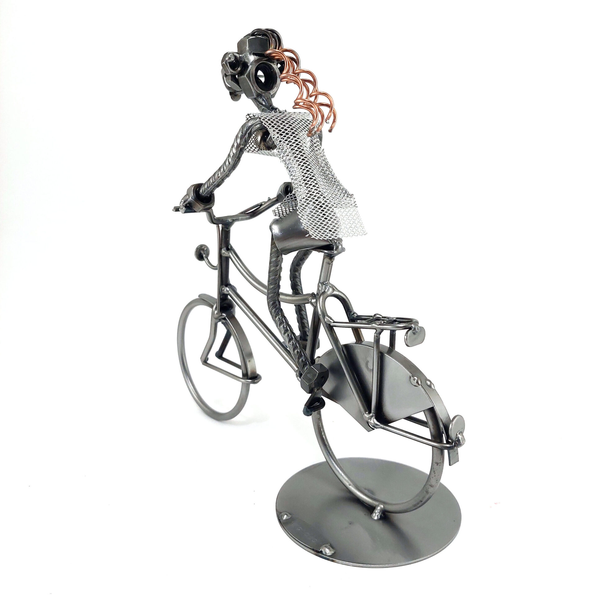 SCULTURA IN METALLO ARTIGIANALE RAFFIGURANTE LA CICLISTA SU CITYBIKE SCULTURA CITYBIKE DONNA