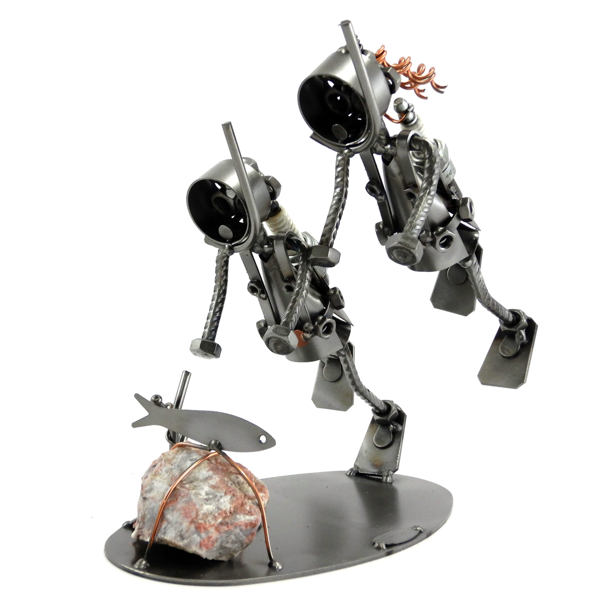 SCULTURA IN METALLO ARTIGIANALE RAFFIGURANTE LA COPPIA DI SUB, CON MASCHERA, BOCCAGLIO, PINNE, PESETTI ALLA CINTURA E LA BOMBOLA REALIZZATA CON LA CANDELA DI UN’AUTO RICICLATA. IN FONDO AL MARE ABBIAMO INSERITO UN SASSO CON UN PESCIOLINO OLTRE AD UN CORALLO.