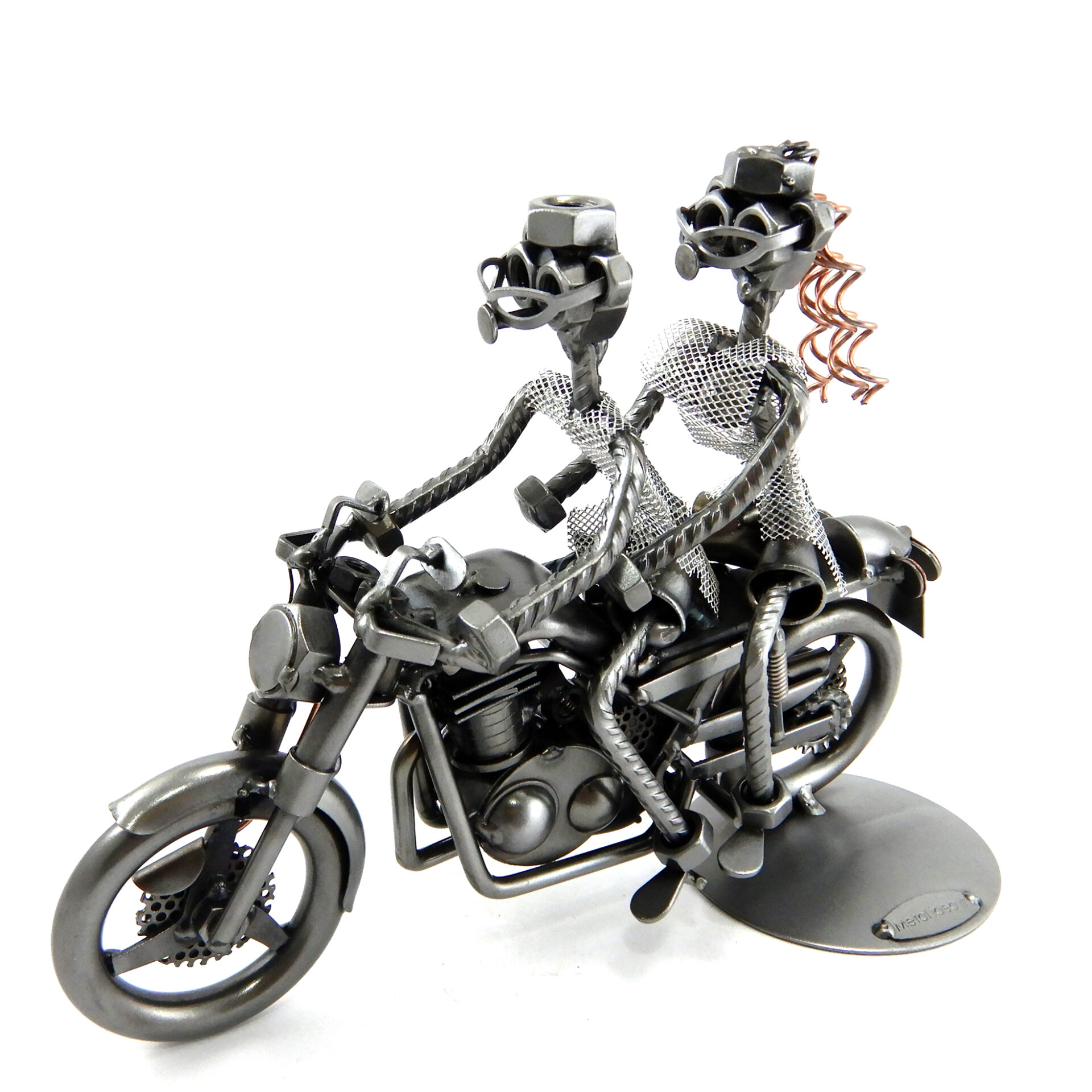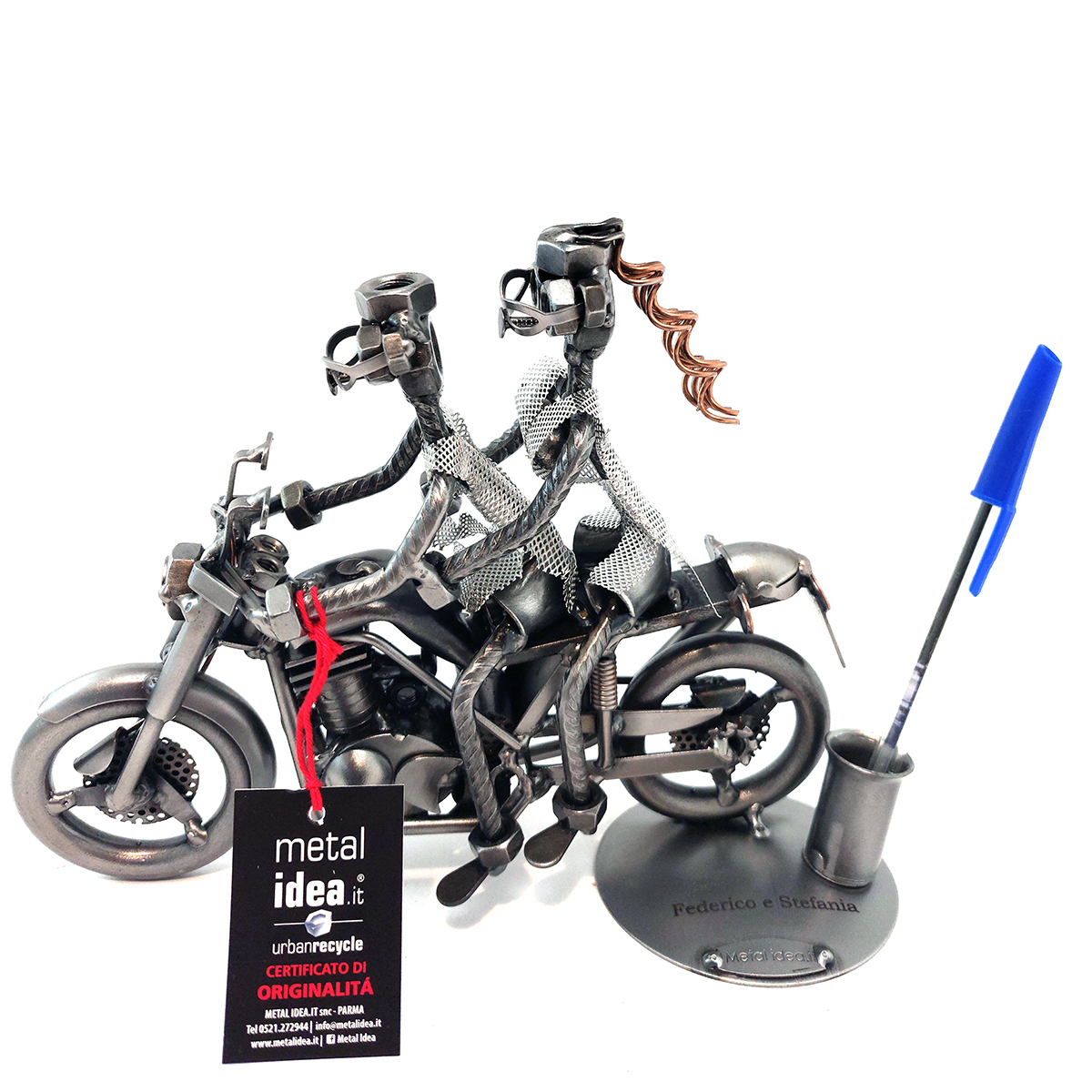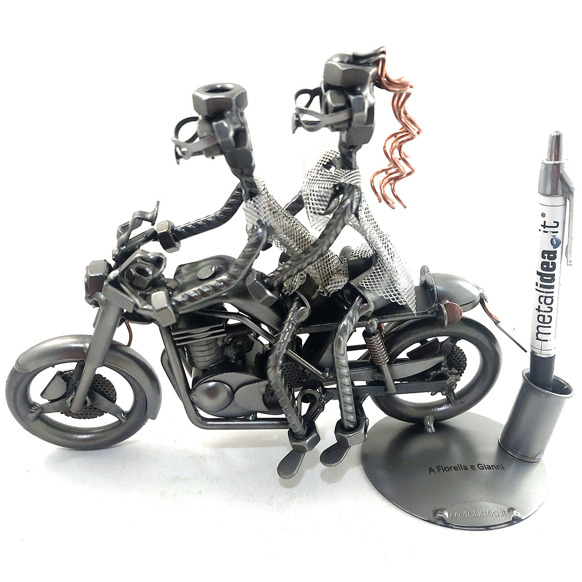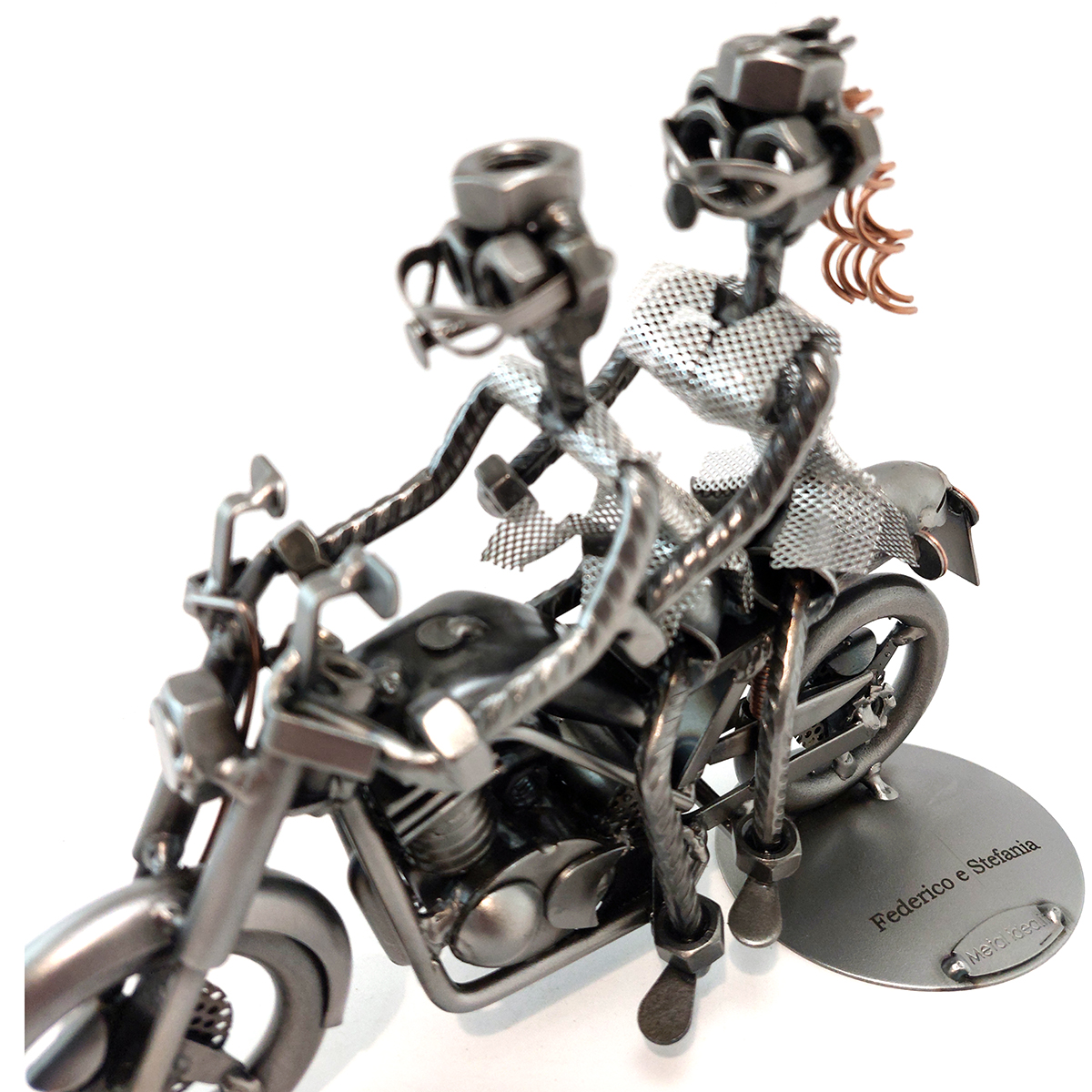 SCULTURA IN METALLO ARTIGIANALE RAFFIGURANTE COPPIA SU MOTO DA CORSA, disponibile anche nella versione con solo l’uomo oppure su richiesta anche con sposi.