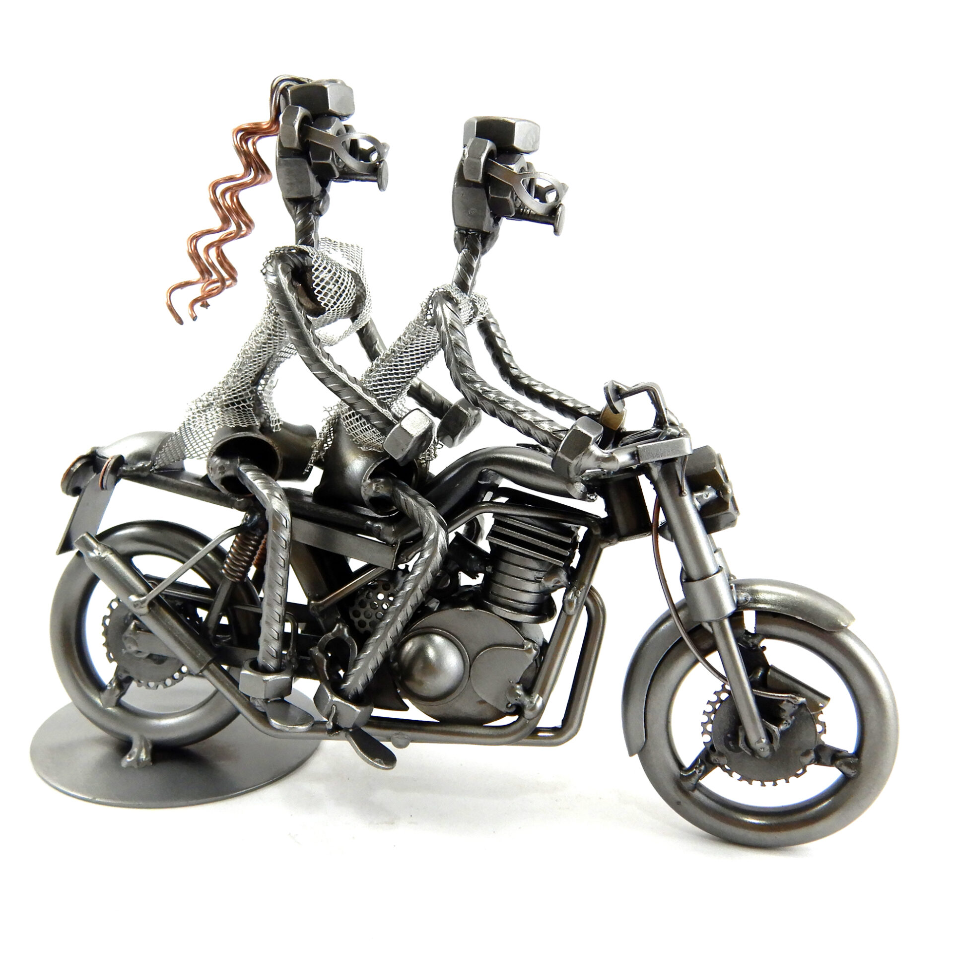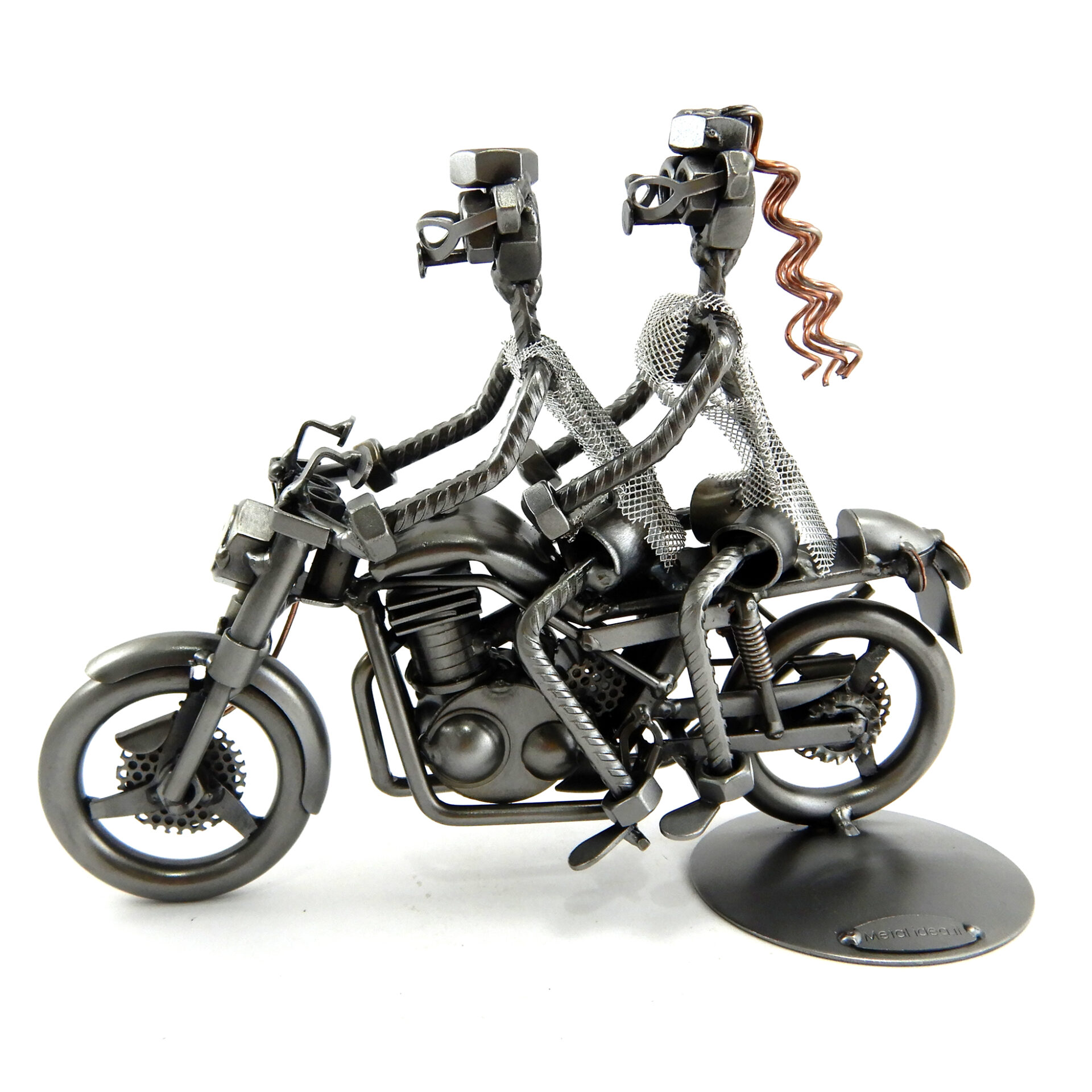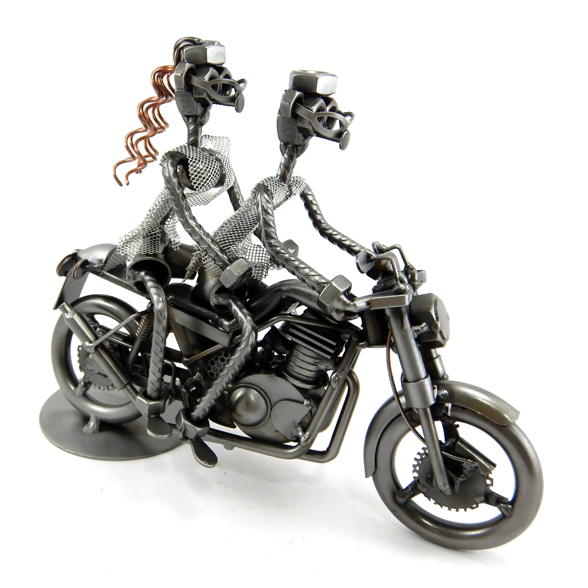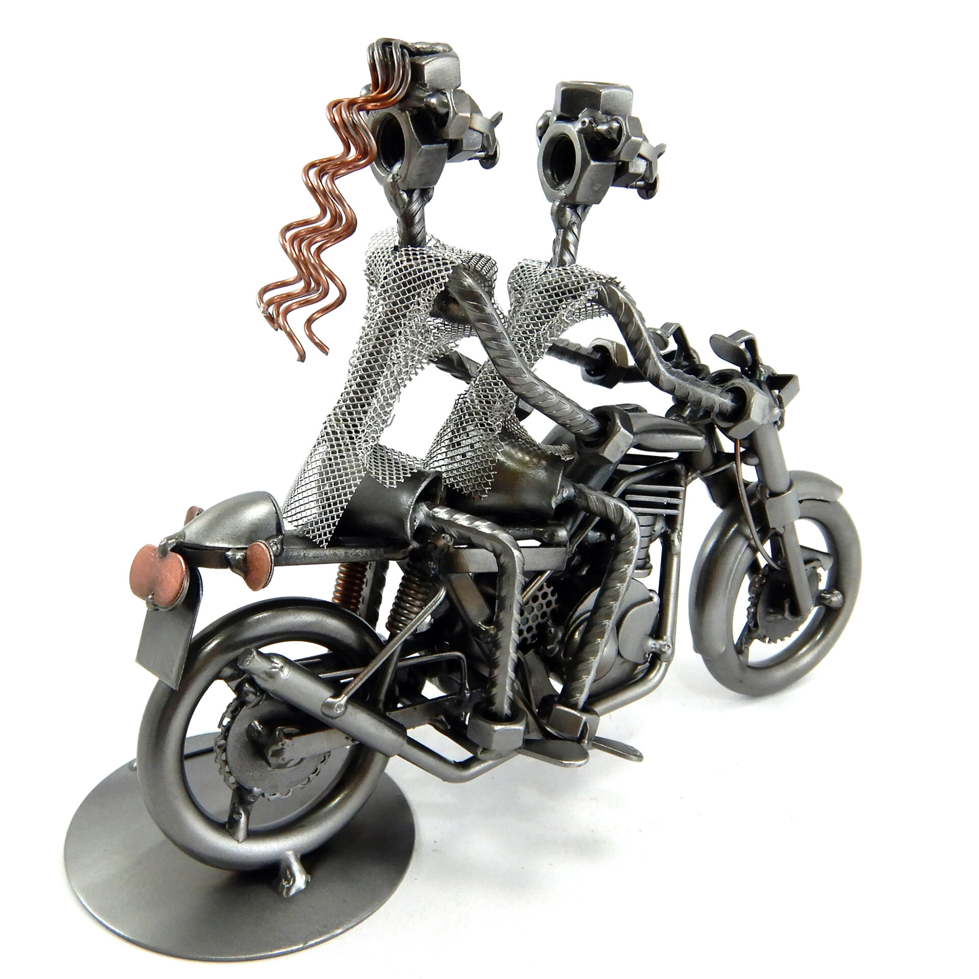SCULTURA IN METALLO ARTIGIANALE RAFFIGURANTE COPPIA SU MOTO DA CORSA, disponibile anche nella versione con solo l’uomo oppure su richiesta anche con sposi.