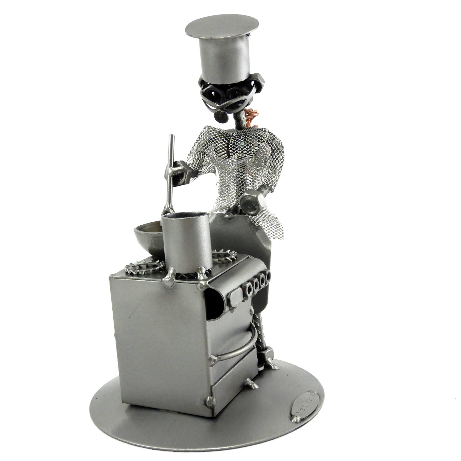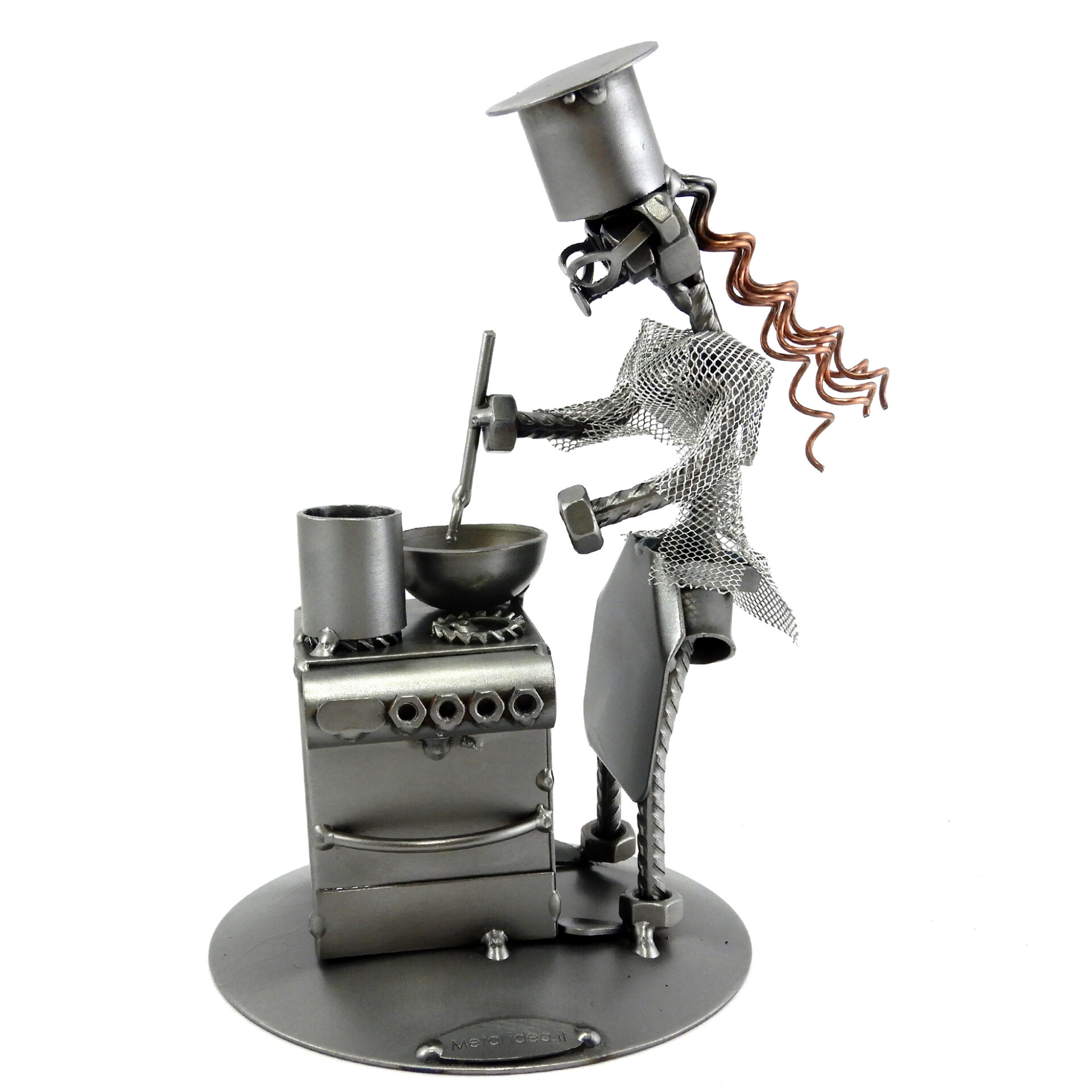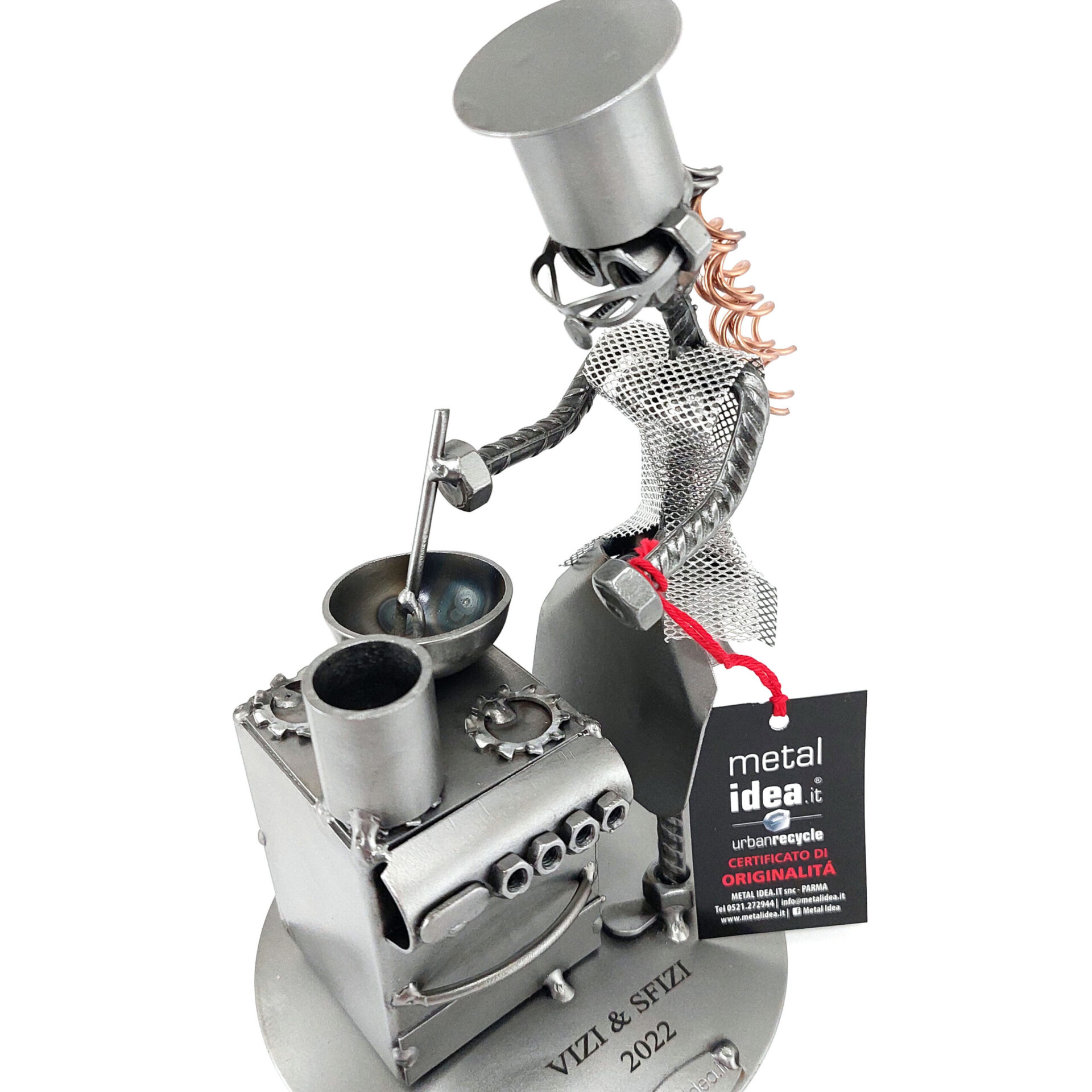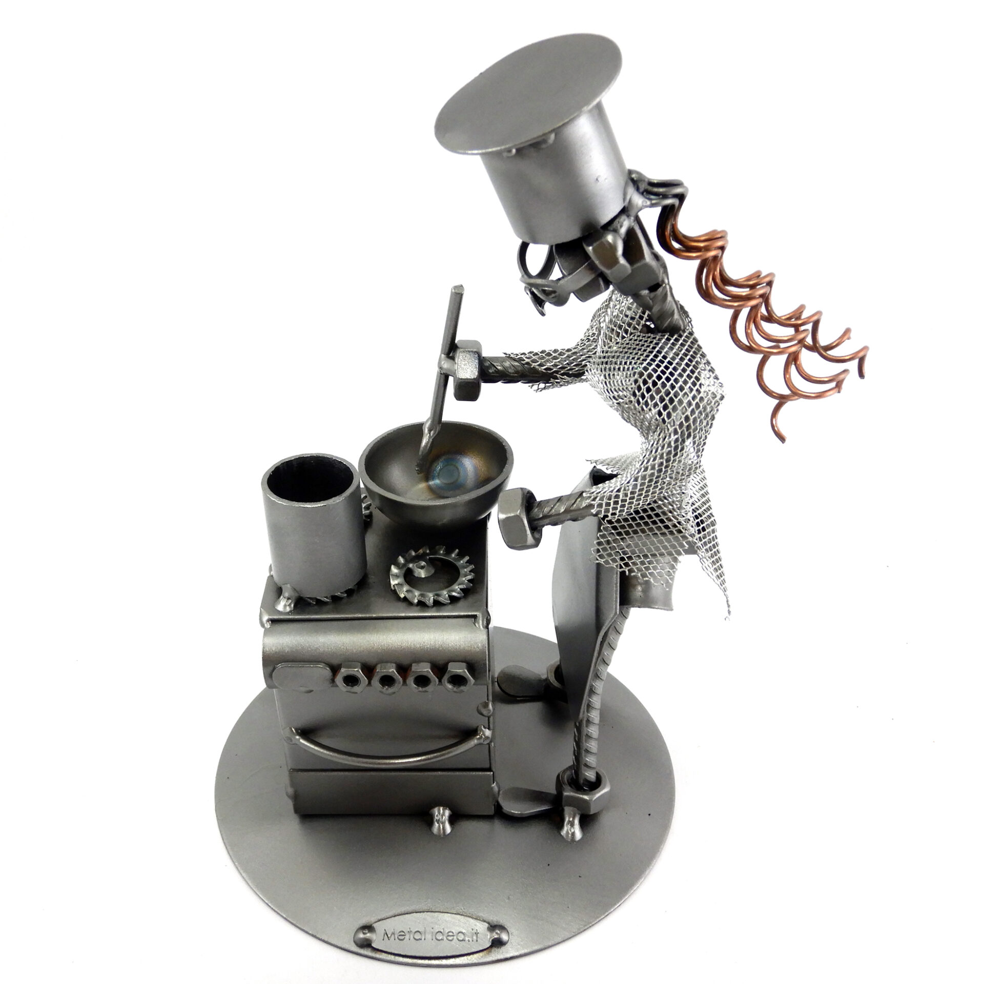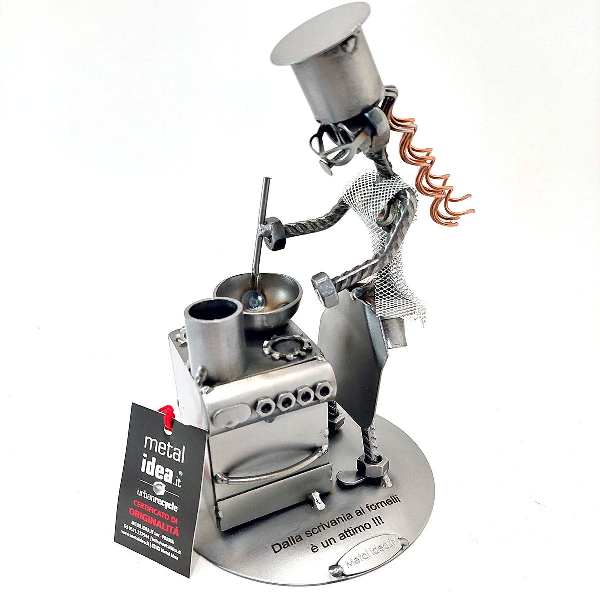 SCULTURA IN METALLO ARTIGIANALE RAFFIGURANTE IL CUOCA – CHEF VERSIONE DONNA CON CUCINA E PADELLA