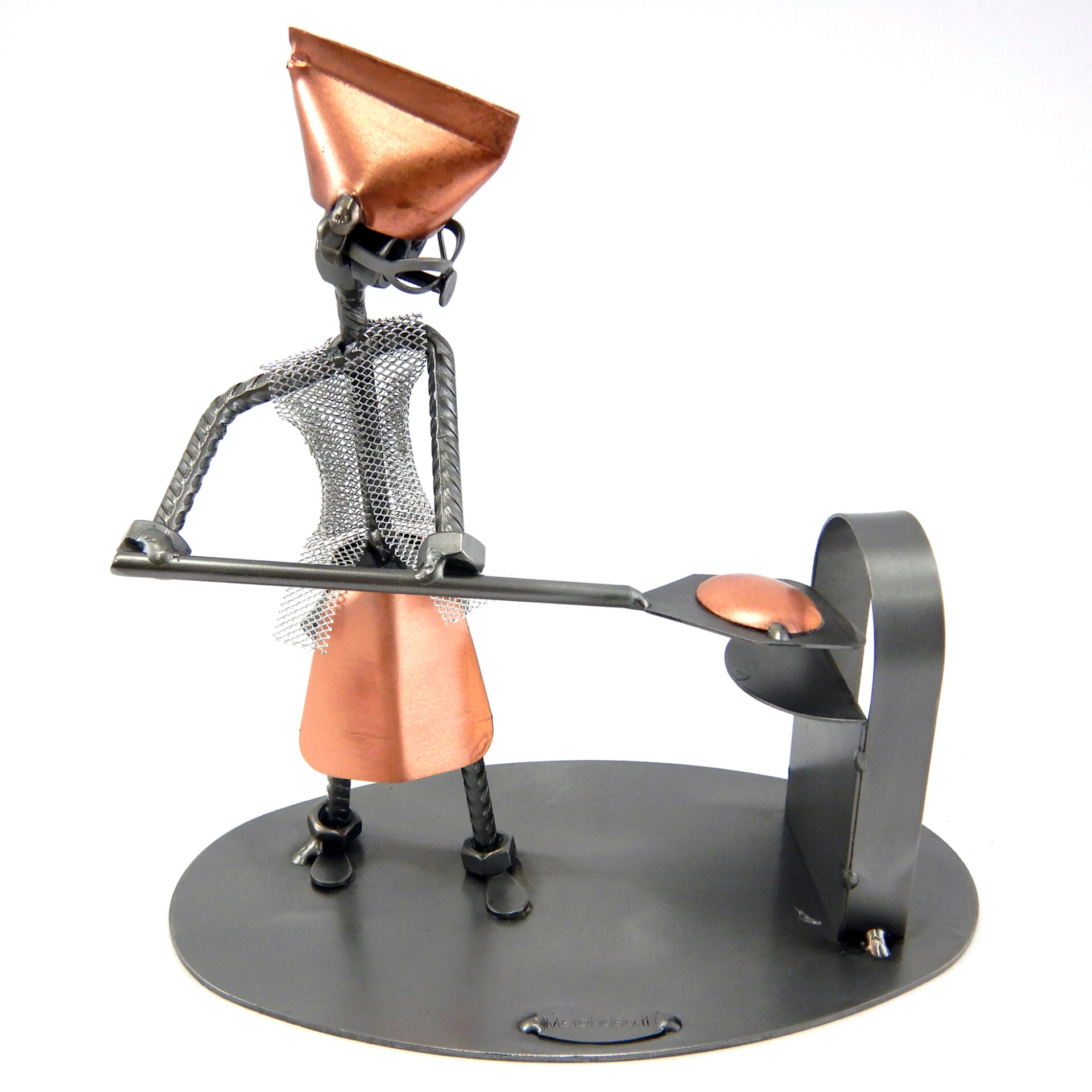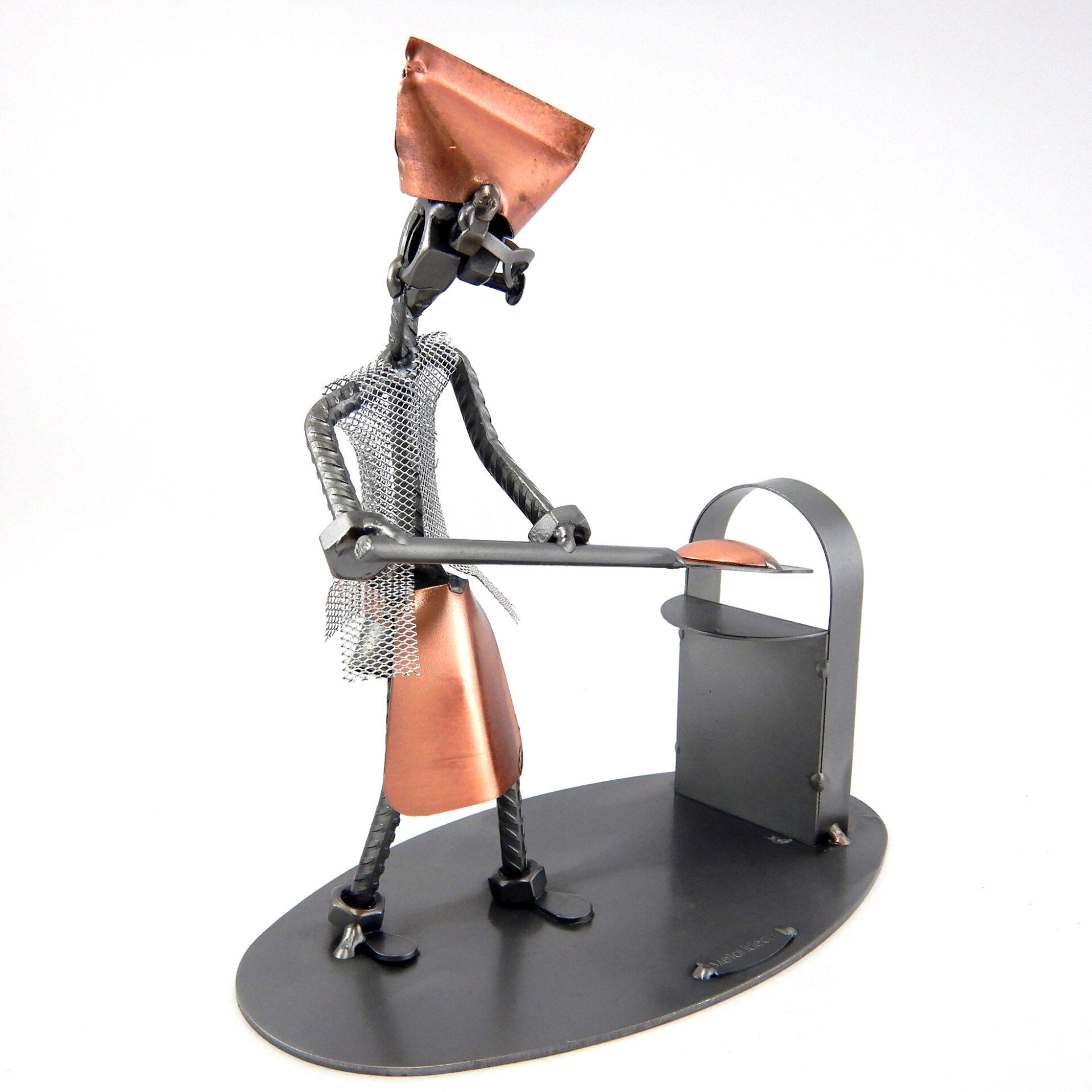 SCULTURA IN METALLO ARTIGIANALE RAFFIGURANTE IL FORNAIO – PIZZAIOLO CON FORNO, con componenti in rame