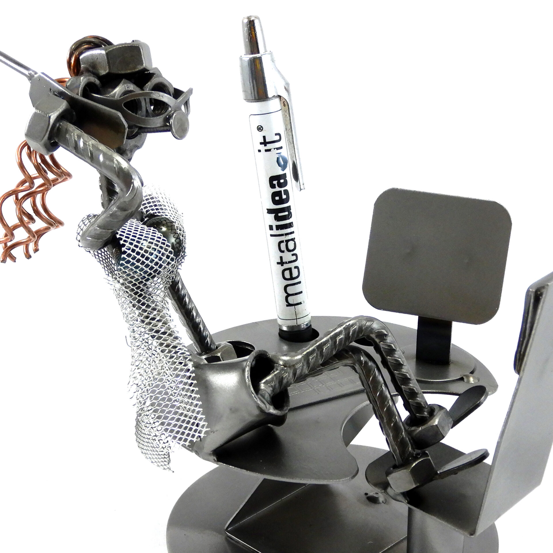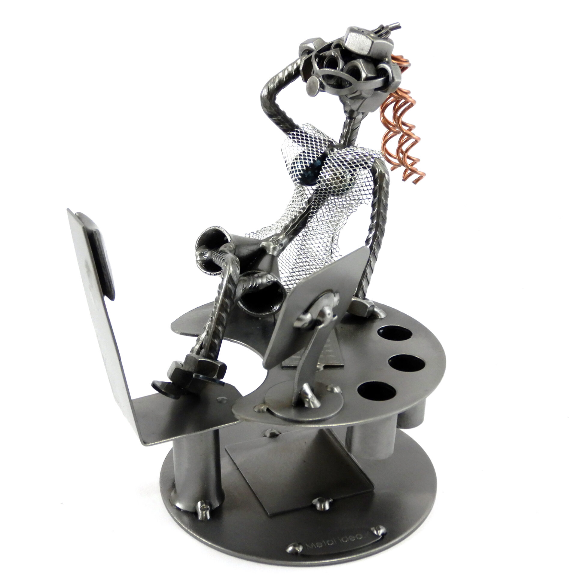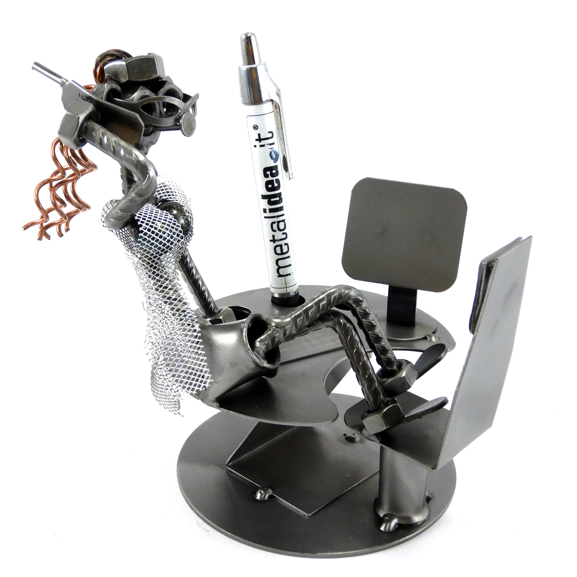 SCULTURA IN METALLO ARTIGIANALE RAFFIGURANTE IMPIEGATA SEGRETARIA – MANAGER  seduta sulla scrivania con porta penne