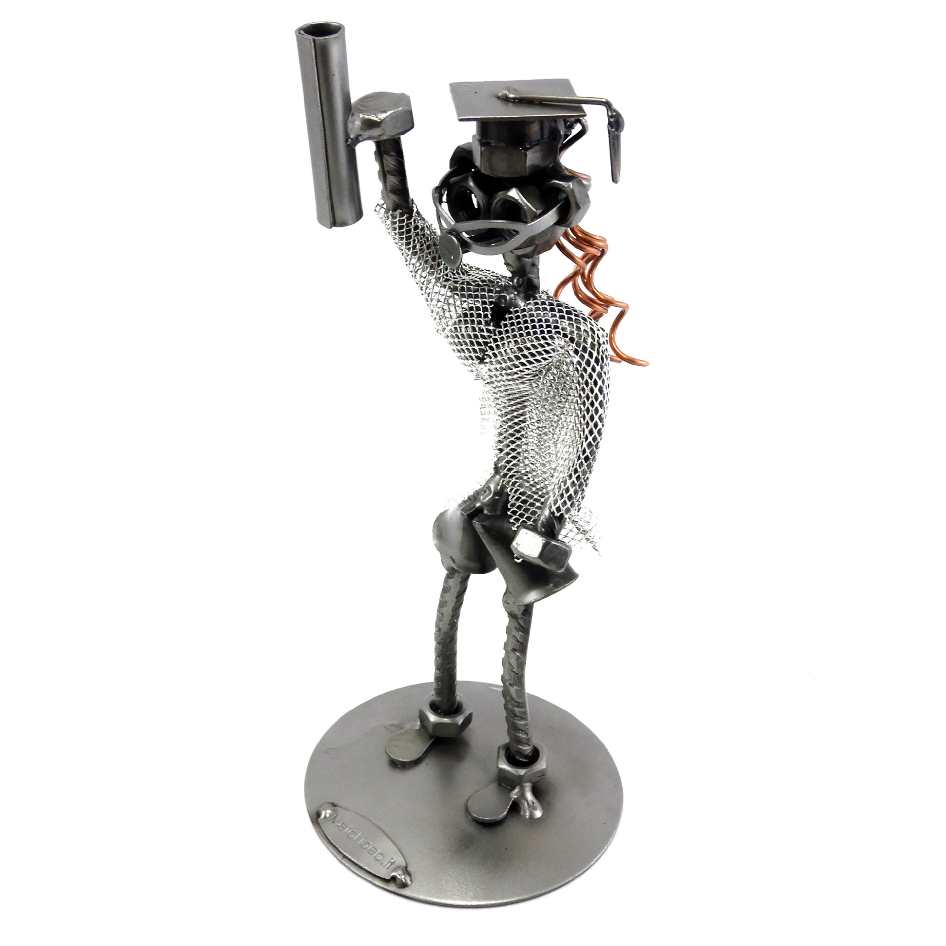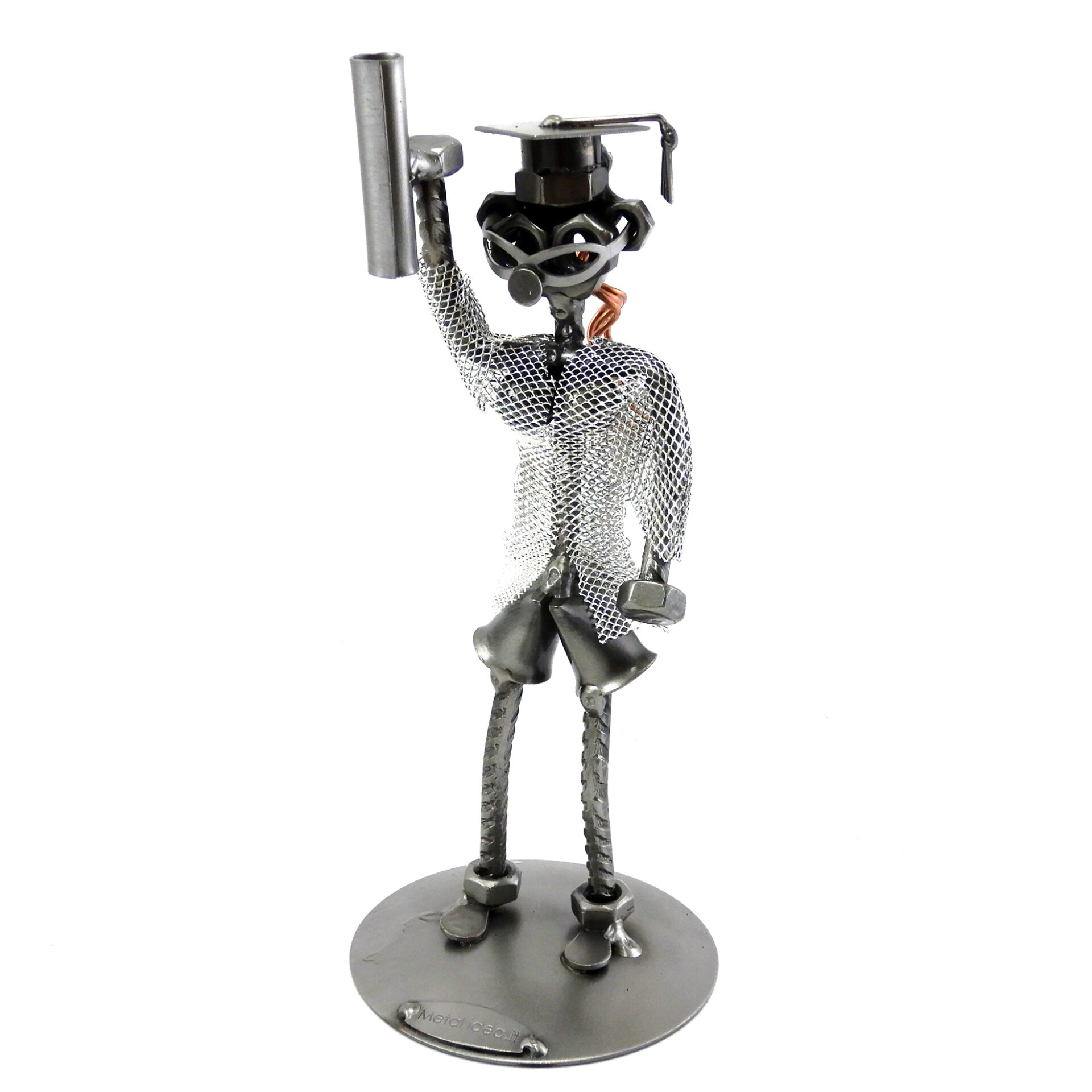 SCULTURA IN METALLO ARTIGIANALE RAFFIGURANTE LA LAUREATA CON CAPPELLO LAUREA E PERGAMENA IN MANO