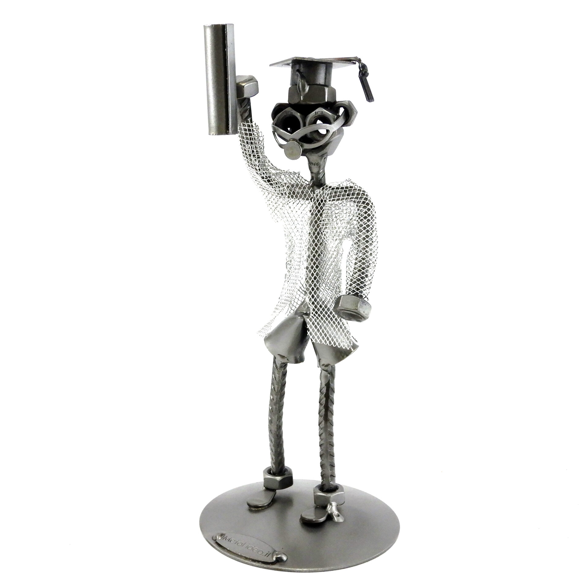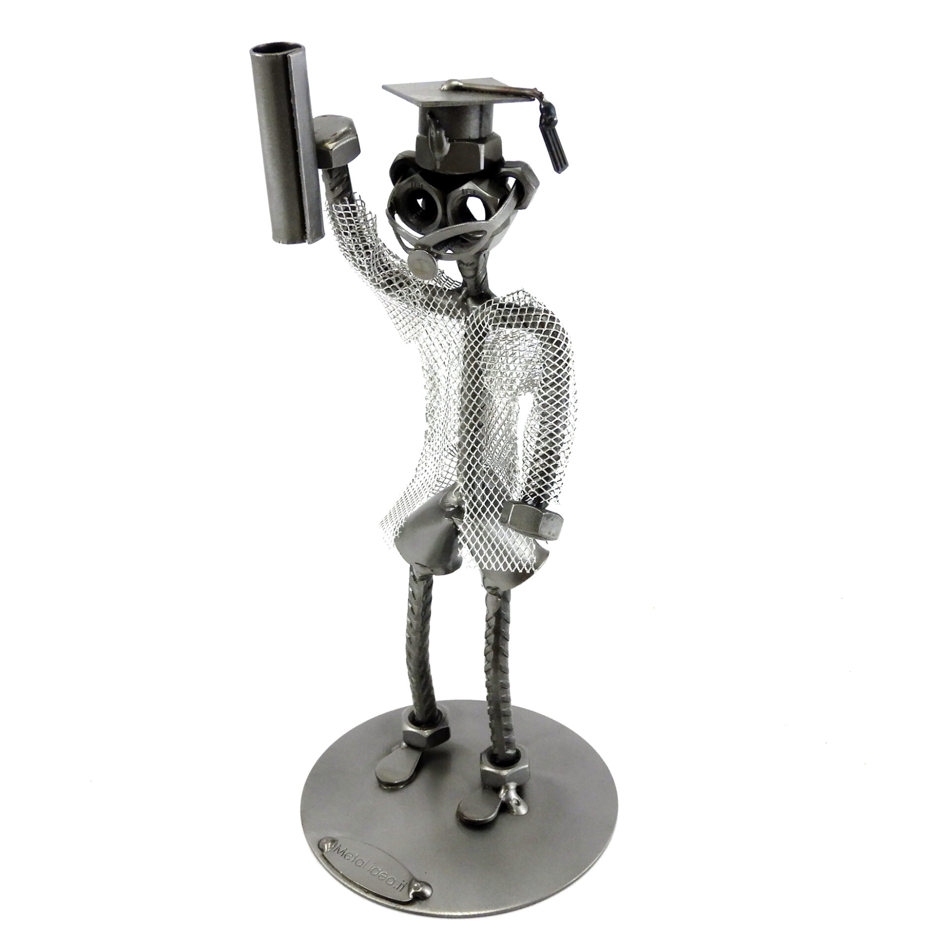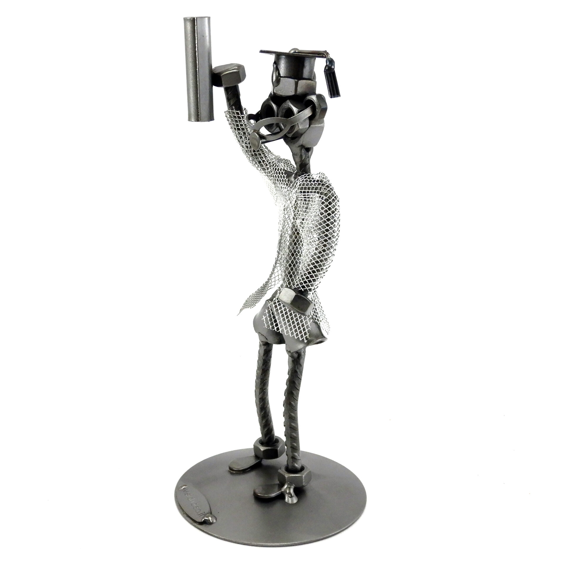 SCULTURA IN METALLO ARTIGIANALE RAFFIGURANTE IL LAUREATO CON CAPPELLO LAUREA E PERGAMENA IN MANO