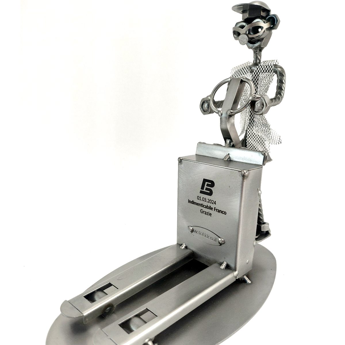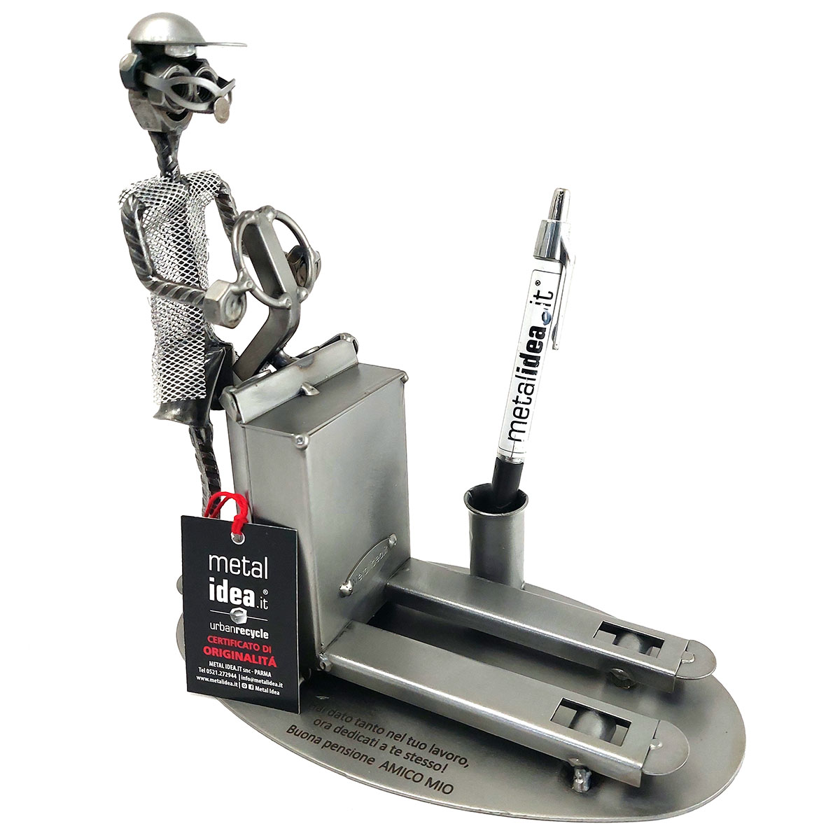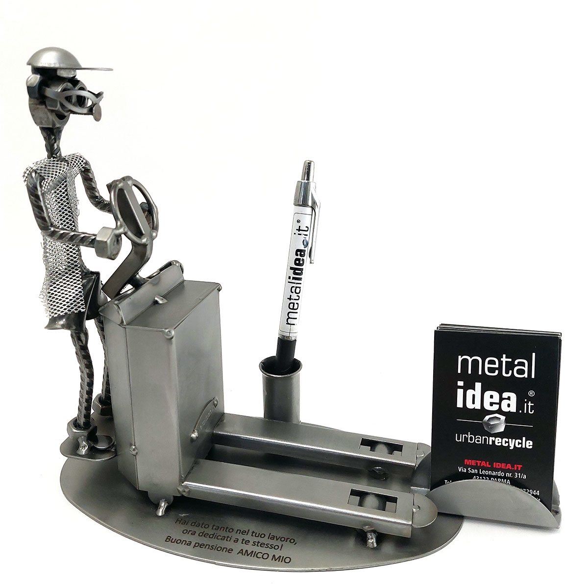 La nostra collezione di pezzi è caratterizzata da un moderno ed originale design “made in Italy”, firmato METAL IDEA.IT®, marchio registrato. Siamo orgogliosi di offrire creazioni uniche e di qualità, perfette per ogni occasione, come compleanni, anniversari, pensionamenti, lauree, matrimoni, comunioni, cresime, premiazioni sportive e feste della mamma e del papà. E se stai cercando un regalo davvero speciale e unico, non cercare oltre: i nostri soggetti artigianali sono perfetti per te. Tieni presente che eventuali irregolarità o piccole imperfezioni non sono da ritenersi difetti, ma piuttosto autenticità della lavorazione artigianale.