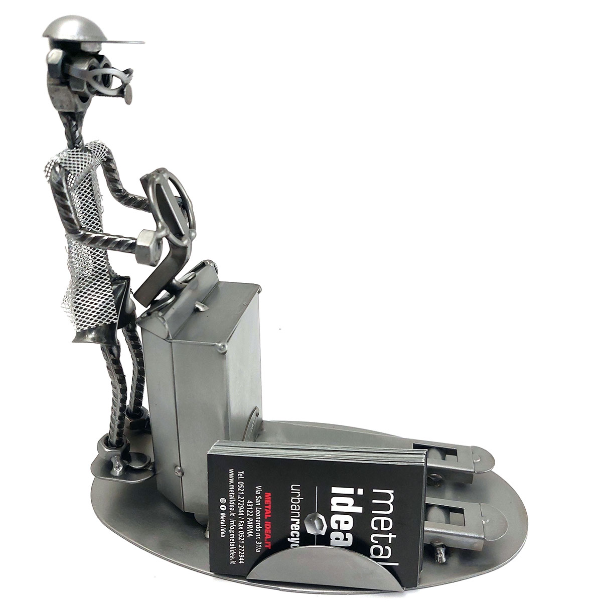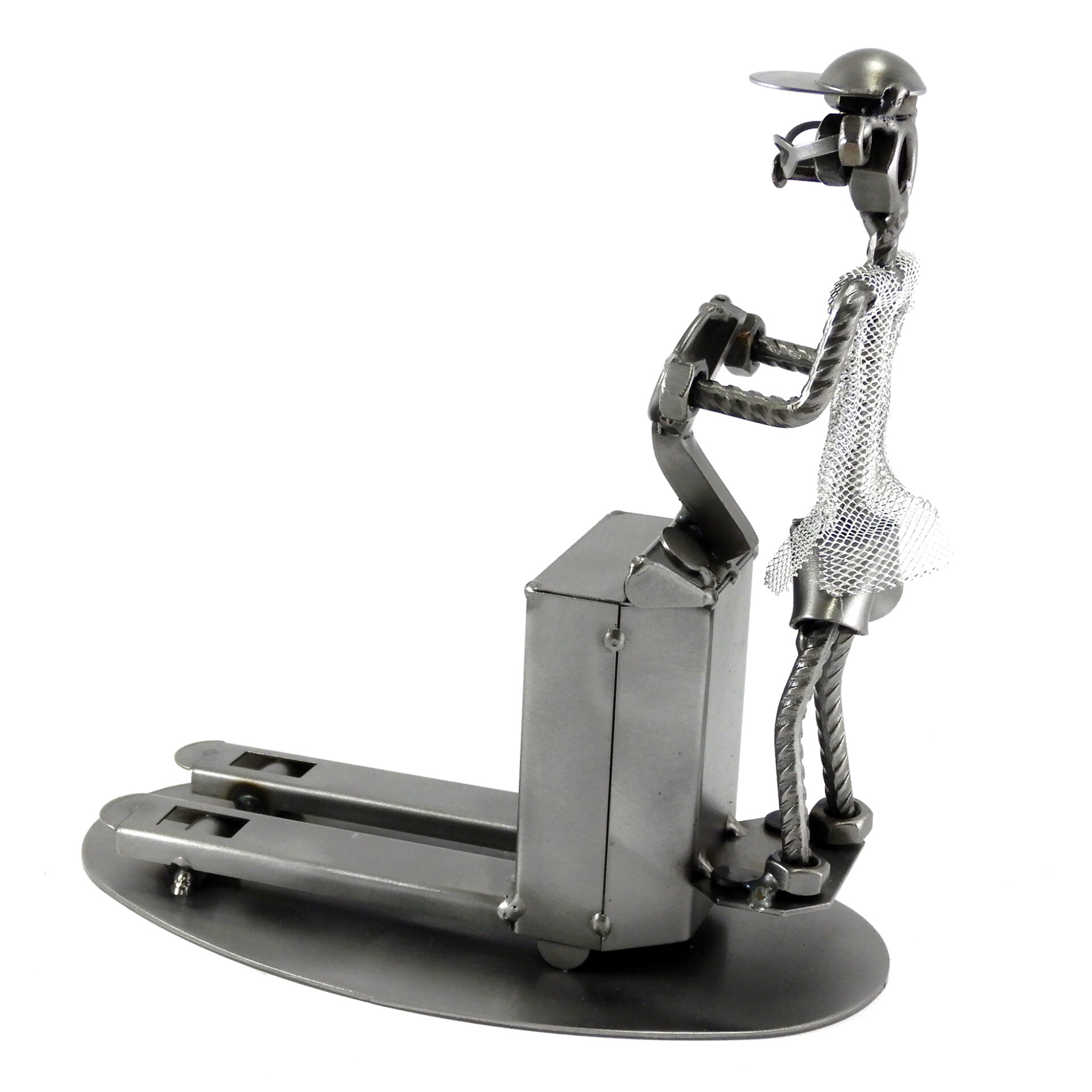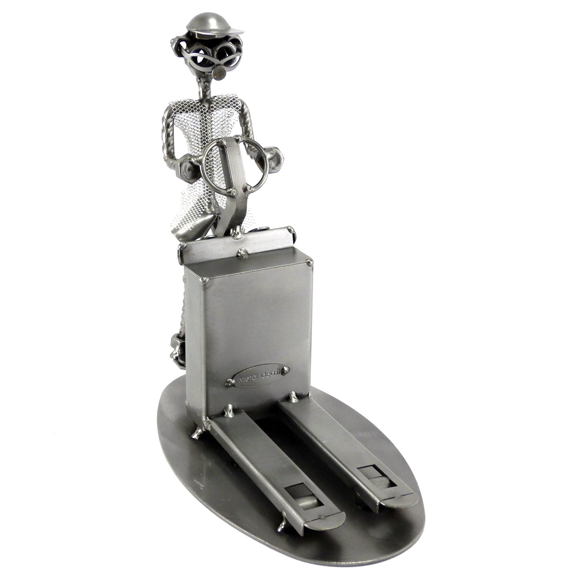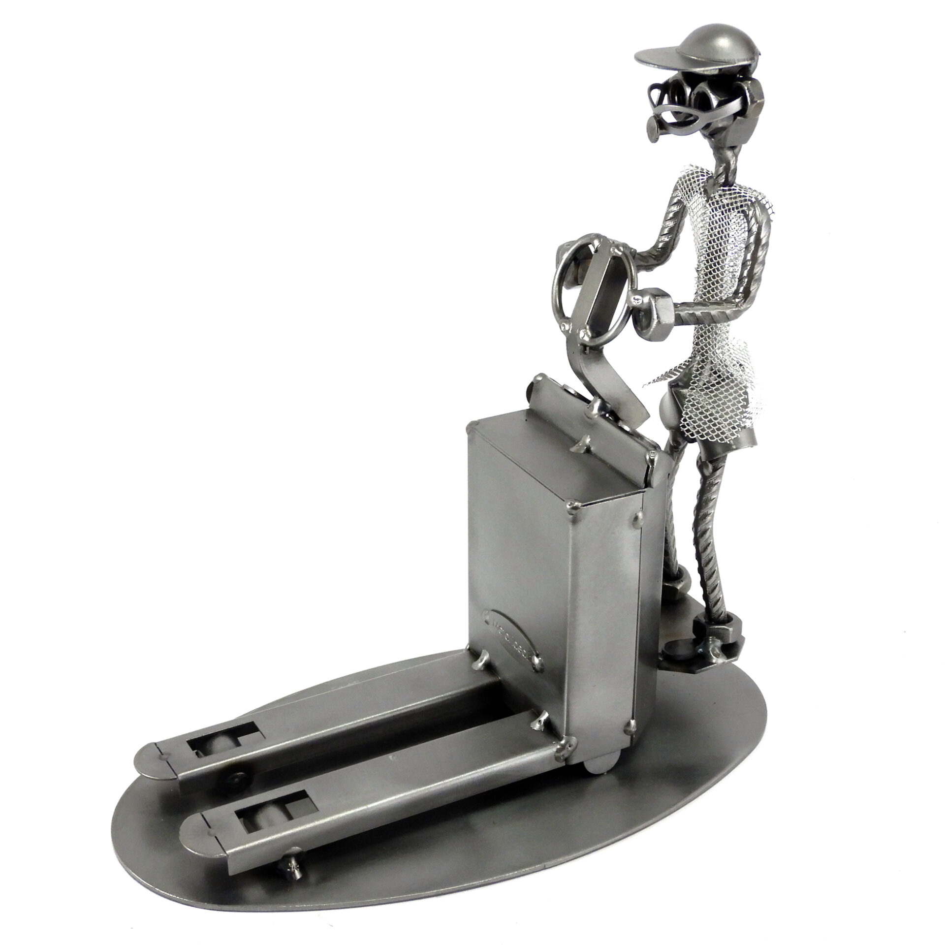 SCULTURA IN METALLO ARTIGIANALE RAFFIGURANTE IL MAGAZZINIERE SU TRANSPALLET