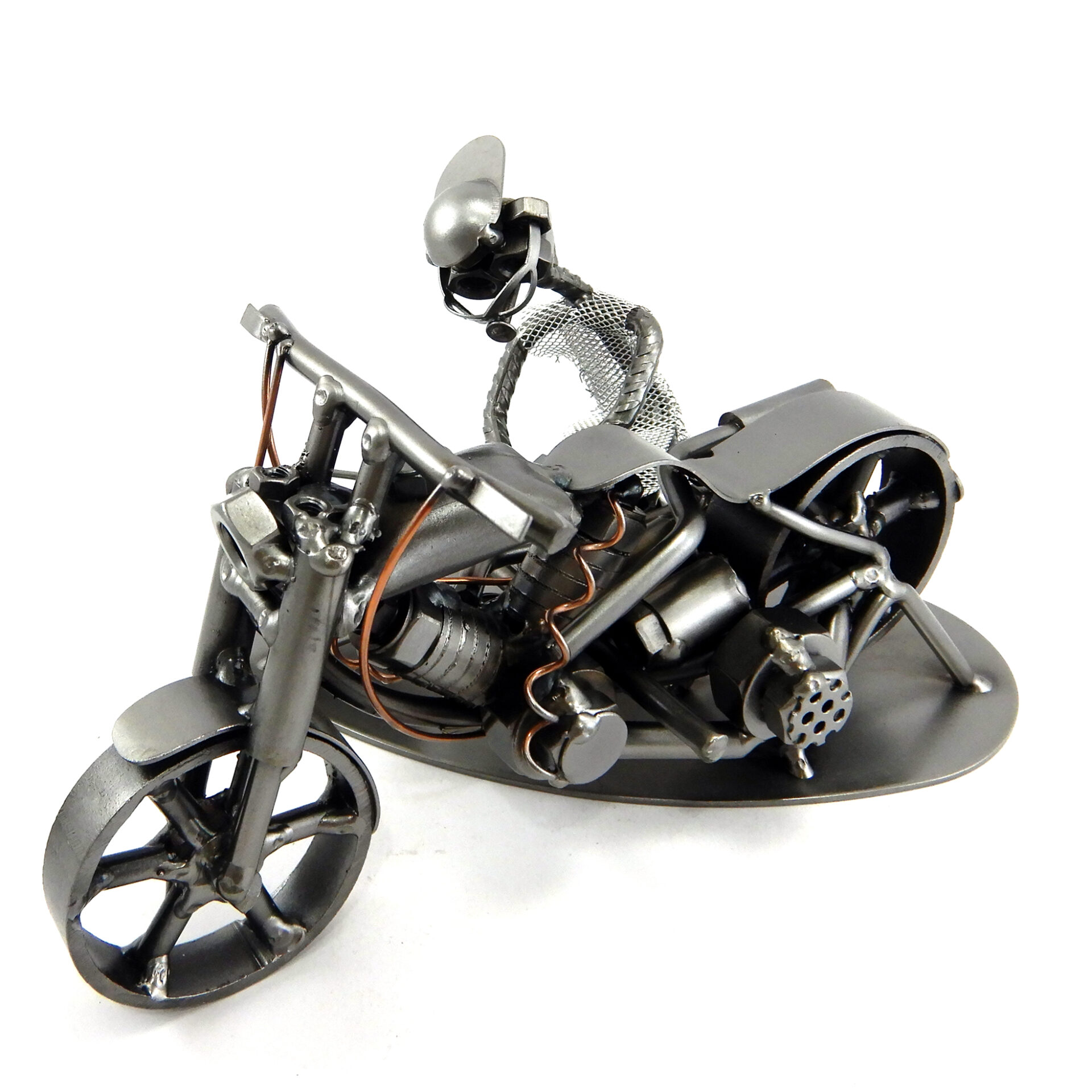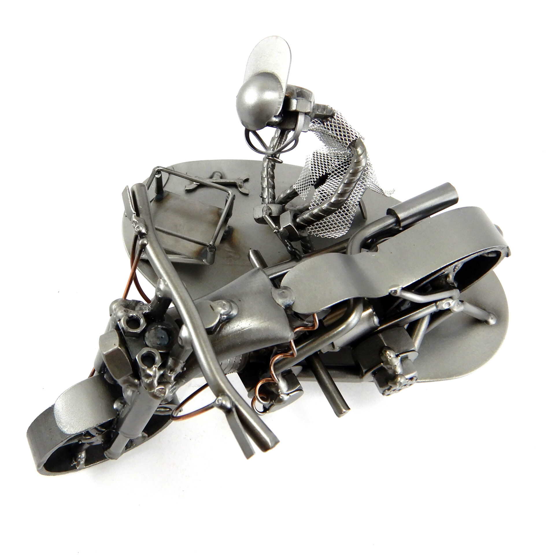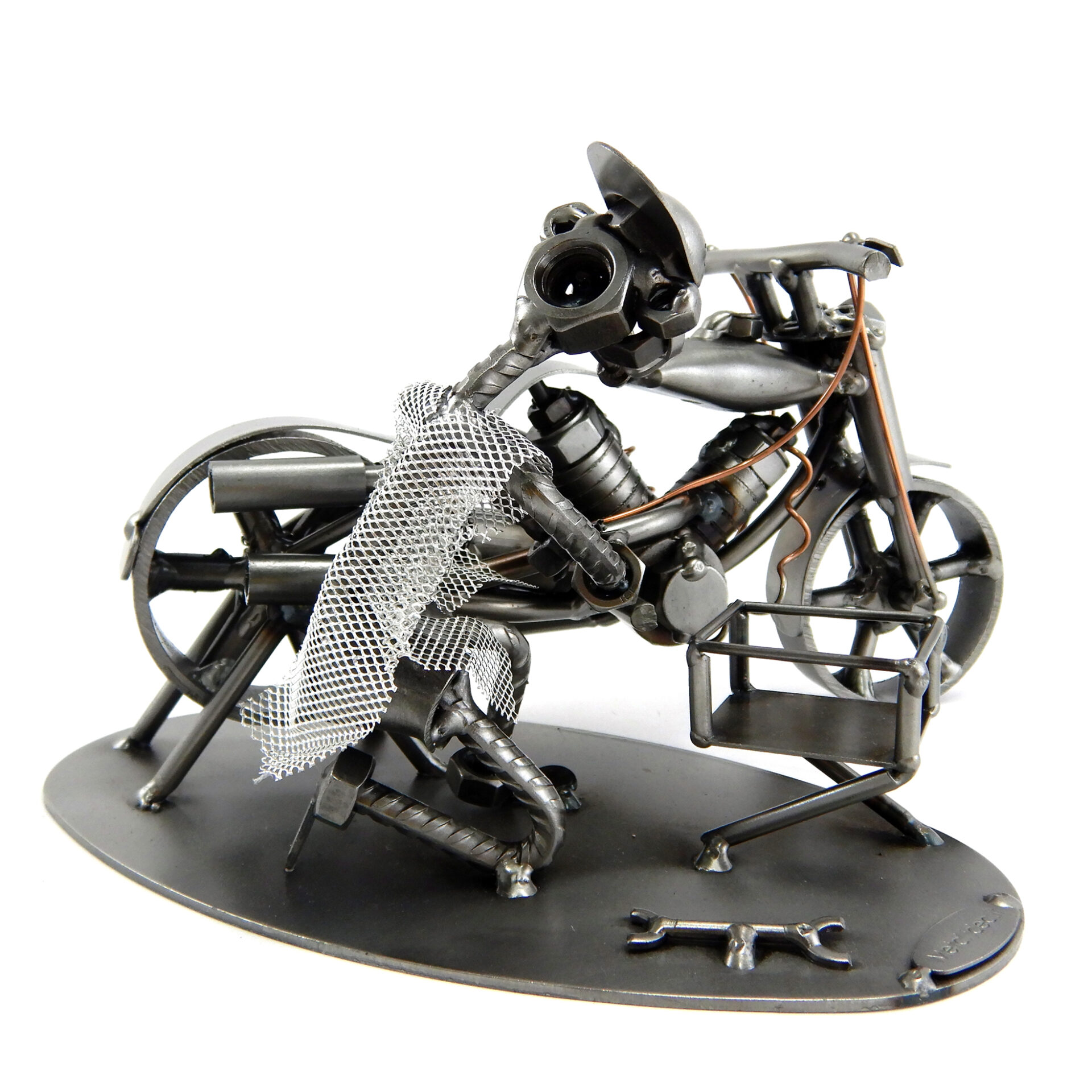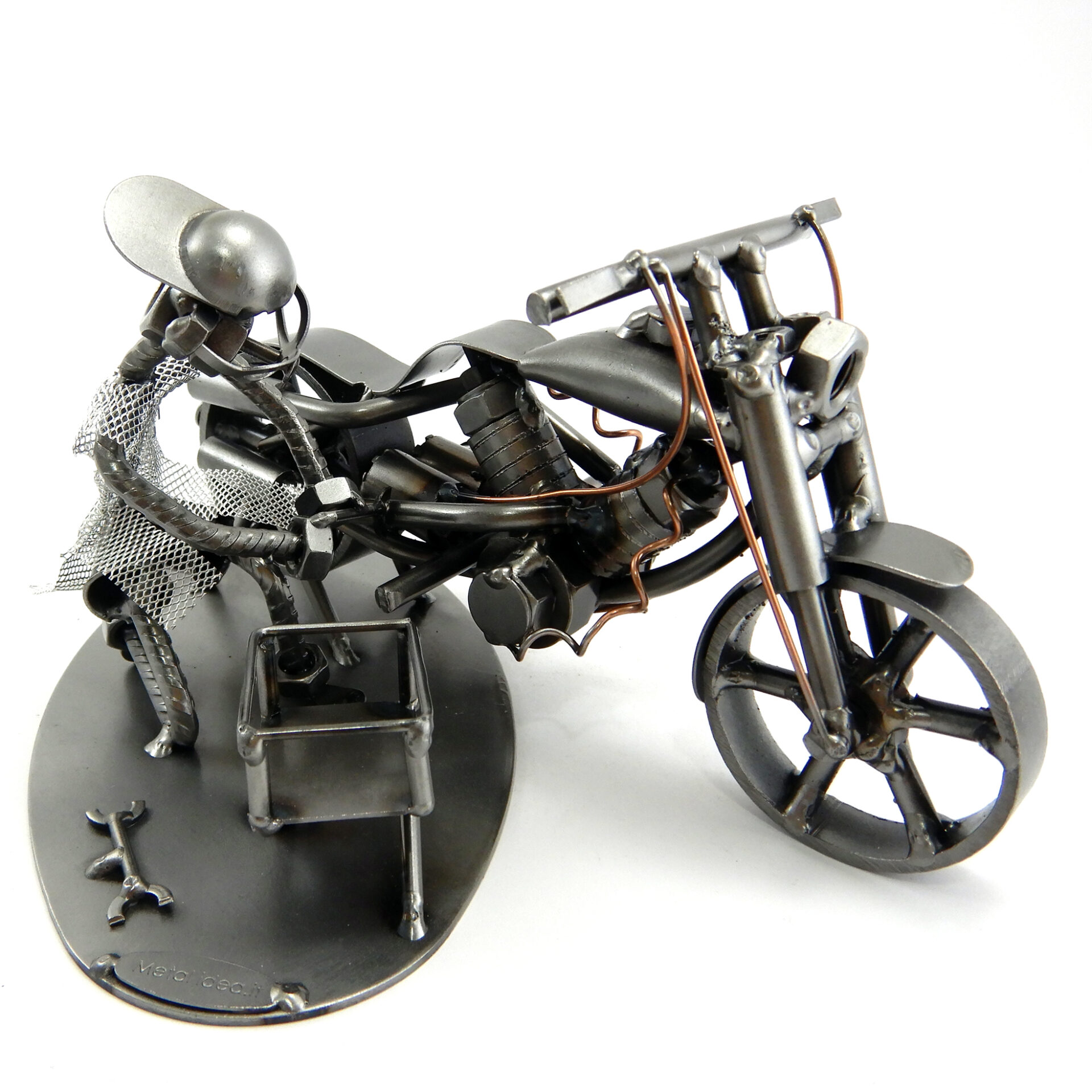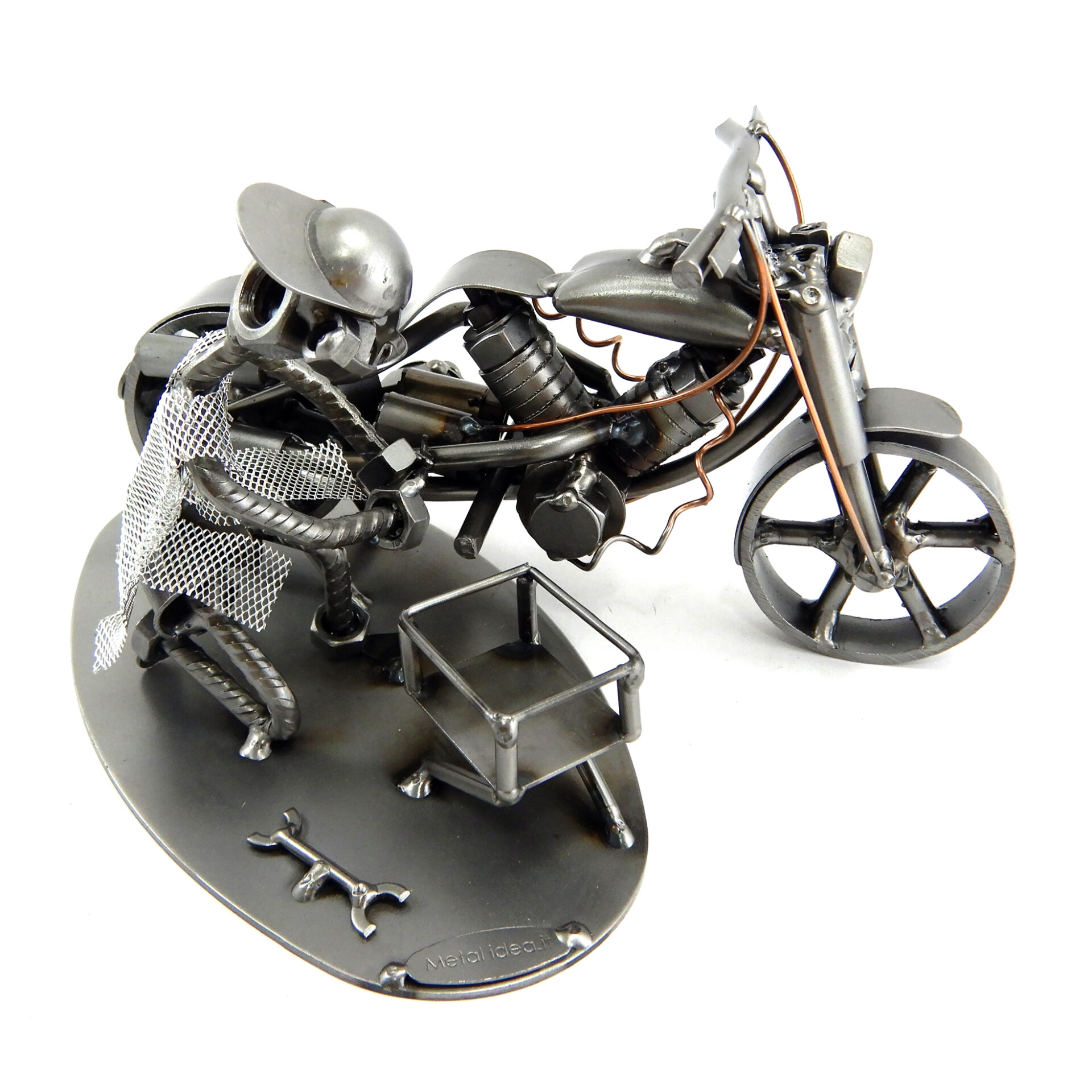 SCULTURA IN METALLO ARTIGIANALE RAFFIGURANTE IL MECCANICO DI MOTO o COLUI CHE HA LA PASSIONE PER LA PRORIA MOTO