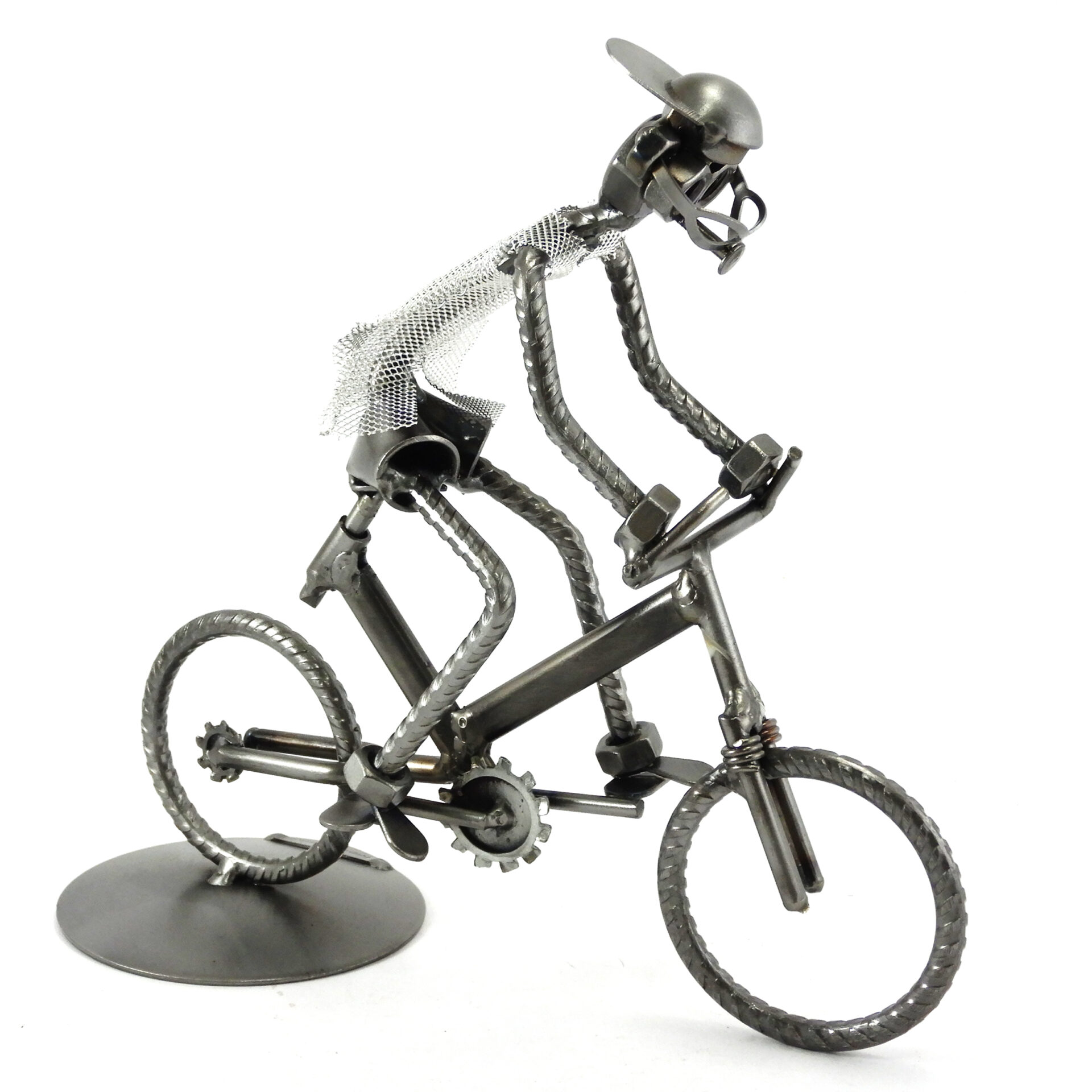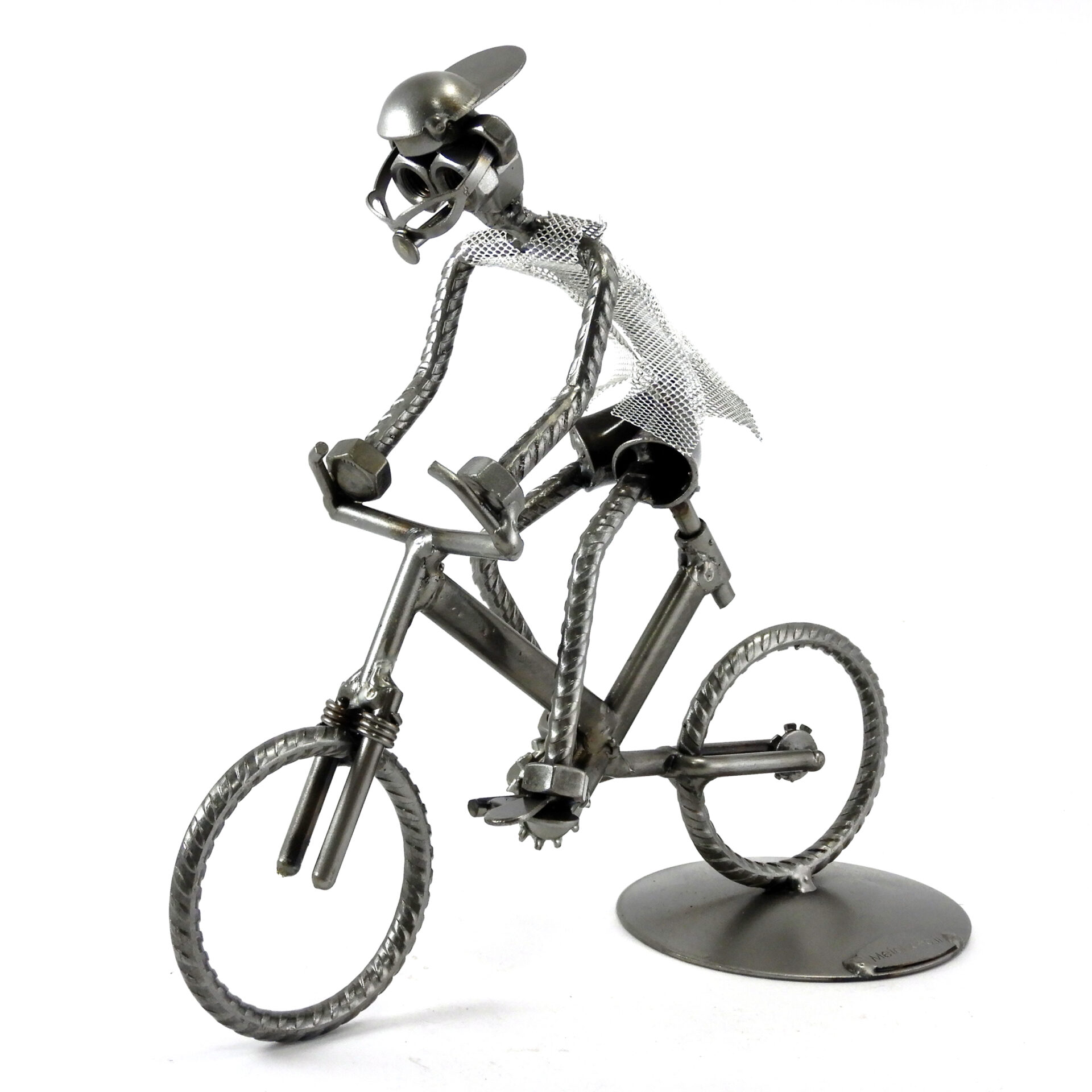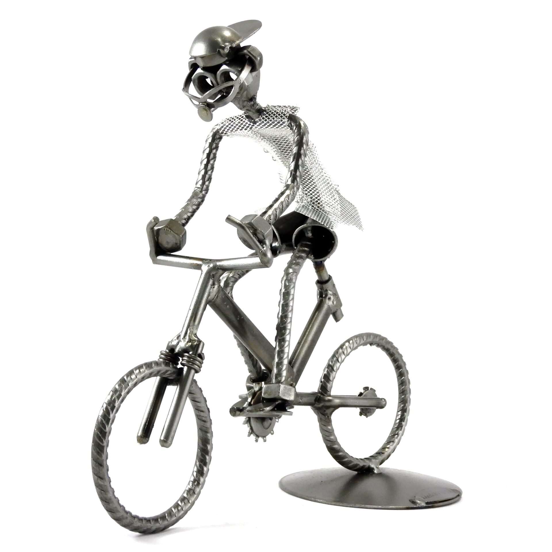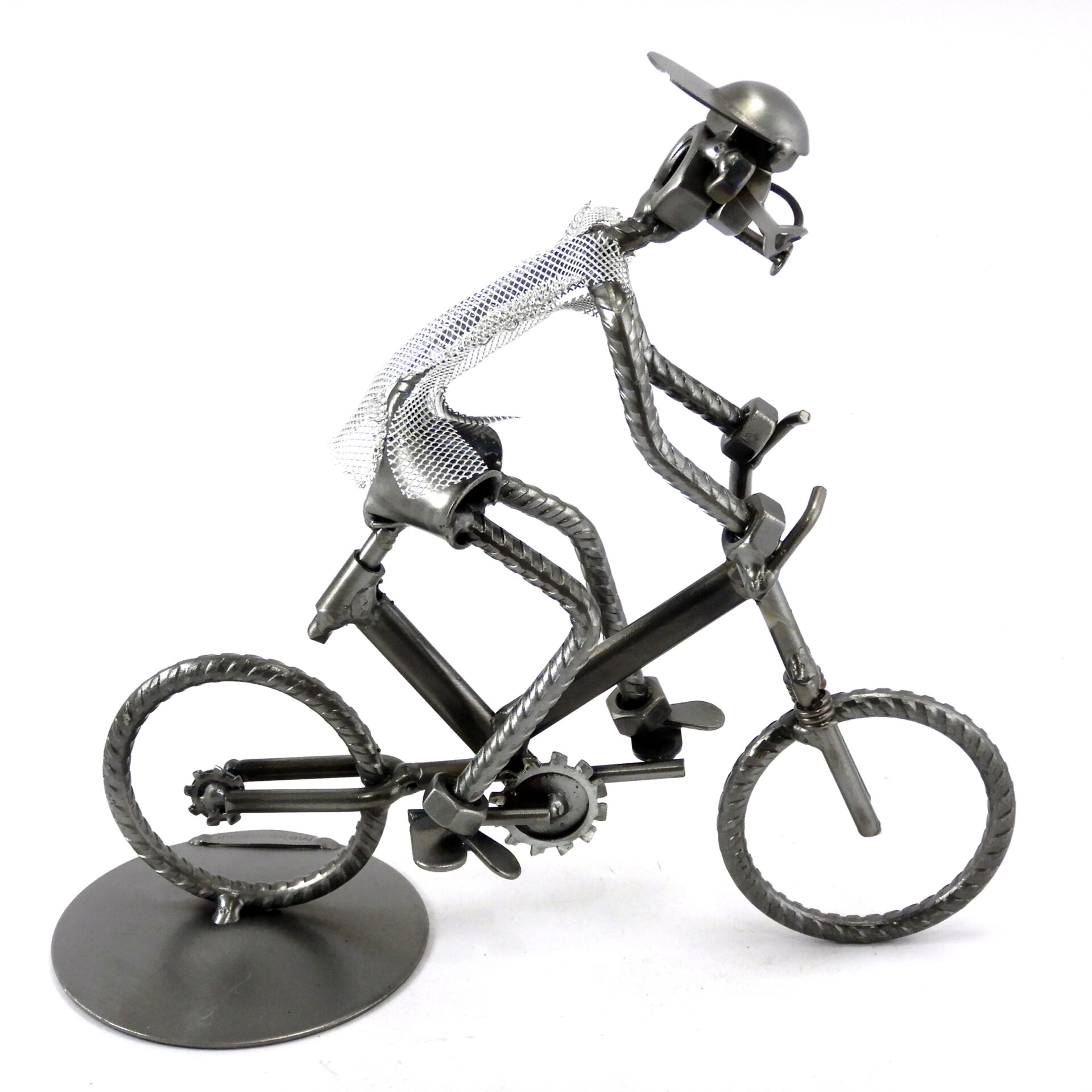 SCULTURA IN METALLO ARTIGIANALE RAFFIGURANTE IL CICLISTA SU BICICLETTA TIPO MOUNTAIN BIKE