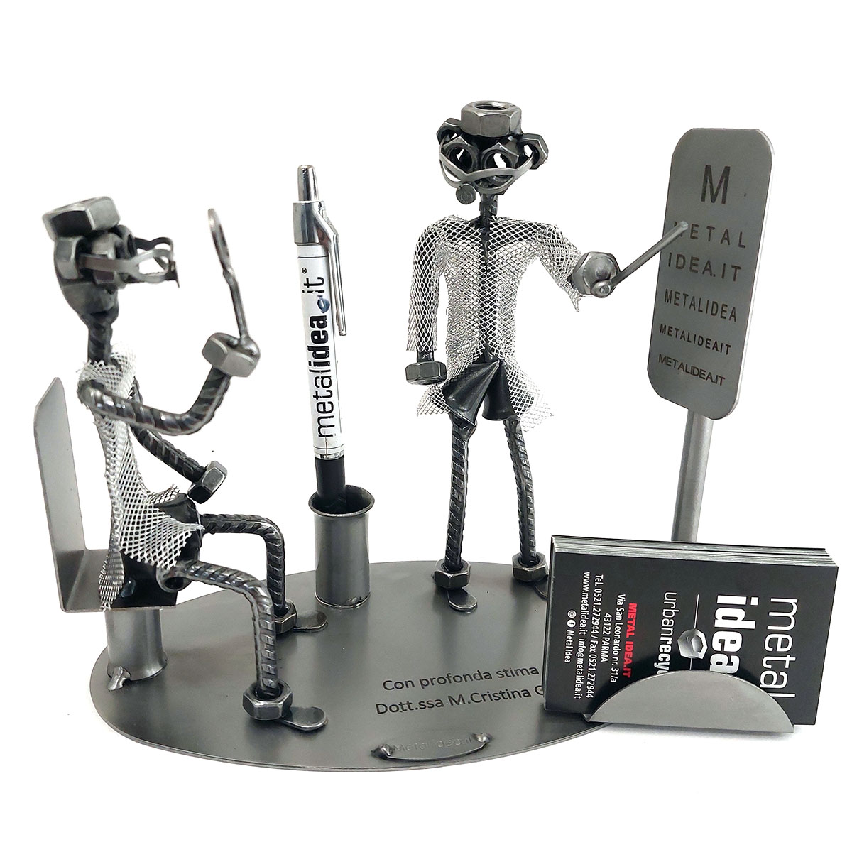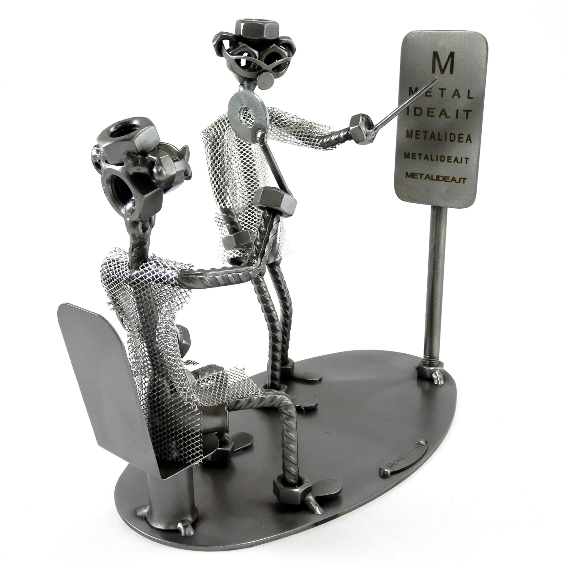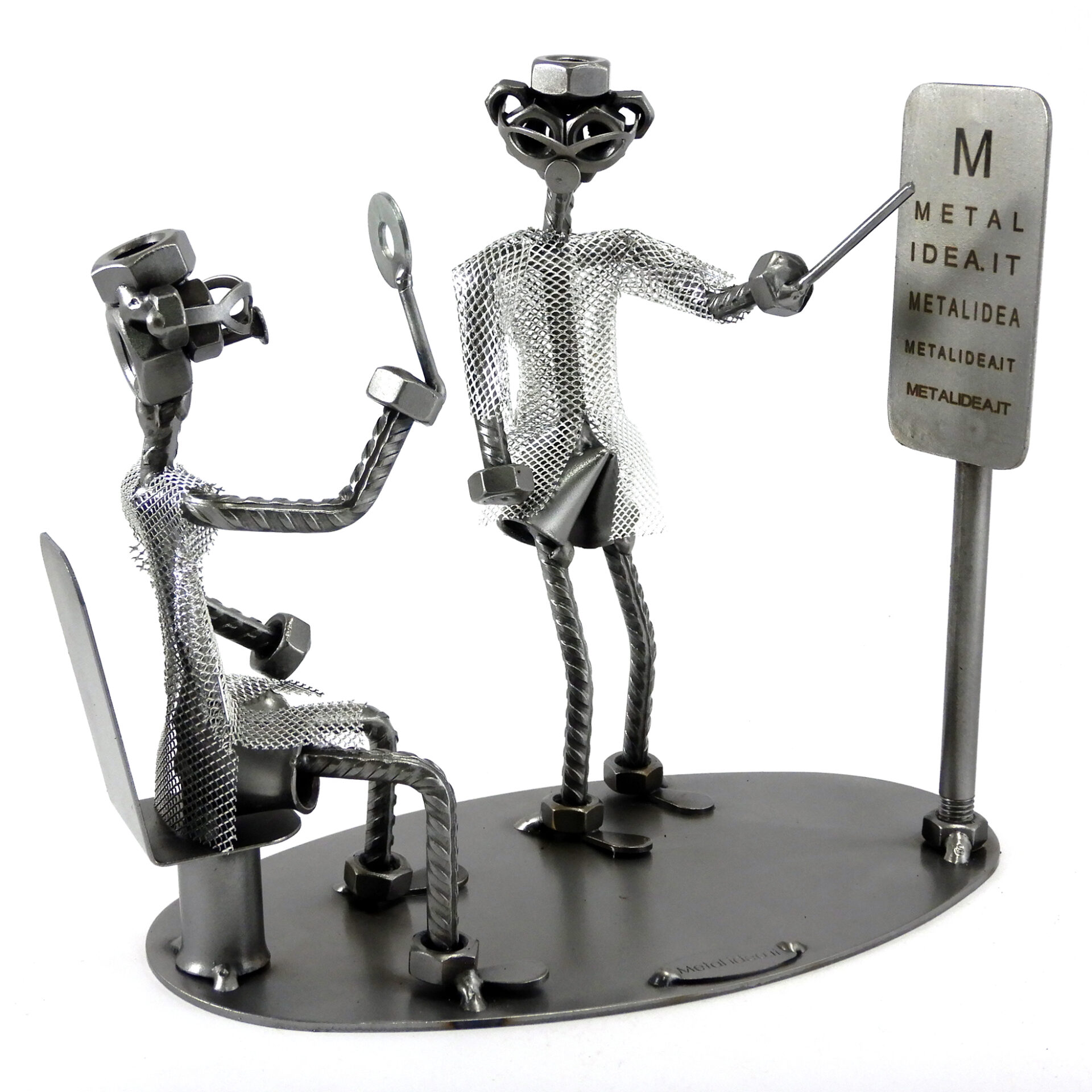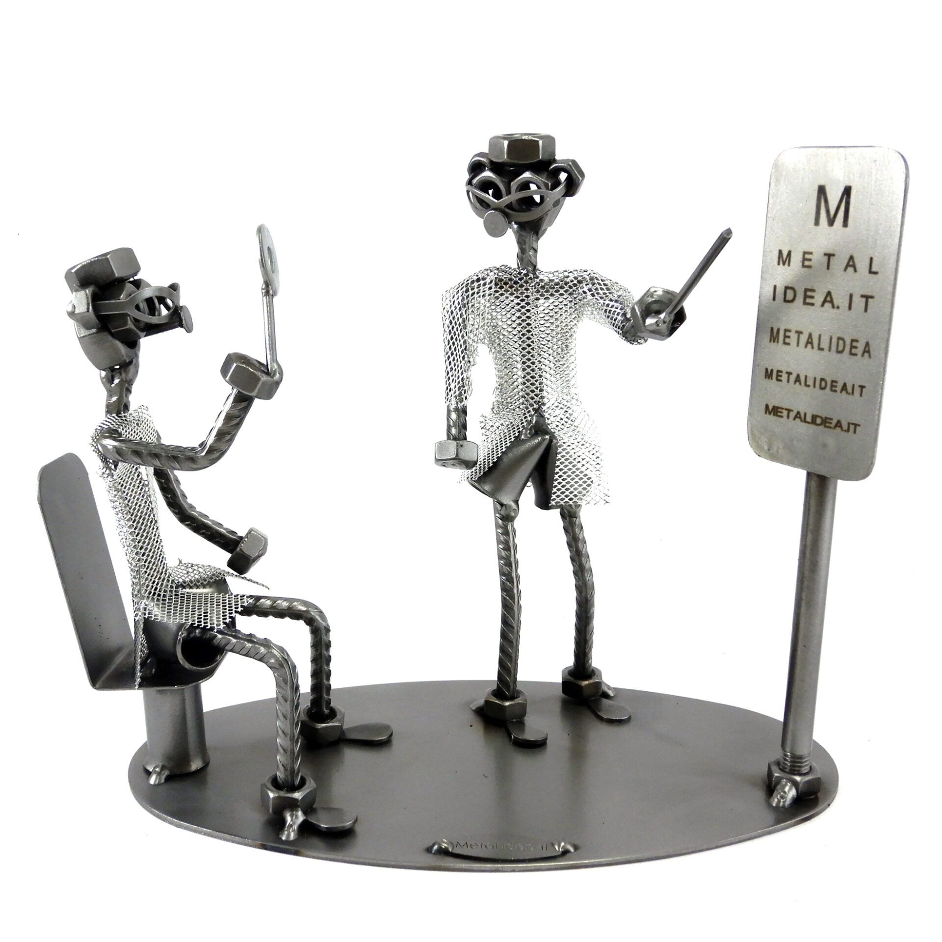SCULTURA IN METALLO ARTIGIANALE RAFFIGURANTE IL MEDICO OCULISTA CON PAZIENTE