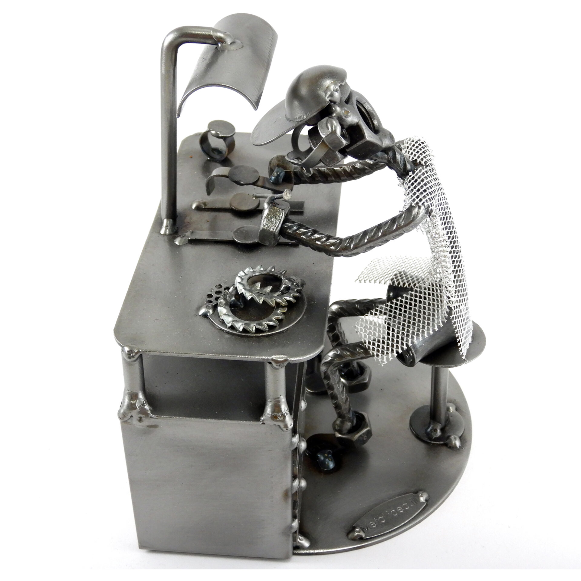 SCULTURA IN METALLO ARTIGIANALE RAFFIGURANTE L’OROLOGIAIO AL BANCO LAVORO