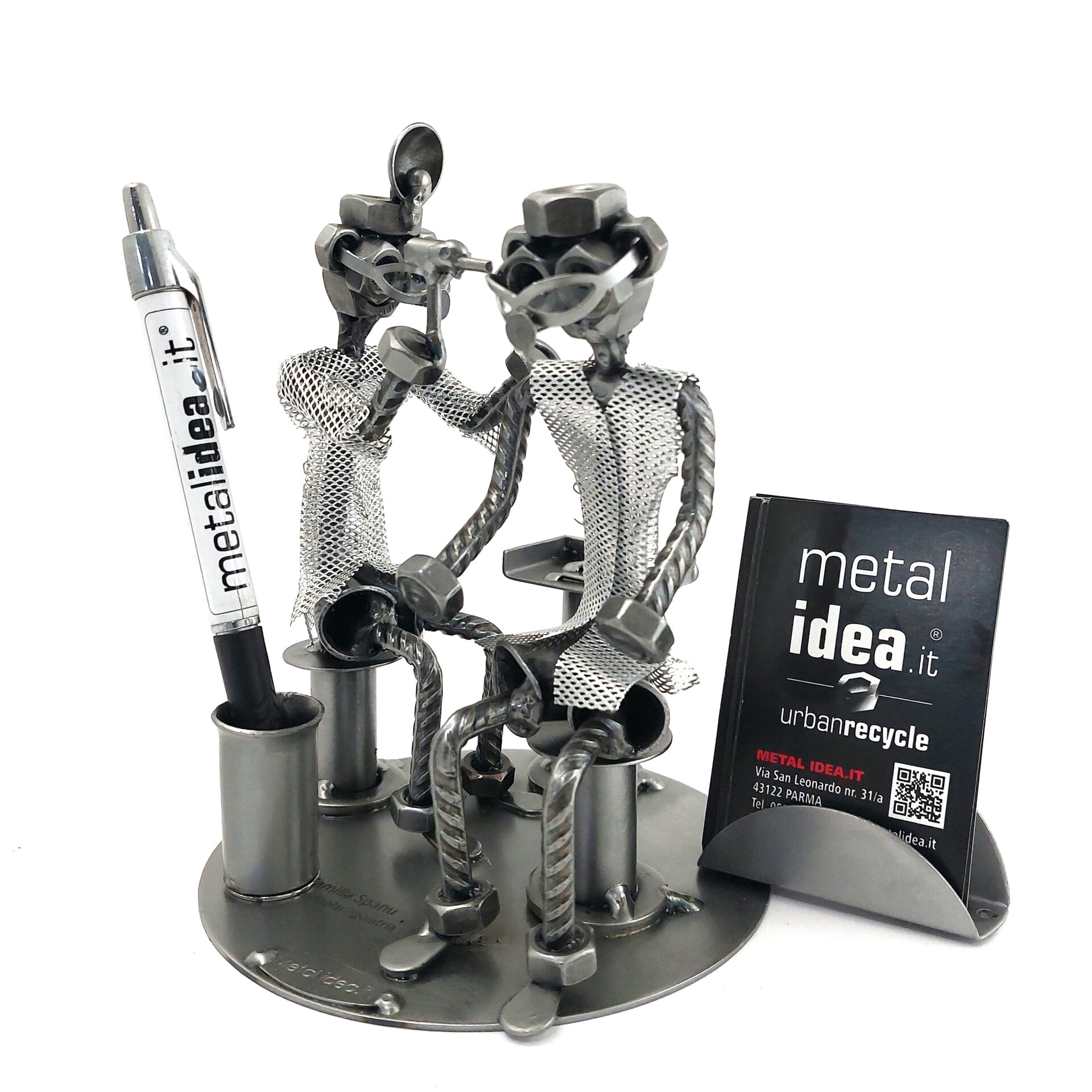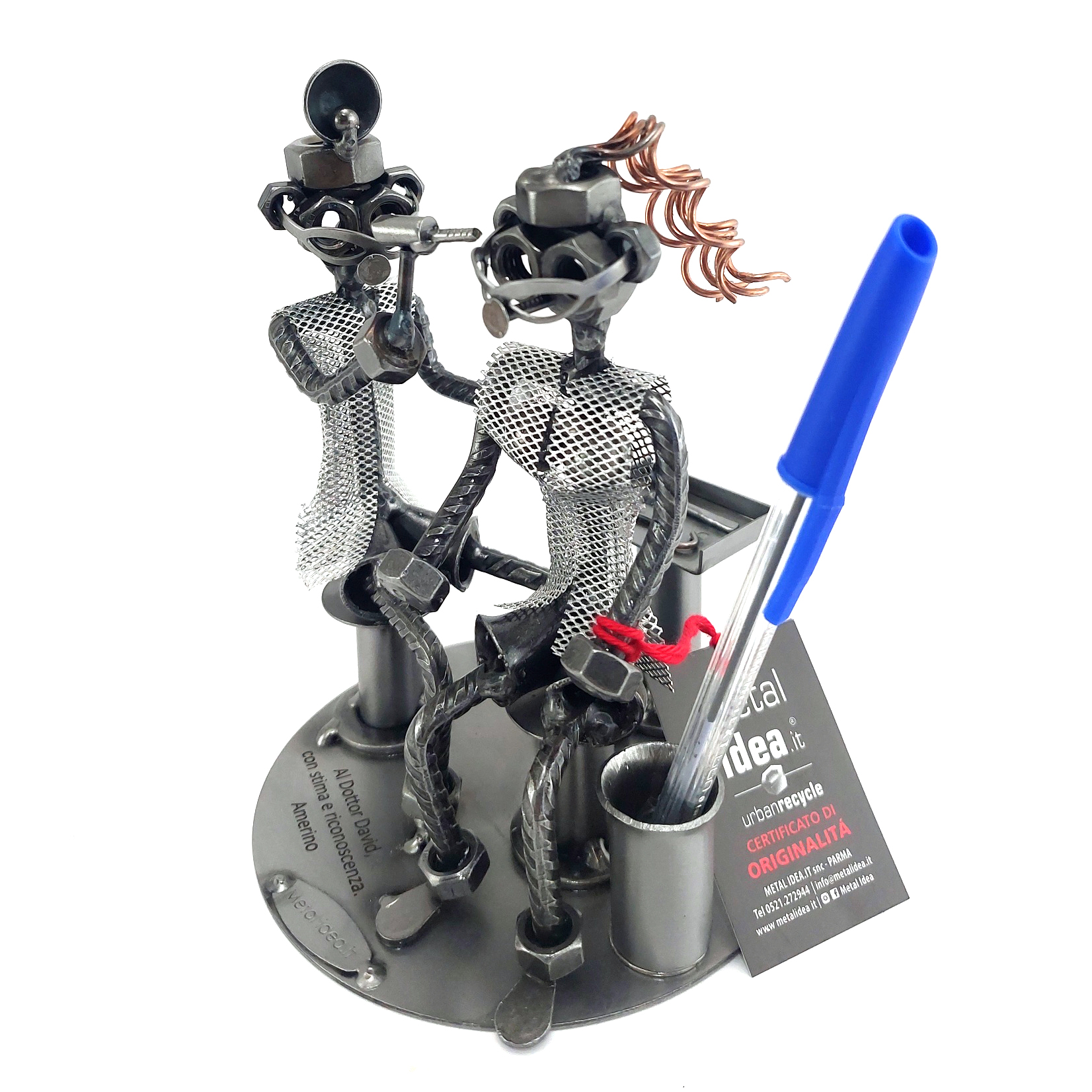 La nostra collezione di pezzi è caratterizzata da un moderno ed originale design “made in Italy”, firmato METAL IDEA.IT®, marchio registrato. Siamo orgogliosi di offrire creazioni uniche e di qualità, perfette per ogni occasione, come compleanni, anniversari, pensionamenti, lauree, matrimoni, comunioni, cresime, premiazioni sportive e feste della mamma e del papà. E se stai cercando un regalo davvero speciale e unico, non cercare oltre: i nostri soggetti artigianali sono perfetti per te. Tieni presente che eventuali irregolarità o piccole imperfezioni non sono da ritenersi difetti, ma piuttosto autenticità della lavorazione artigianale.