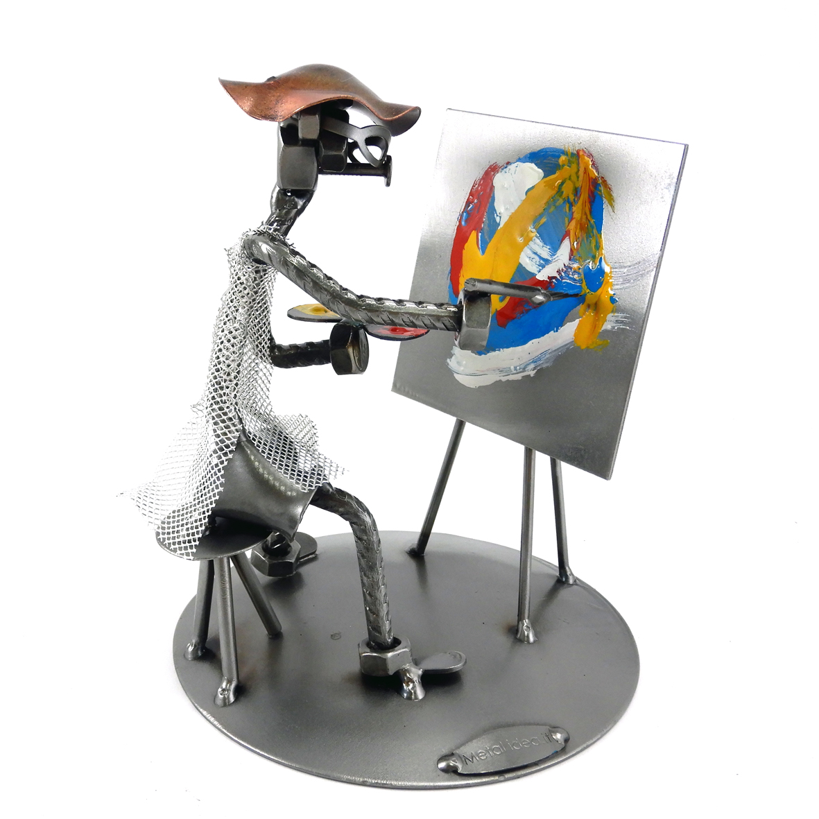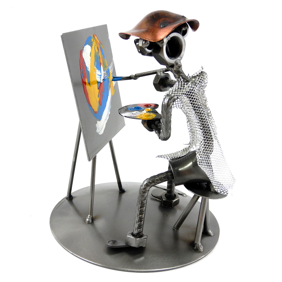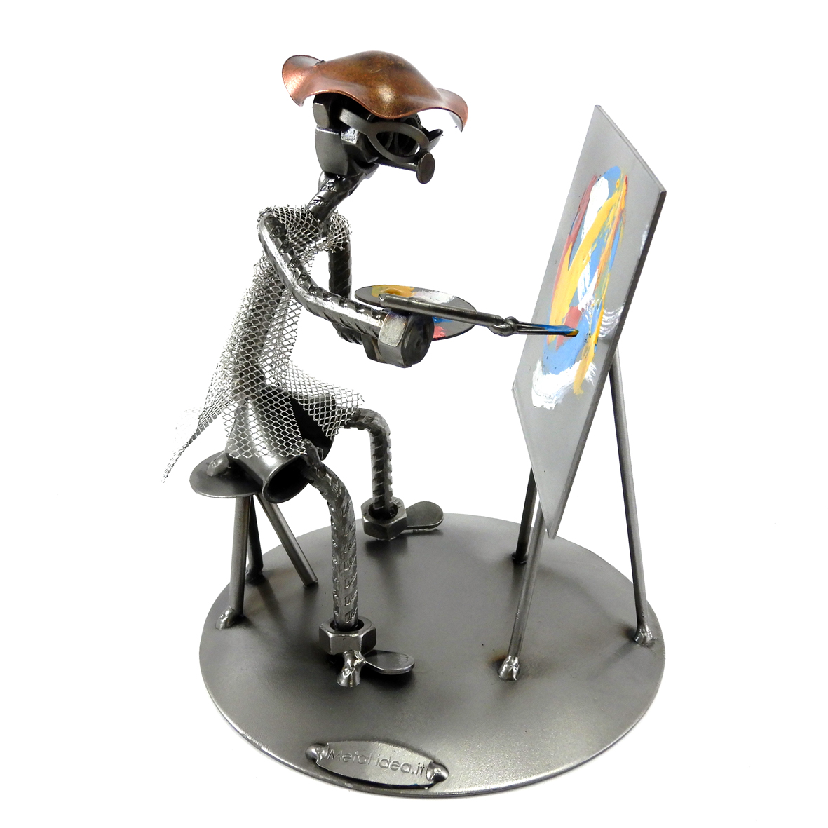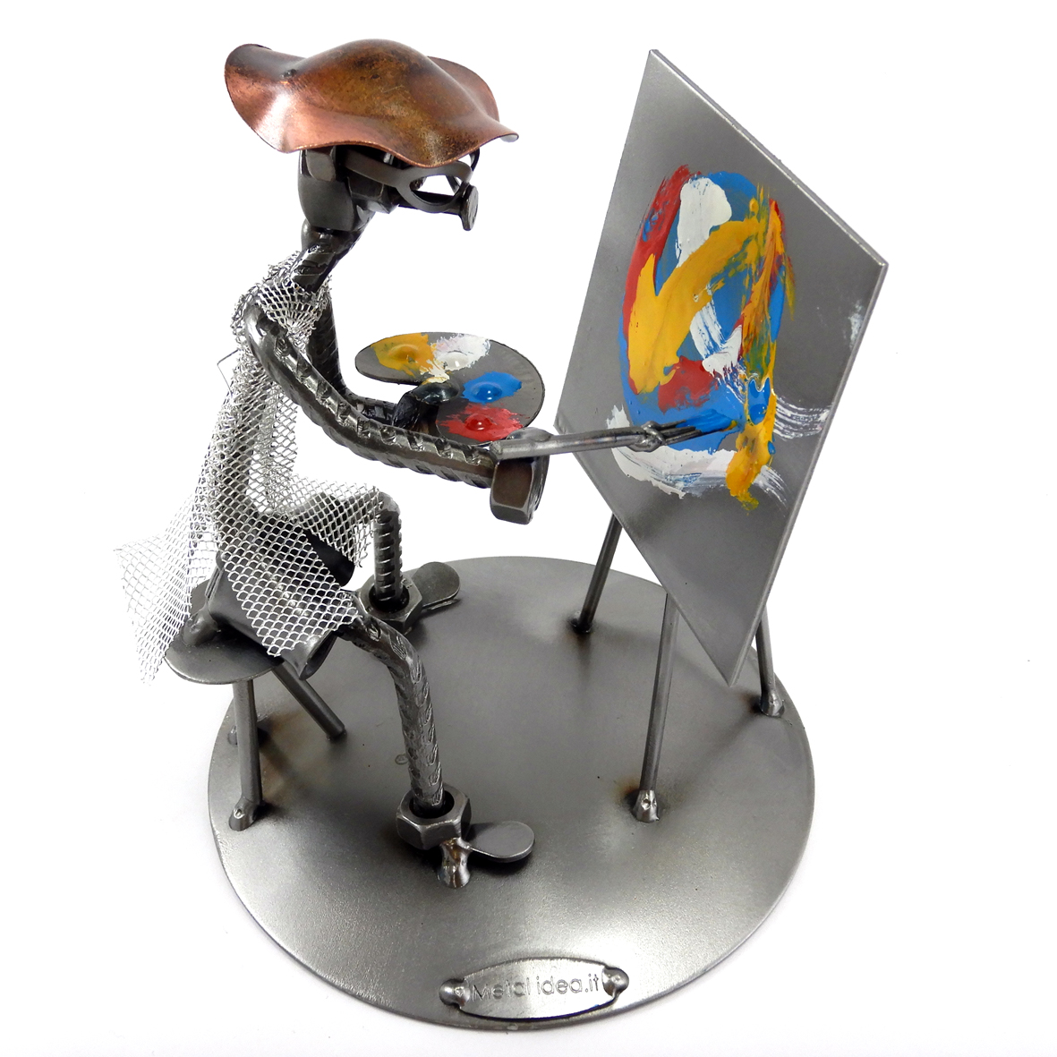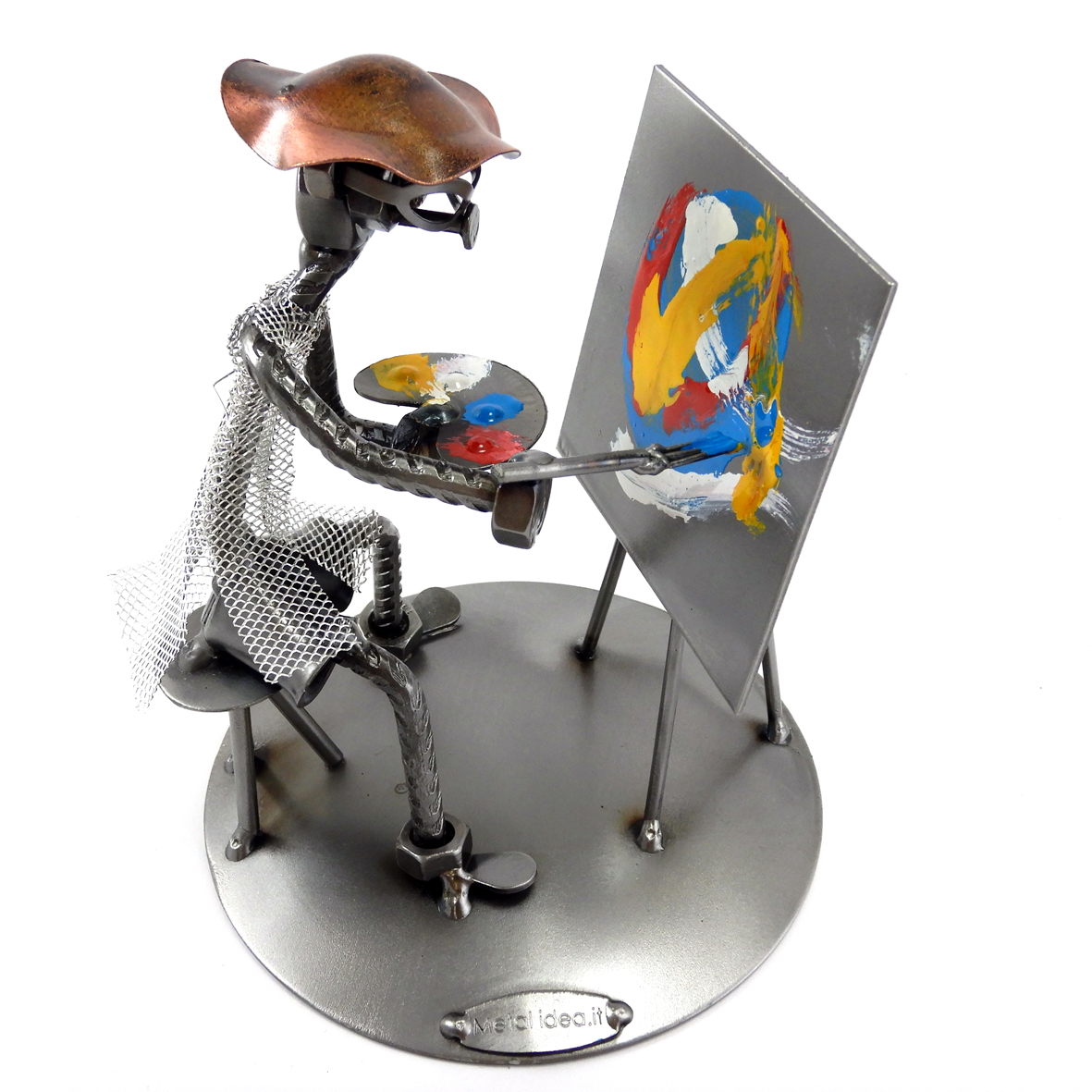 SCULTURA IN METALLO ARTIGIANALE RAFFIGURANTE IL PITTORE – ARTISTA CON TAVOLOZZA E QUADRO ASTRATTO