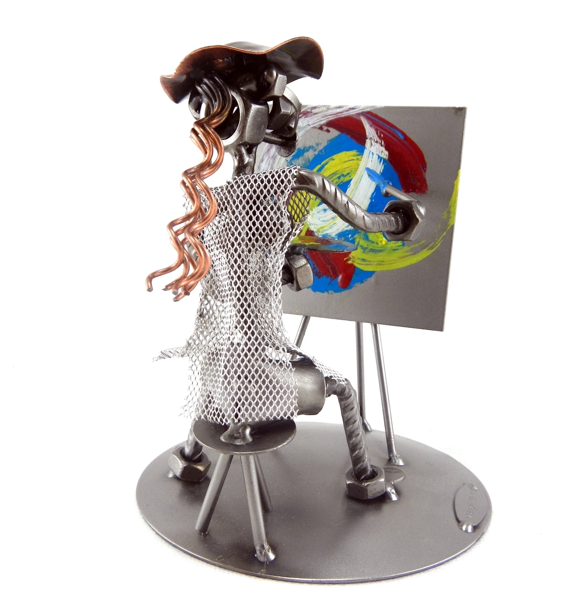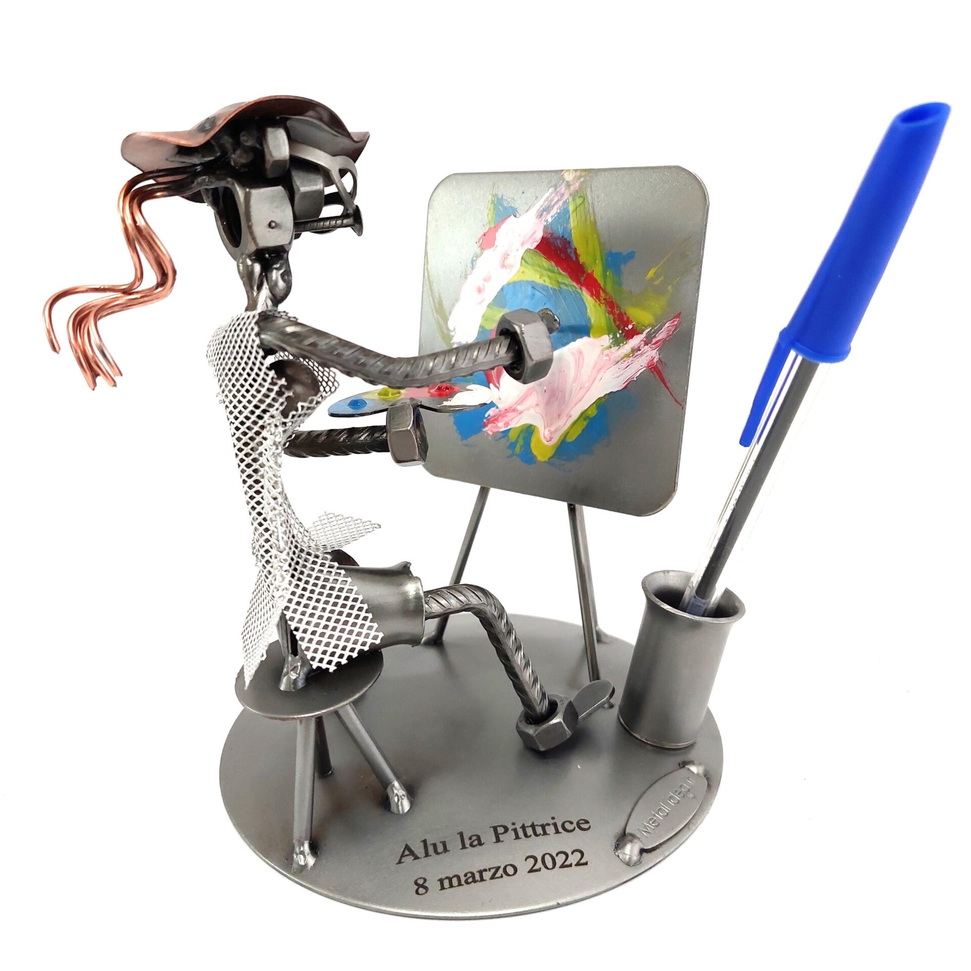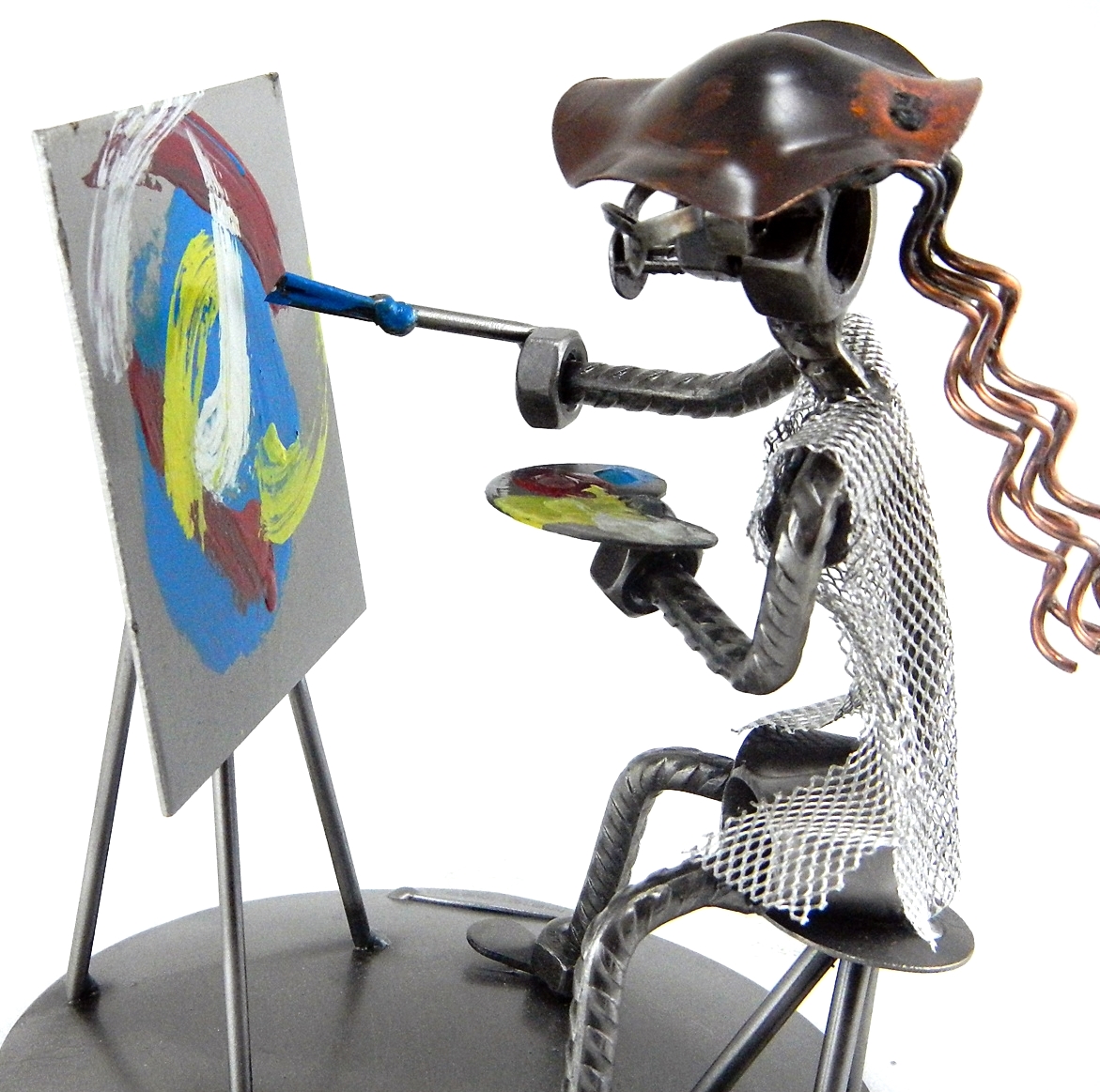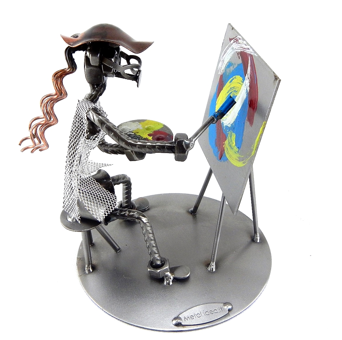 SCULTURA IN METALLO ARTIGIANALE RAFFIGURANTE LA PITTRICE – ARTISTA CON TAVOLOZZA E QUADRO ASTRATTO