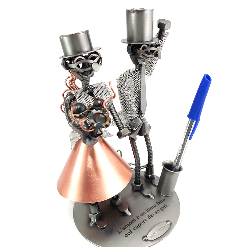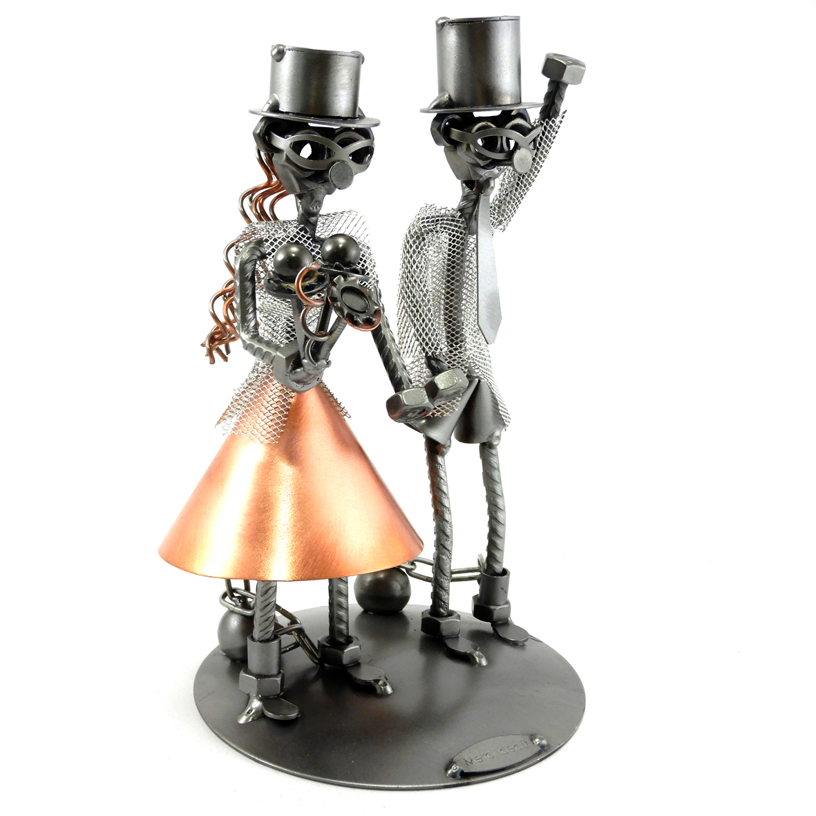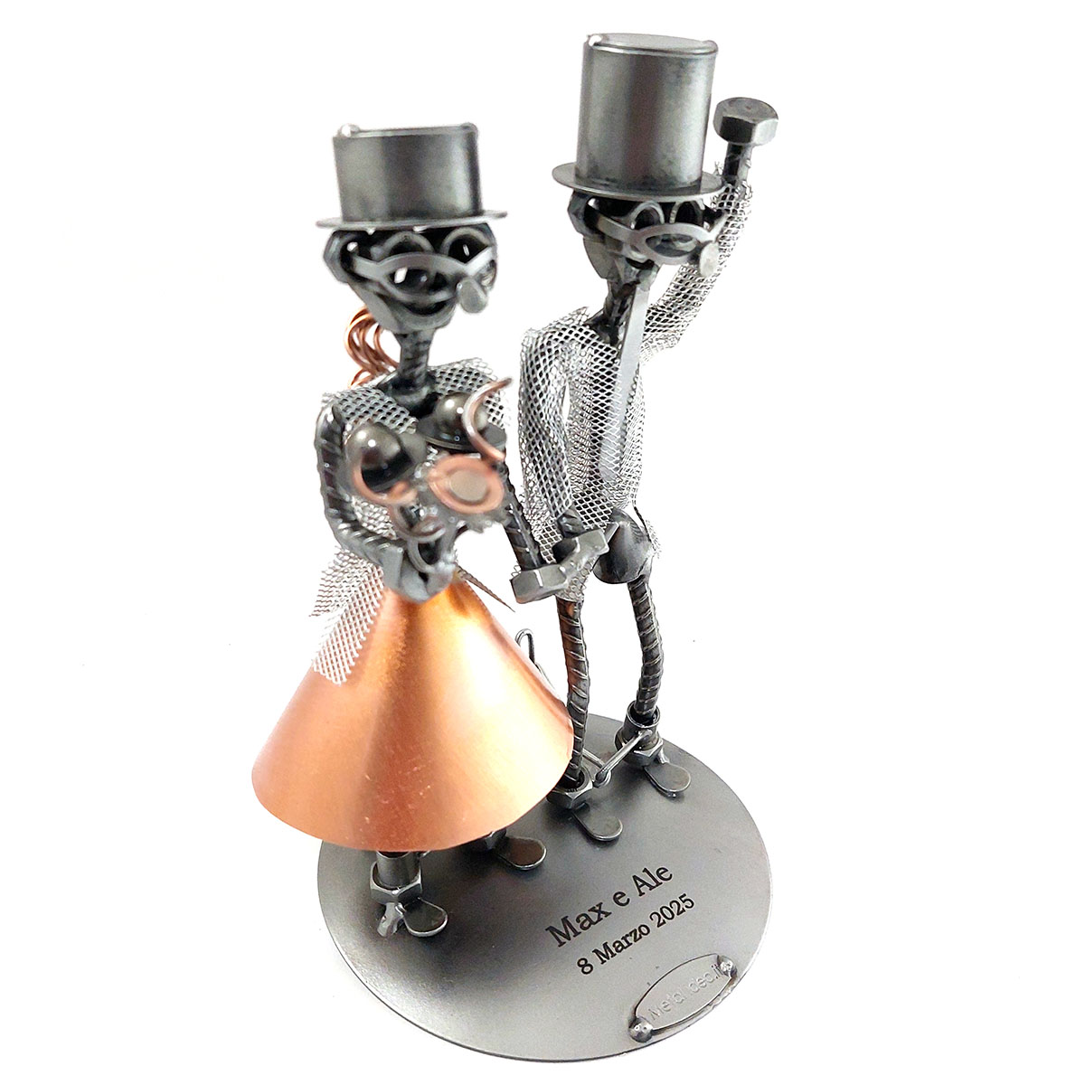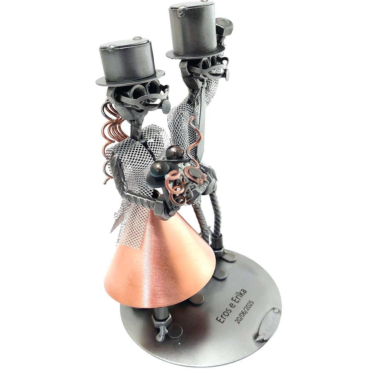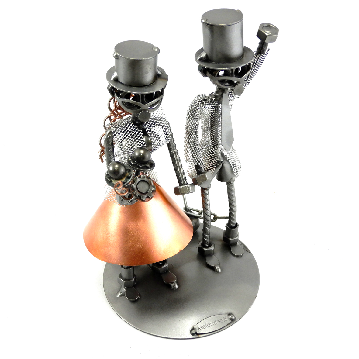 SCULTURA IN METALLO ARTIGIANALE RAFFIGURANTE MATRIMONIO, SPOSI con la palla al piede, bouquet di fiori e gonna in rame. Disponibile anche nella versione con cuore.