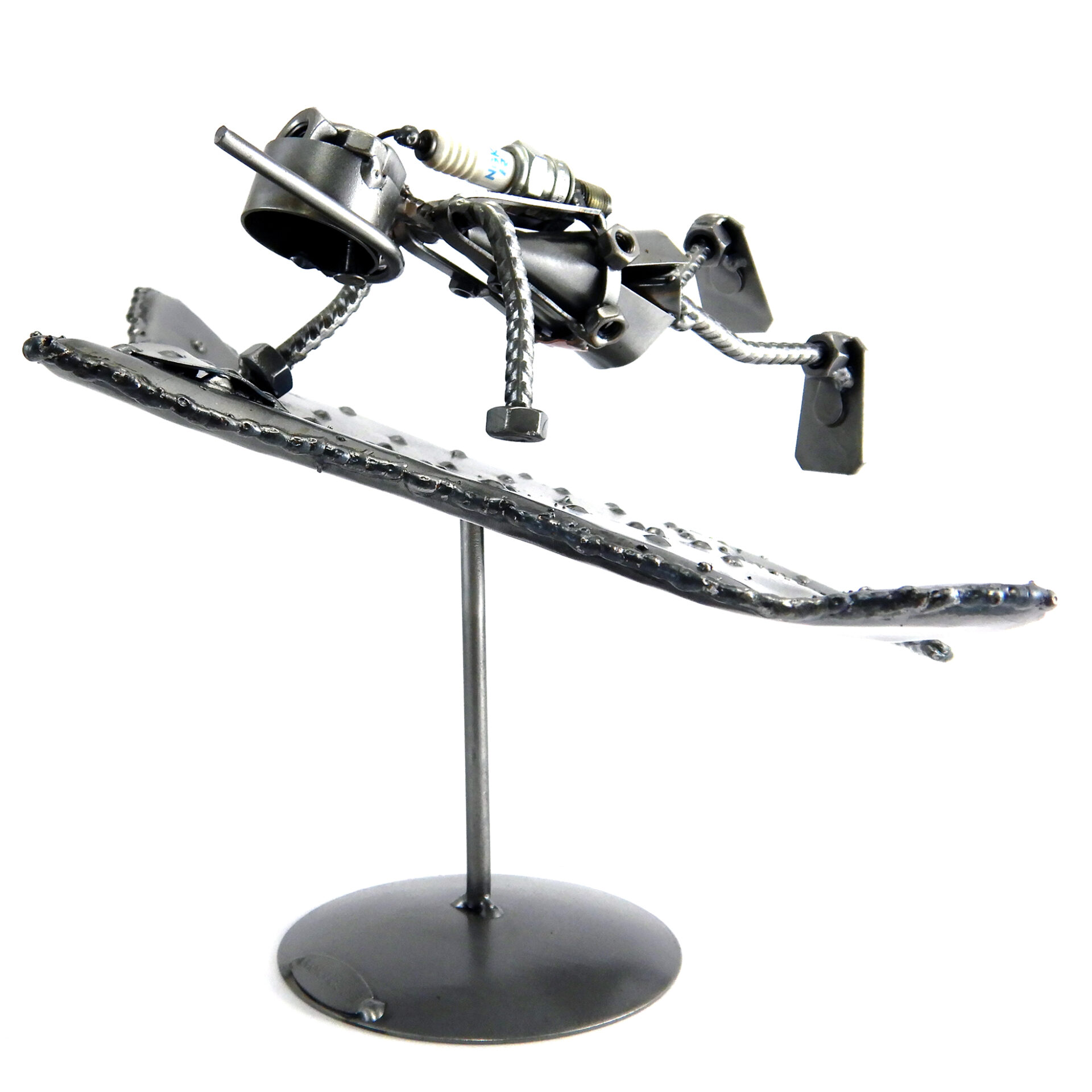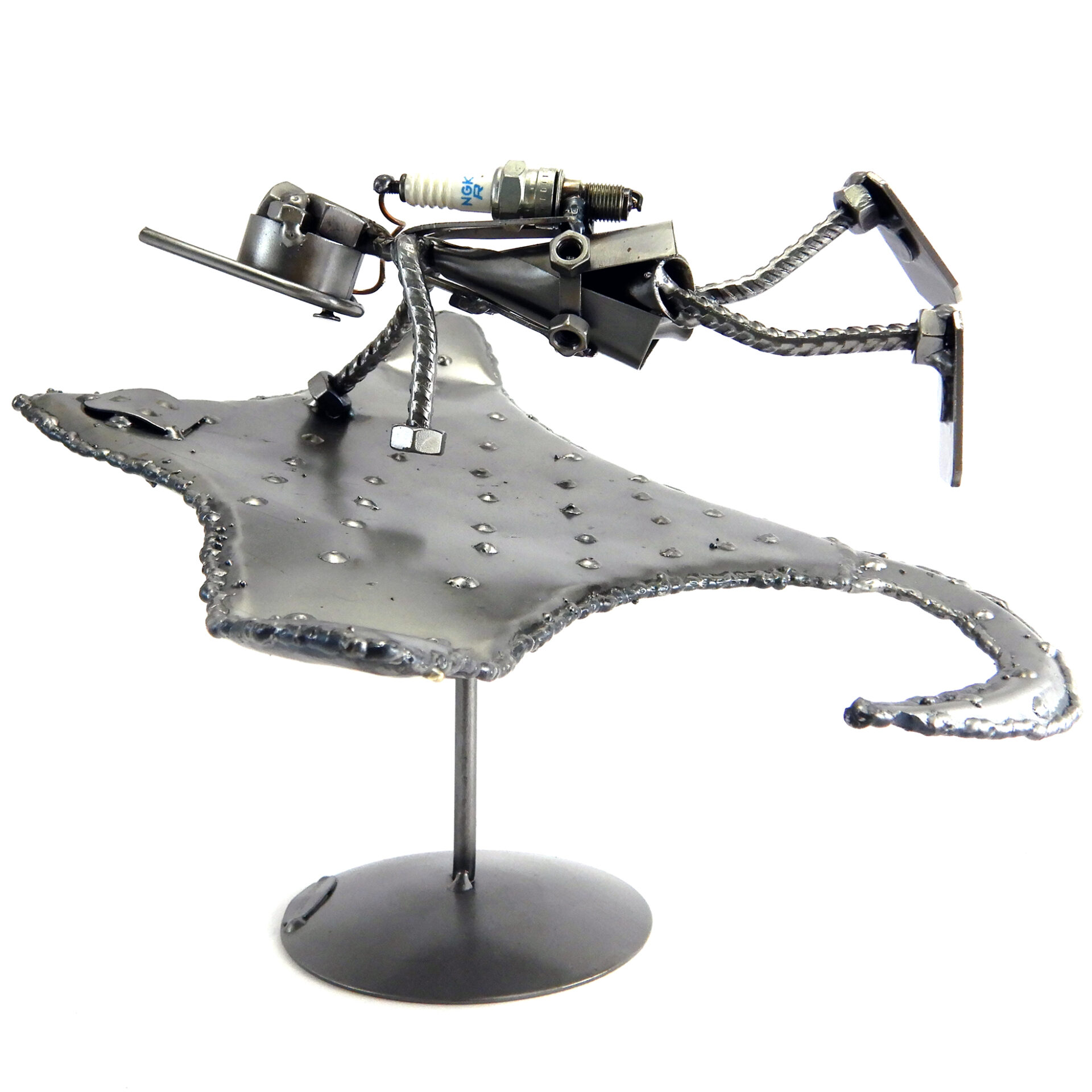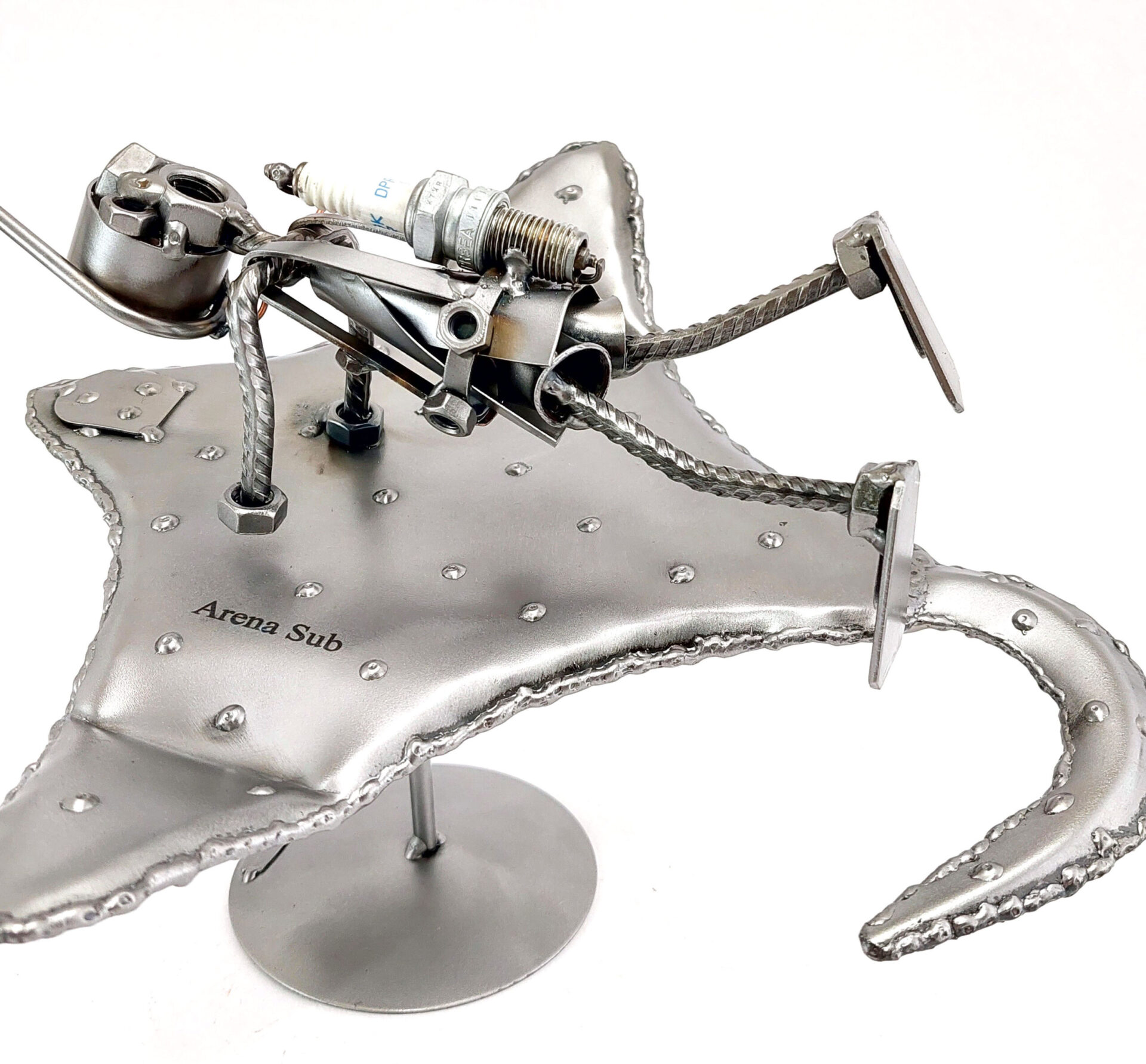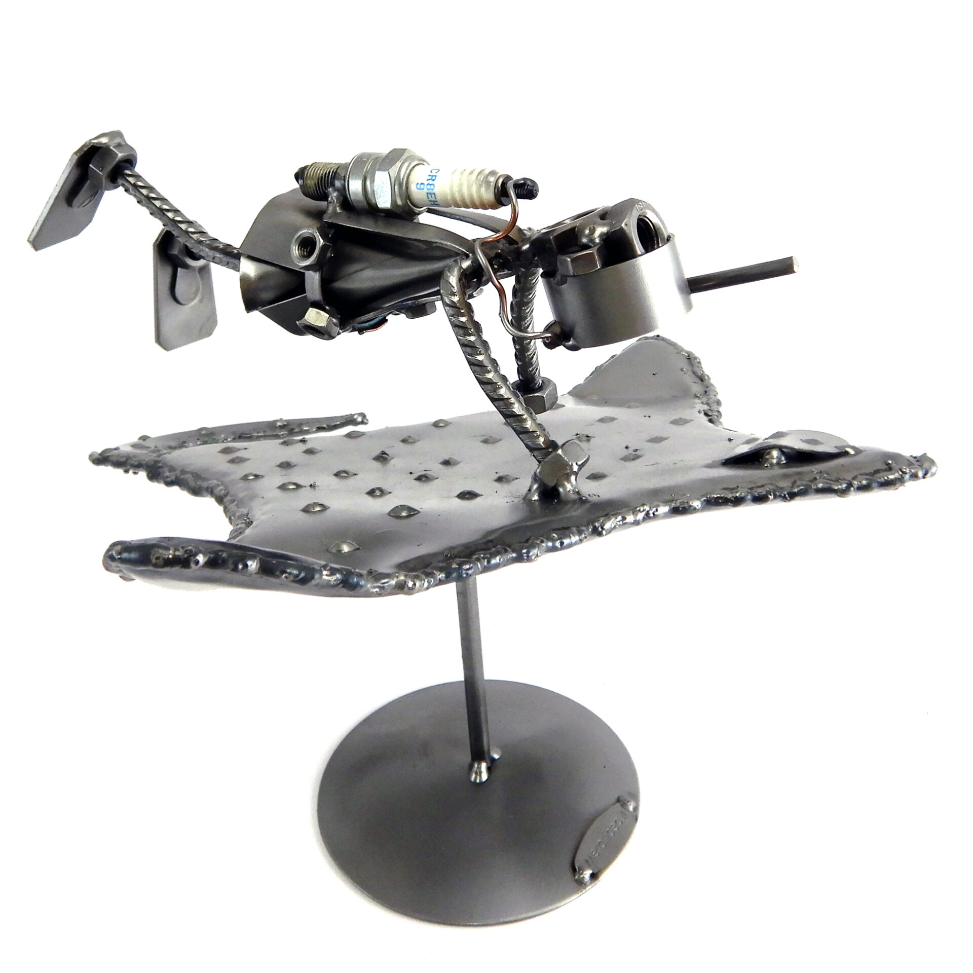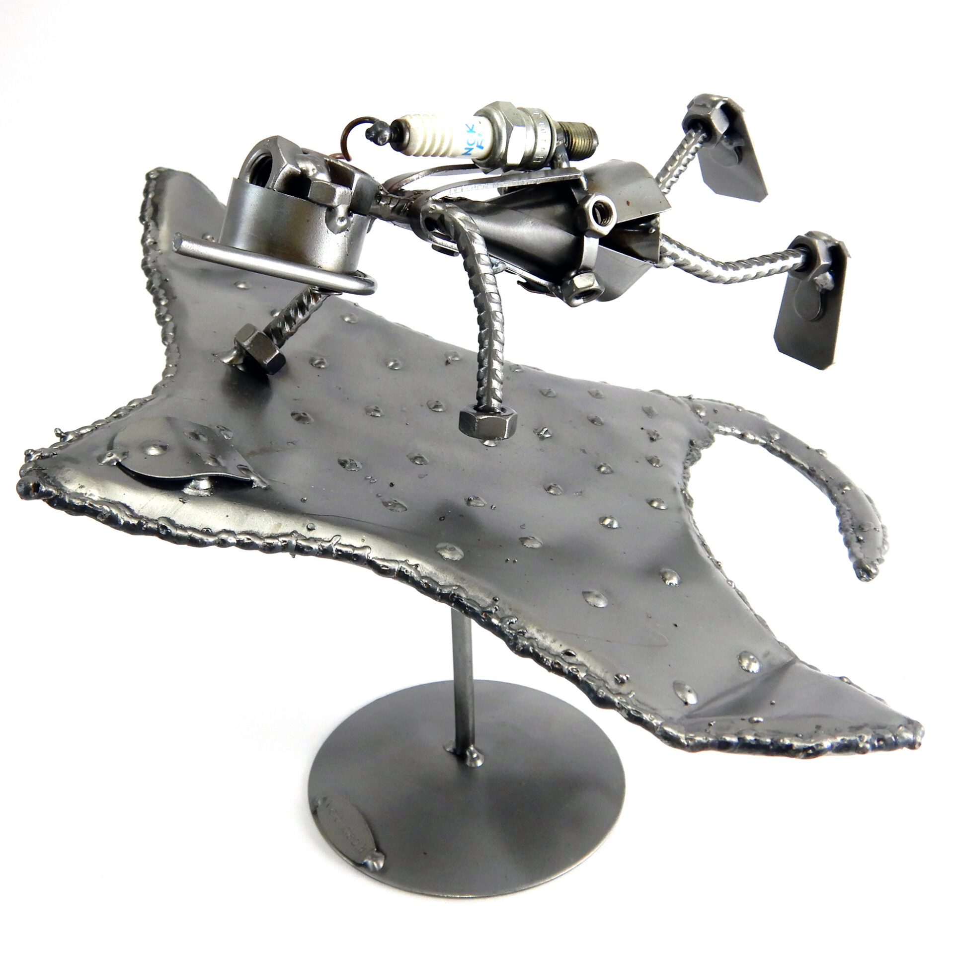 SCULTURA IN METALLO ARTIGIANALE RAFFIGURANTE IL SUB SU UNA MANTA – RAZZA, CON MASCHERA, BOCCAGLIO, PINNE, PESETTI ALLA CINTURA E LA BOMBOLA REALIZZATA CON LA CANDELA DI UN’AUTO RICICLATA.