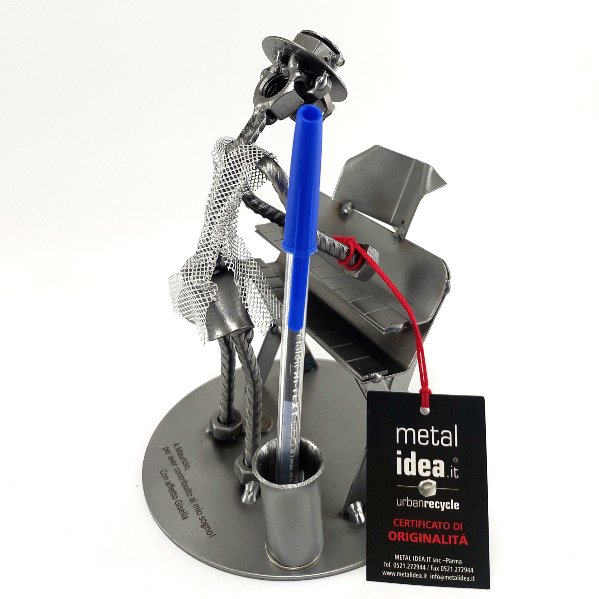 La nostra collezione di pezzi è caratterizzata da un moderno ed originale design “made in Italy”, firmato METAL IDEA.IT®, marchio registrato. Siamo orgogliosi di offrire creazioni uniche e di qualità, perfette per ogni occasione, come compleanni, anniversari, pensionamenti, lauree, matrimoni, comunioni, cresime, premiazioni sportive e feste della mamma e del papà. E se stai cercando un regalo davvero speciale e unico, non cercare oltre: i nostri soggetti artigianali sono perfetti per te. Tieni presente che eventuali irregolarità o piccole imperfezioni non sono da ritenersi difetti, ma piuttosto autenticità della lavorazione artigianale.