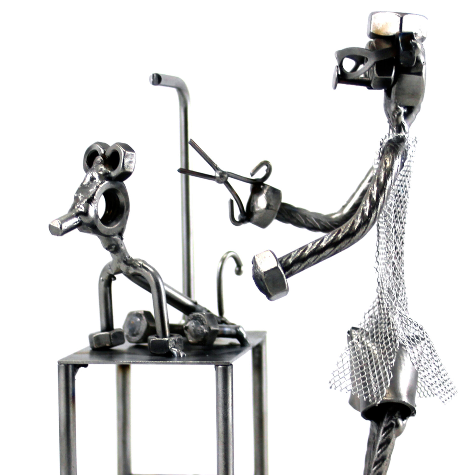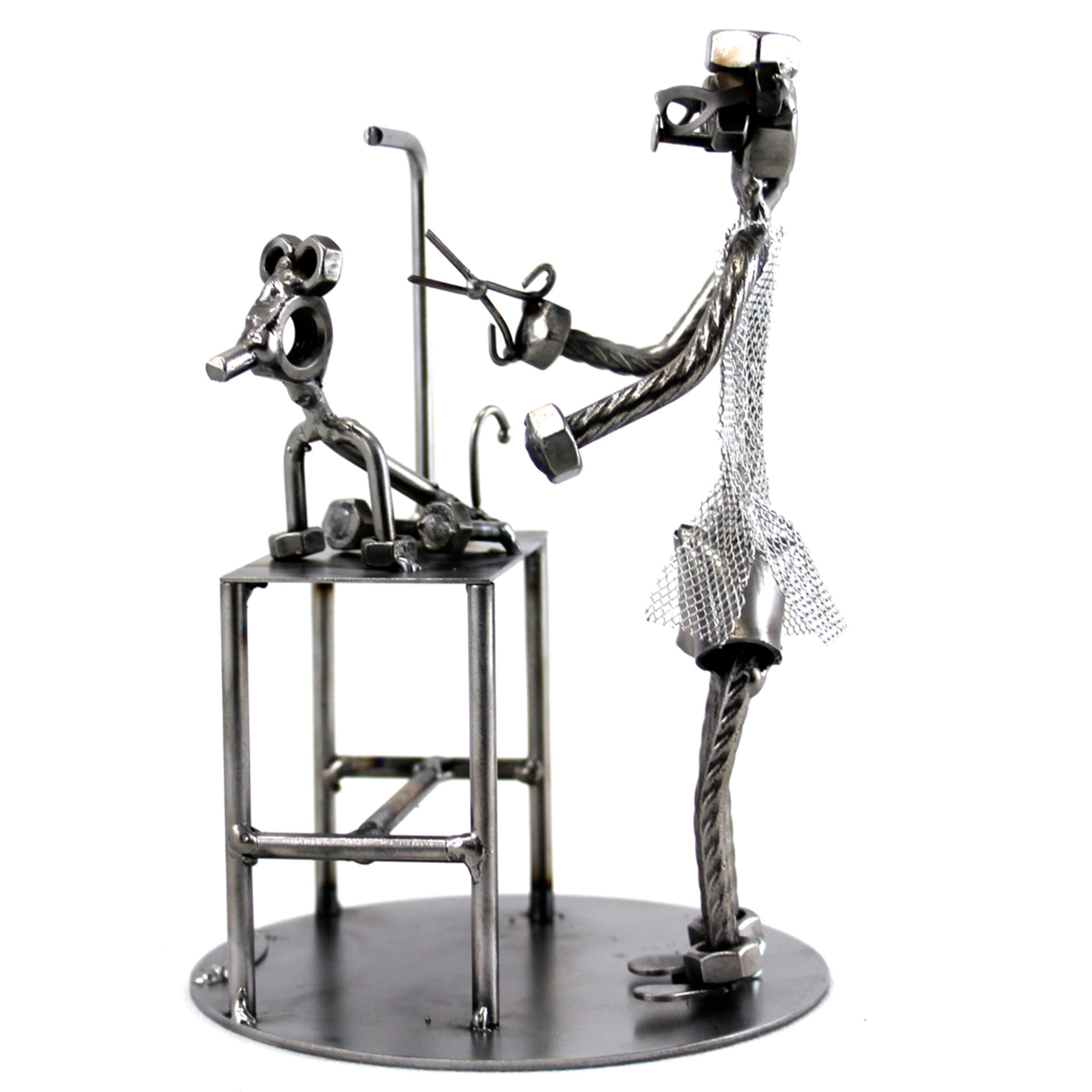 SCULTURA IN METALLO ARTIGIANALE RAFFIGURANTE IL TOELETTATORE CON CAGNOLINO