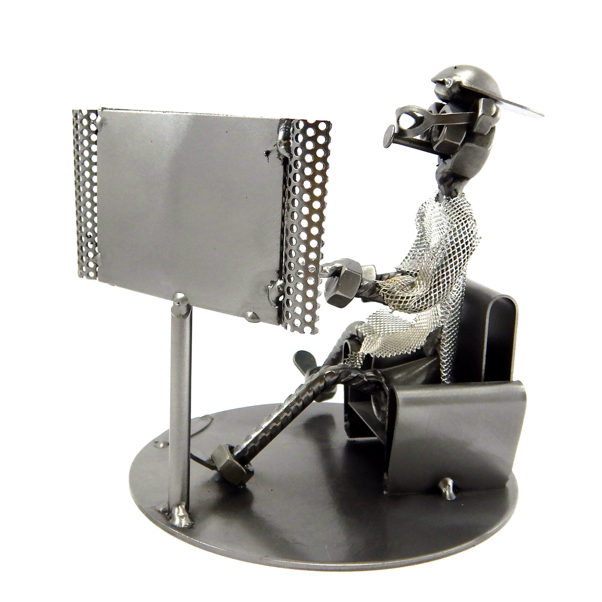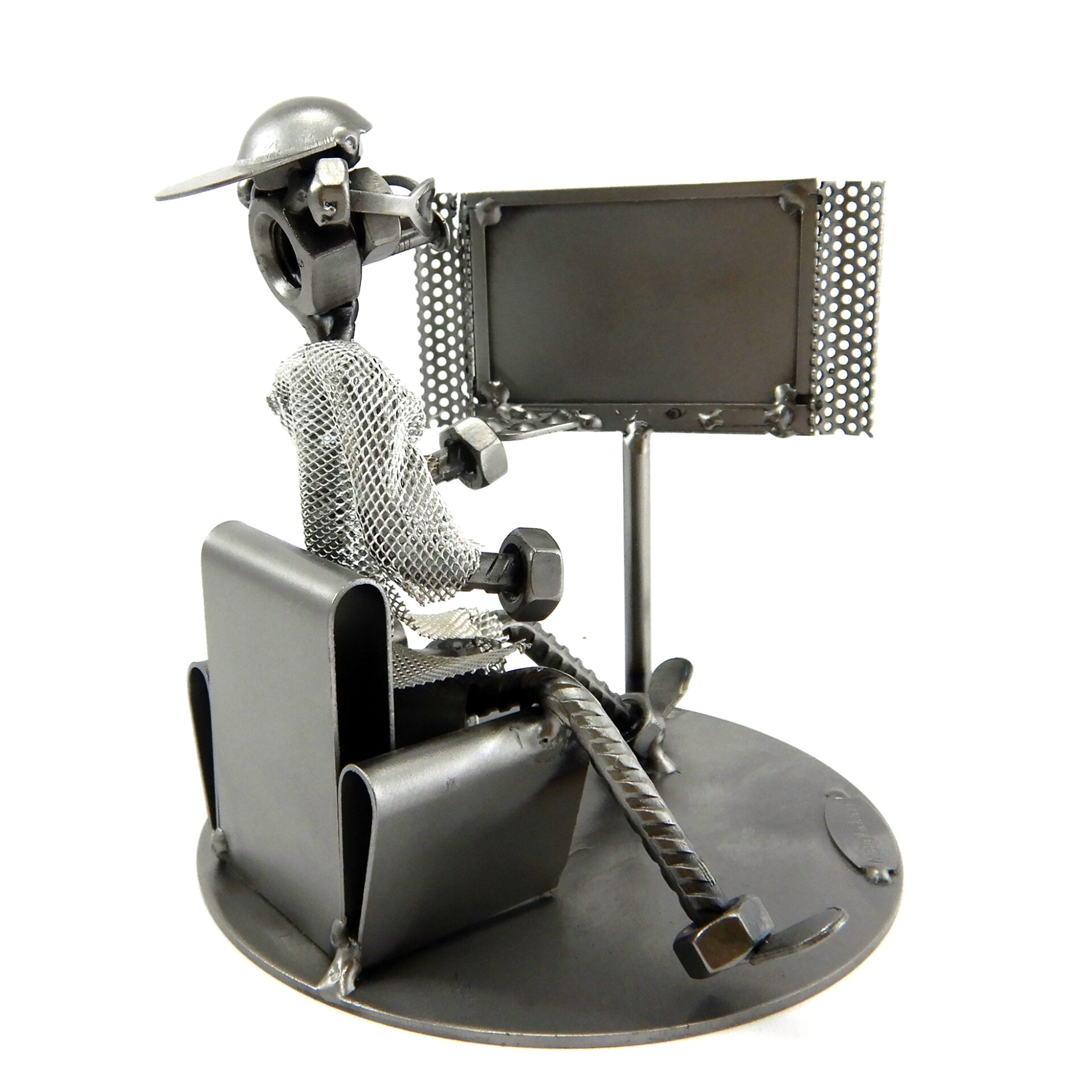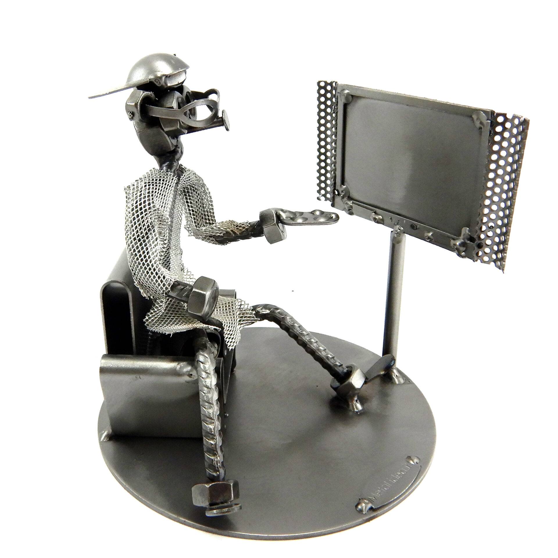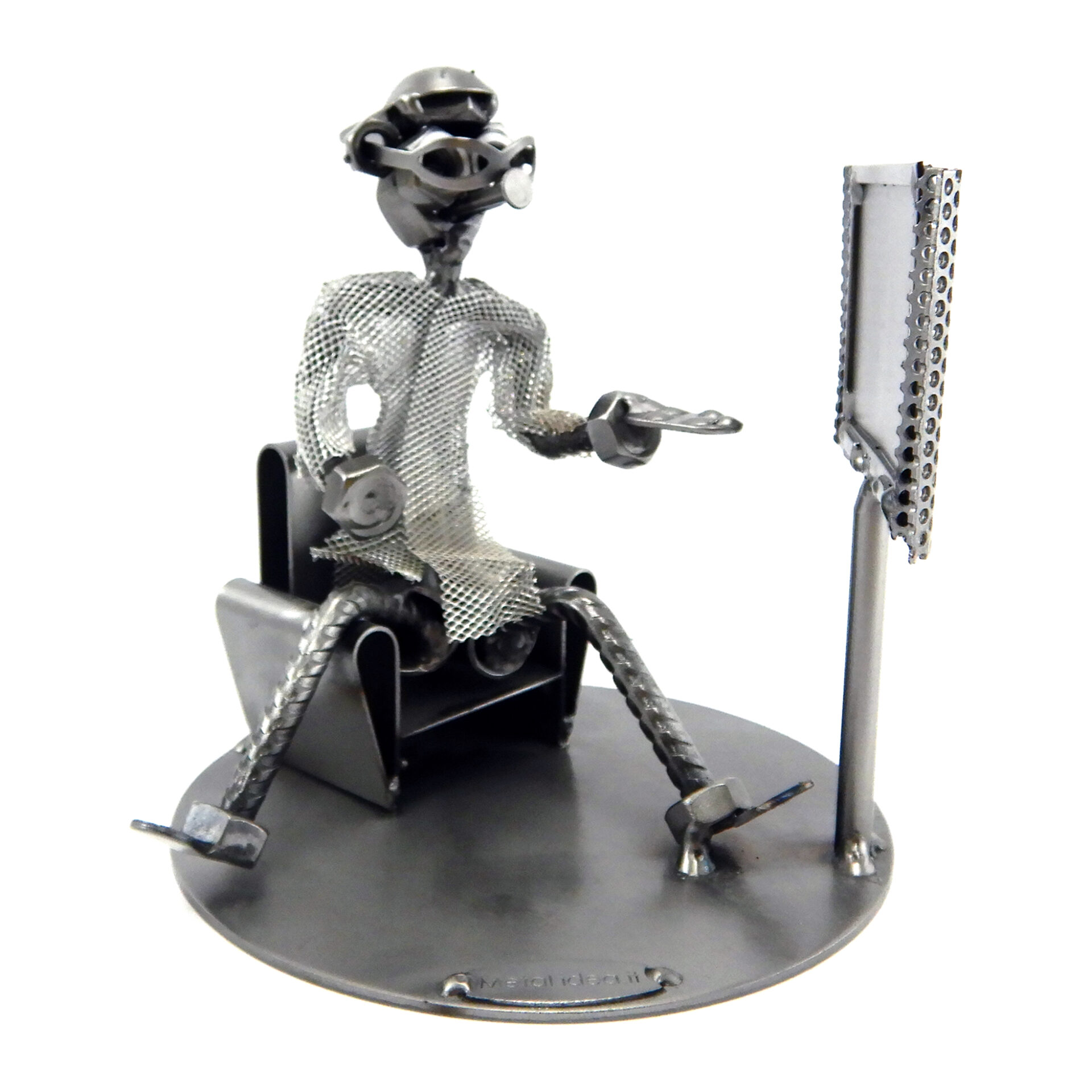 SCULTURA IN METALLO ARTIGIANALE RAFFIGURANTE IL TV DIPENDENTE, PENSIONATO, NULLAFACENTE SEDUTO IN POLTRONA CON TELECOMANDO IN MANO