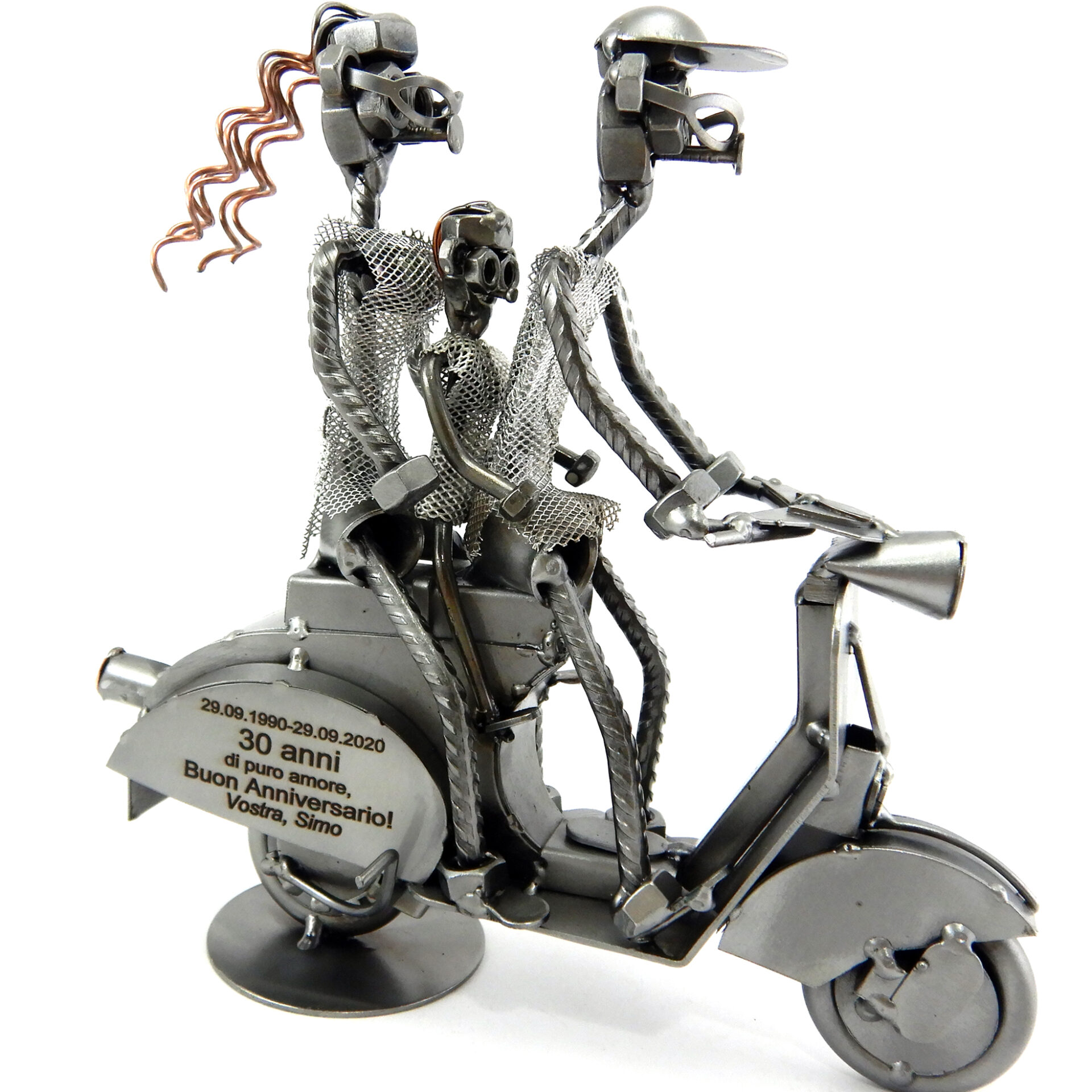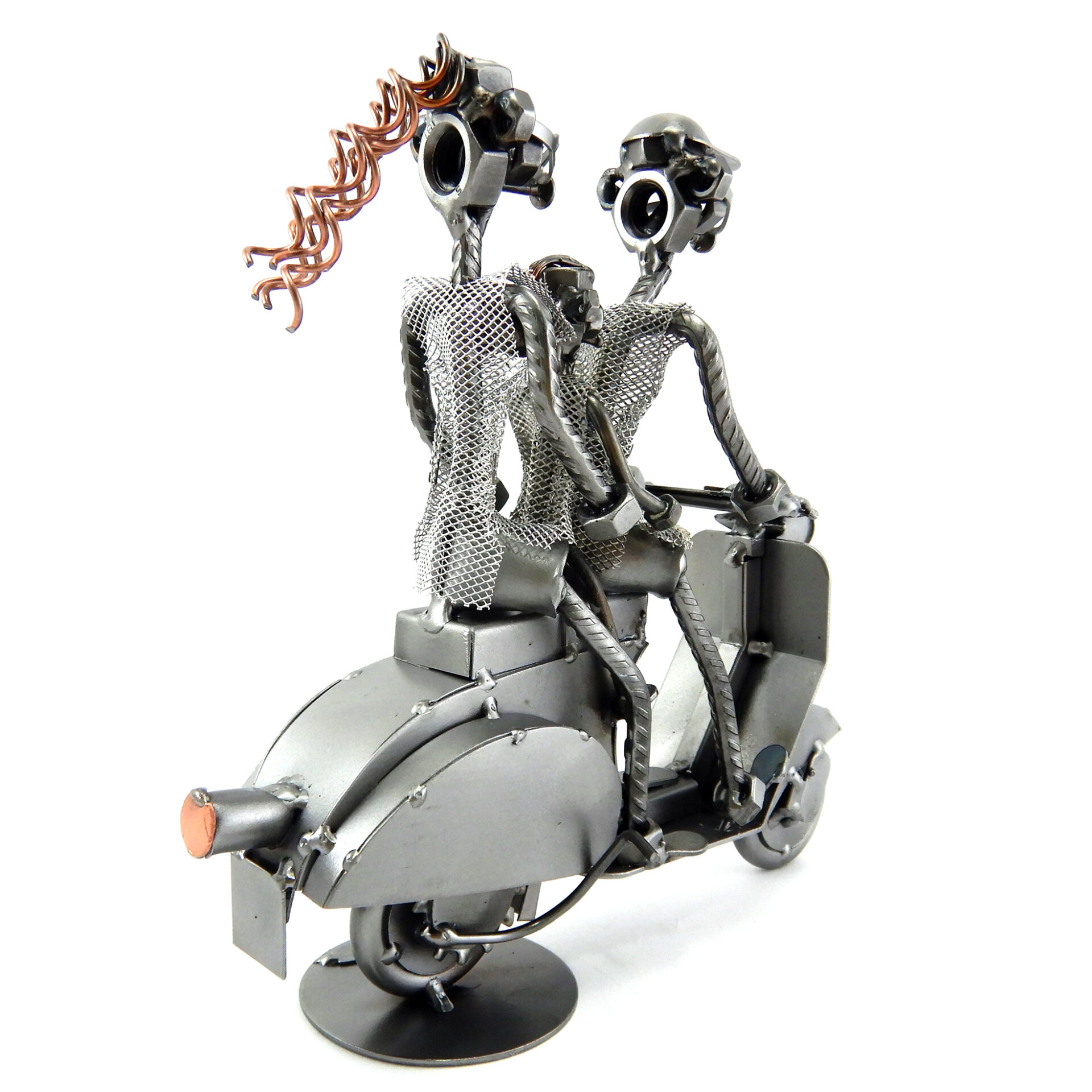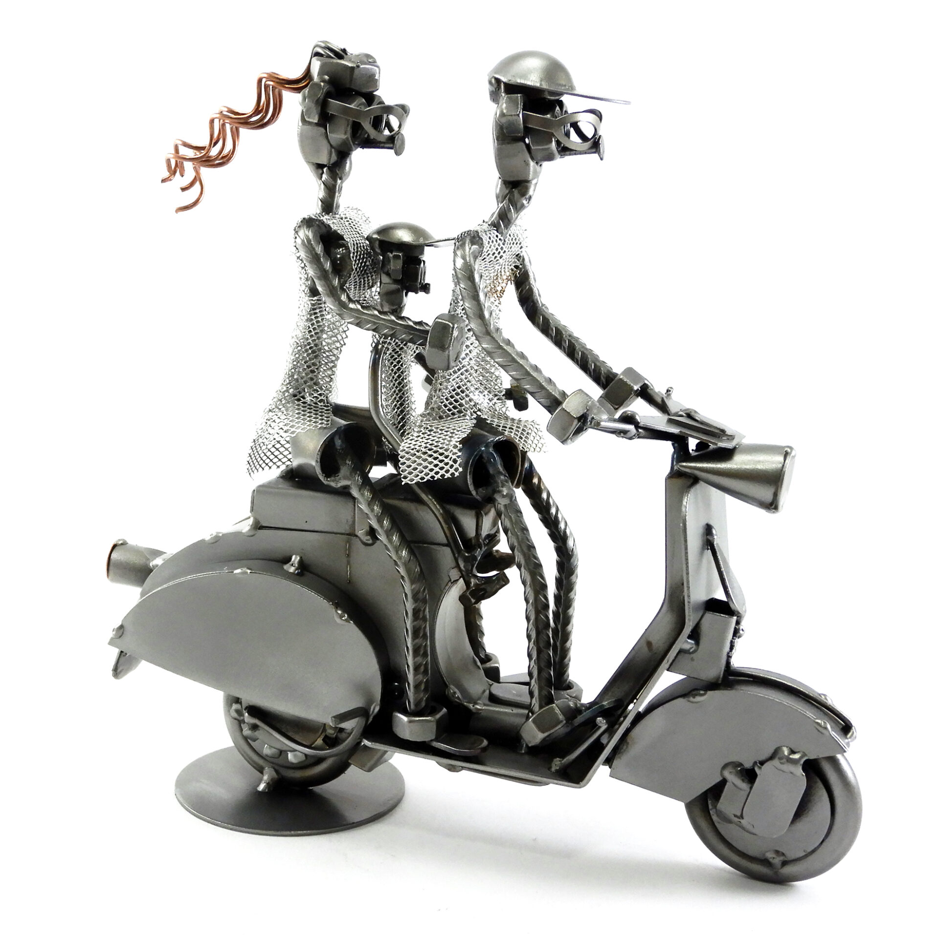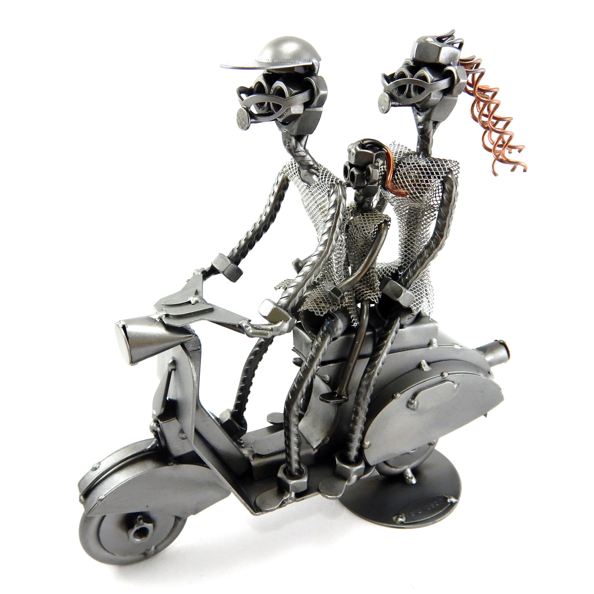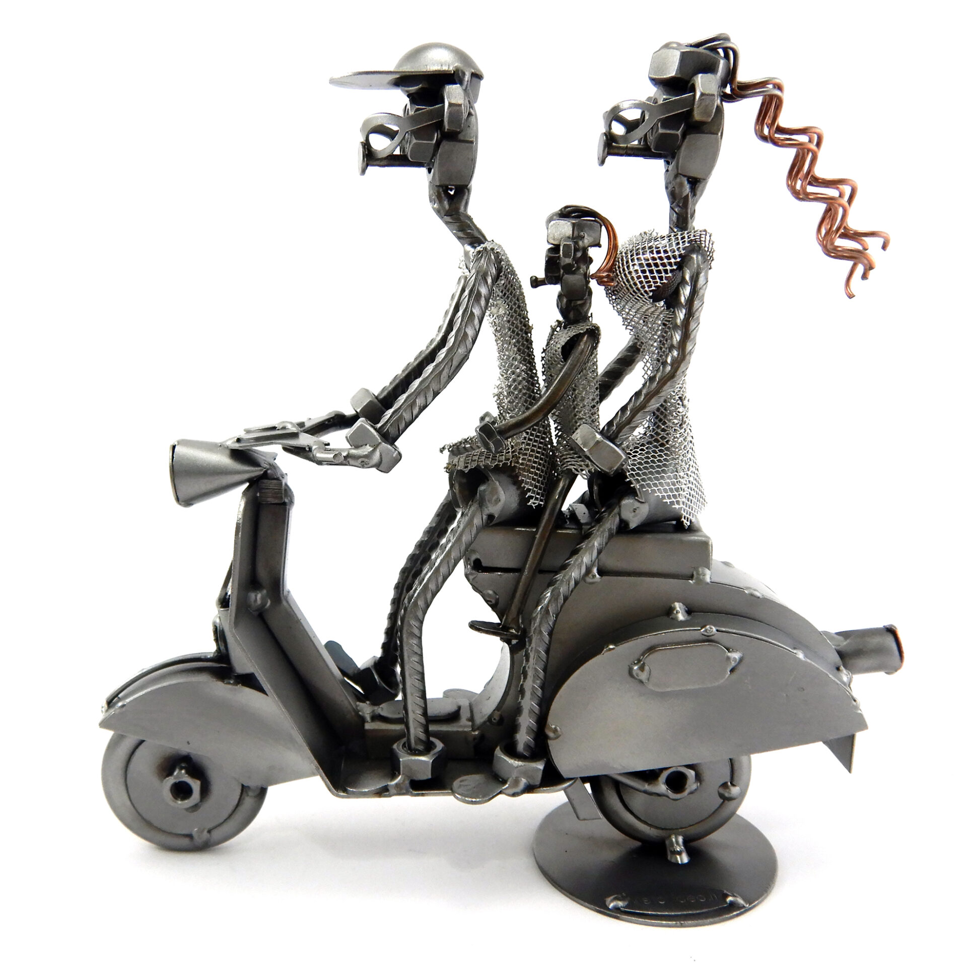 SCULTURA IN METALLO ARTIGIANALE RAFFIGURANTE IL CICLOMOTORE VESPA CON FAMIGLIA BAMBINA IN MEZZO, disponibile anche nella versione senza personaggio, con solo l’uomo oppure coppia!