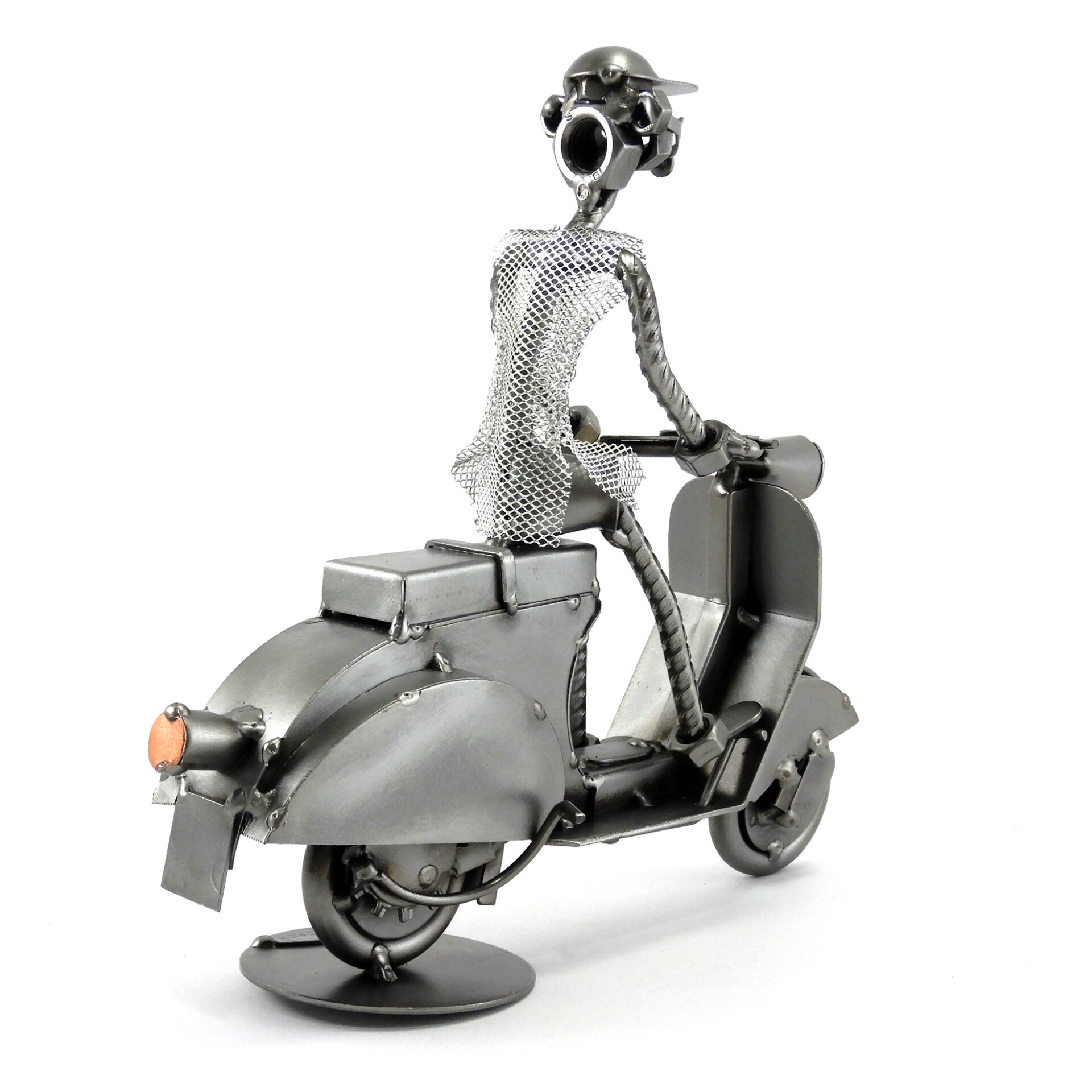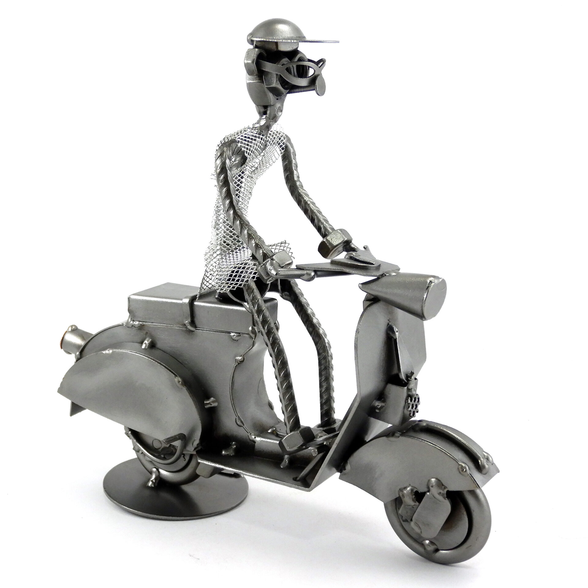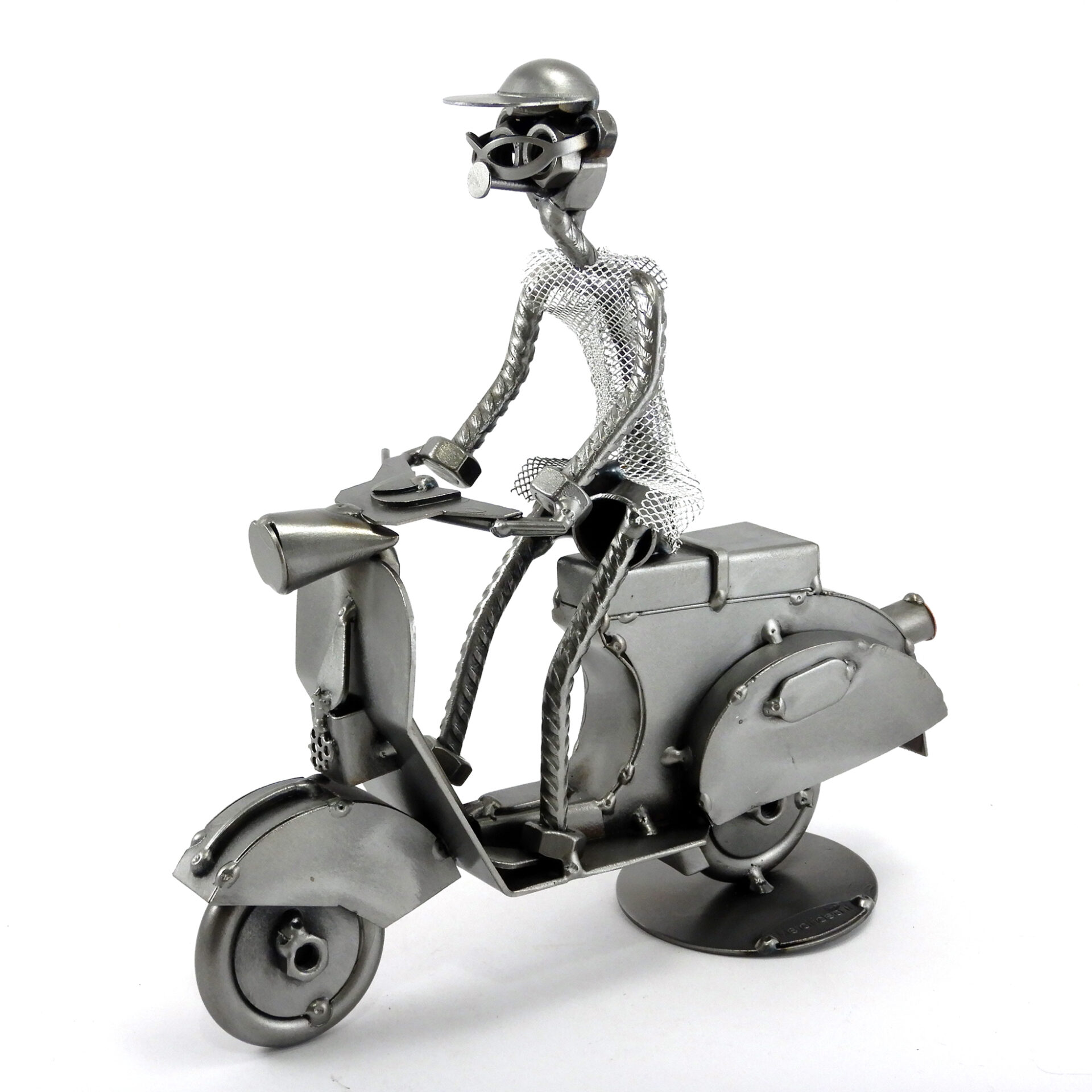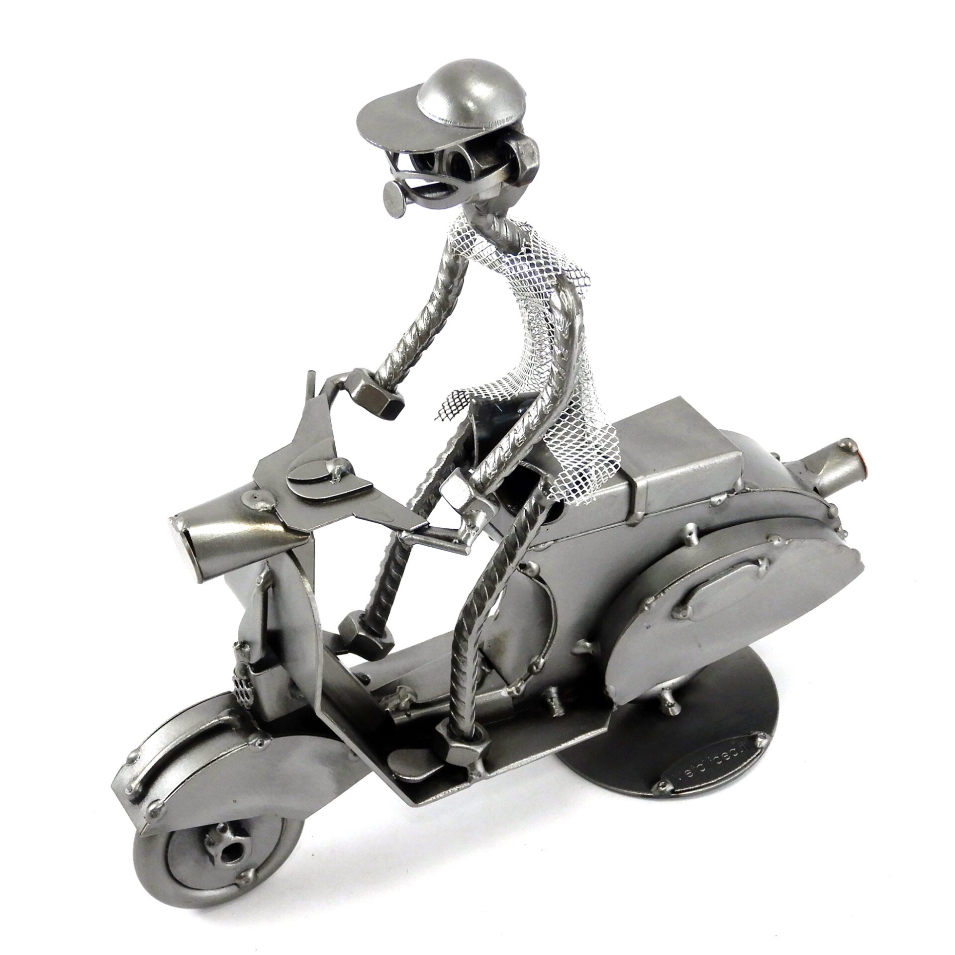 SCULTURA IN METALLO ARTIGIANALE RAFFIGURANTE IL CICLOMOTORE VESPA CON GUIDATORE, disponibile anche nella versione senza personaggio, con coppia o su richiesta con famiglia!
